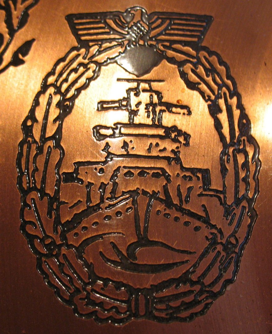 В качестве иллюстрации к закону о денацификации от 1957 года и в тему Кригсмарине : у меня есть памятная тарелка 2001 года со слёта ветеранов КМ ... Так вот, там наглядно продемонстрирован этот самый закон - как видно, все регалии и знаки отражены, но все свастики на них заретушированы или убраны.