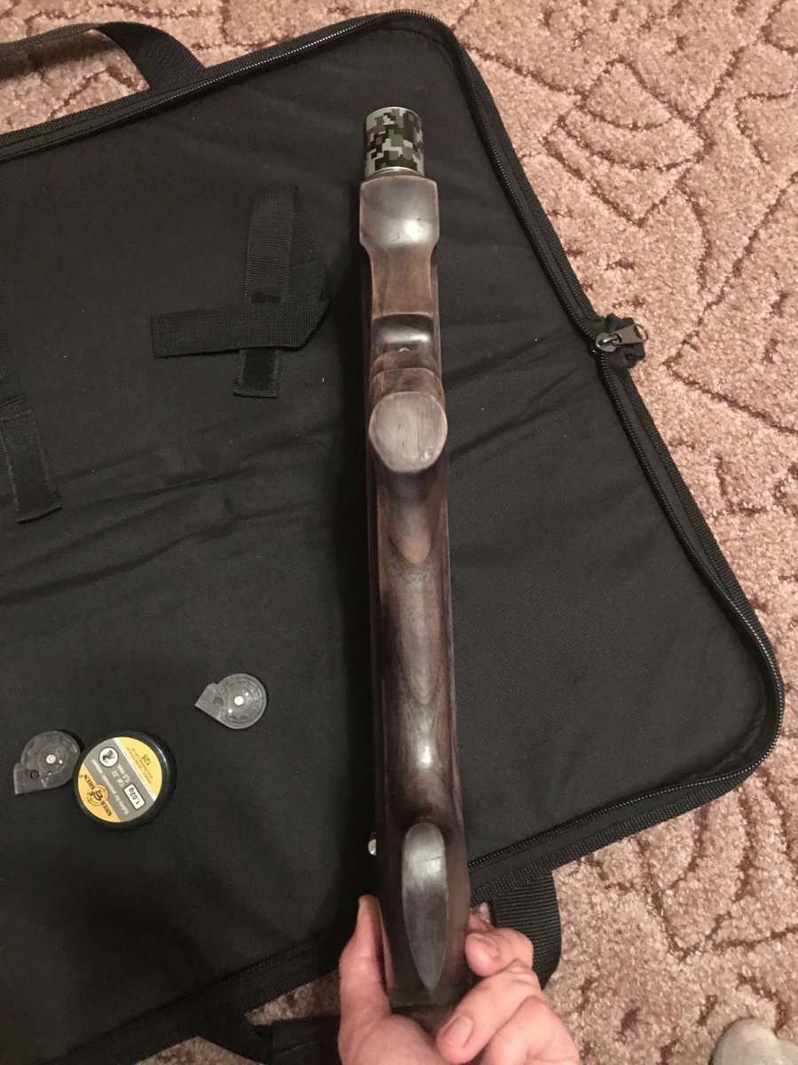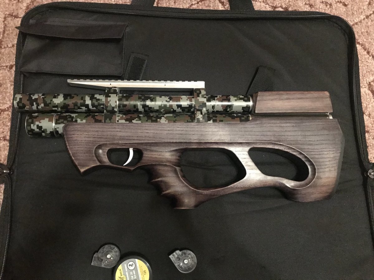Отличная коротышка для хулиганства. Многозарядная, под марабан. Взвод биатлонный. Спуск мягкий (регулируемый) от Алмаза. Резик 190куб.см р250 п400. Стволик 5,5 300мм, стальной. Перенос оптики Вивер. Дерево и щека ясень от Магикона. Интегрированный модер справляется отлично. С заправки 40 полноценных выстрелов с 235 до 155атм. Вес без прицела где-то 2,8кг. Винтовка очень компактная, от края тыльника до края модера всего 53см. Удобно применять из авто.