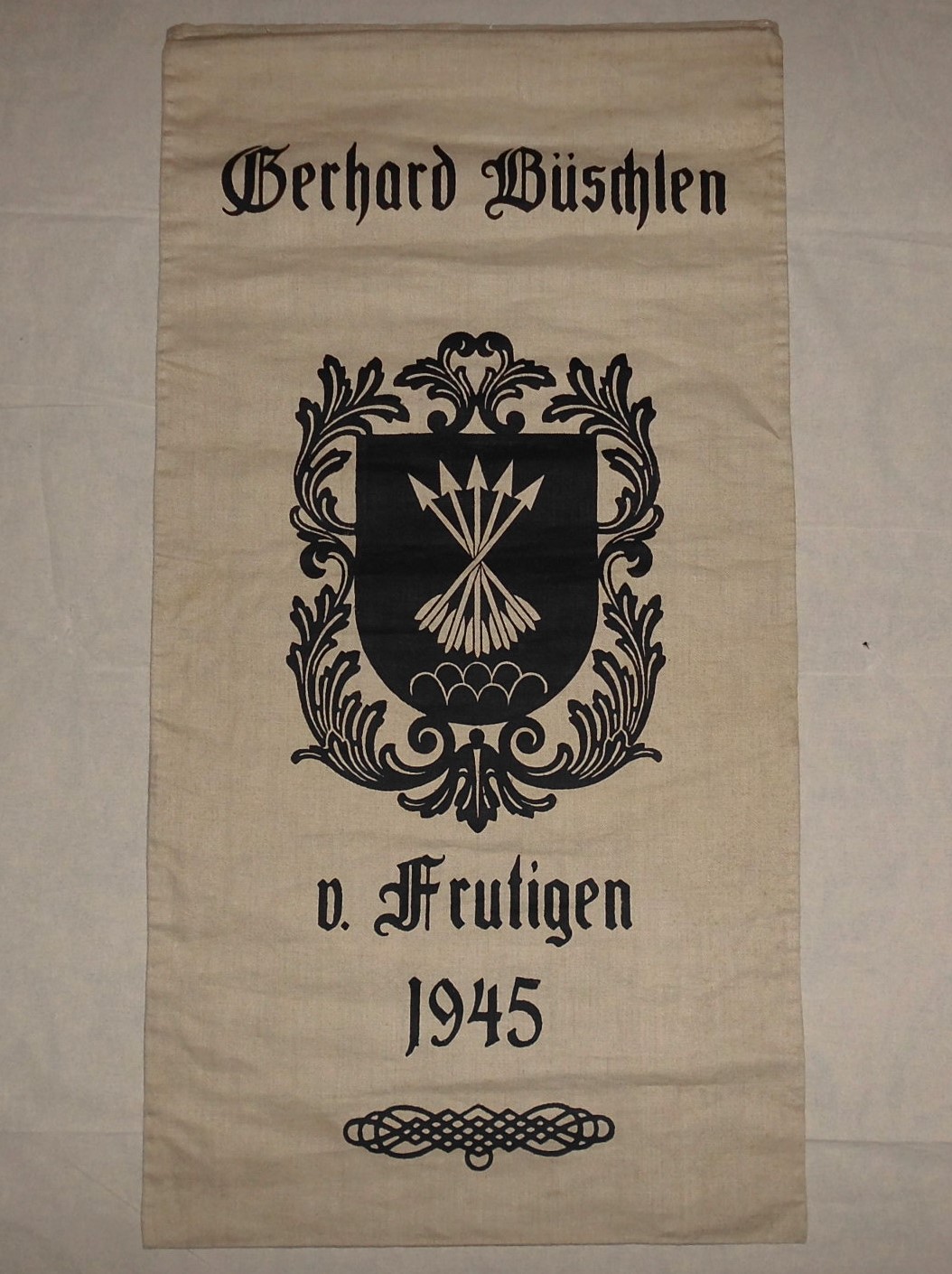 Вітаю. Цікавить інформація по мішку, на якому зображений герб з 5-ма стрілами та написи, якщо вірно прочитав: Gerhard Büschlen o. Frutigen (є така громада в Швейцарії) 1945 (напевно рік заснування, чи можливо рік виготовлення??) полотно якісне важке та щільне (схоже на лляне) розмір мішка 57х110 см стан ідеальний (новий). Дякую всім учасникам!