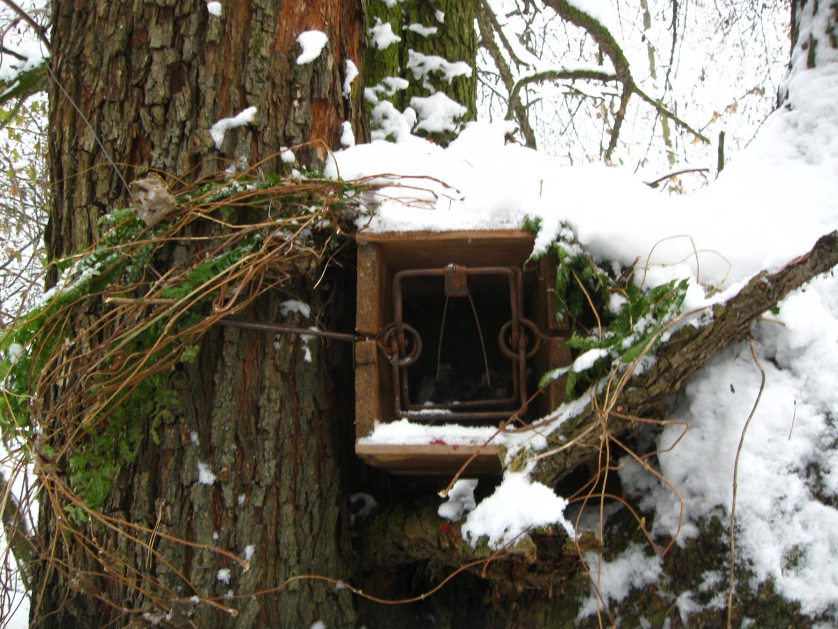 В Беличанском лесу видел такое в 2016 году неоднократно. Таким образом браконьеры ловят в капканы куниц: Задолбался я их снимать. На четвёртом капкане бракоша понял, что дело - табак, и попустился. Увидите в лесу подвешенную птицу, шукайте рядом капкан. Иногда они используют и такие устройства для лова, в качестве приманки - птица: Вообщем, берегите природу...