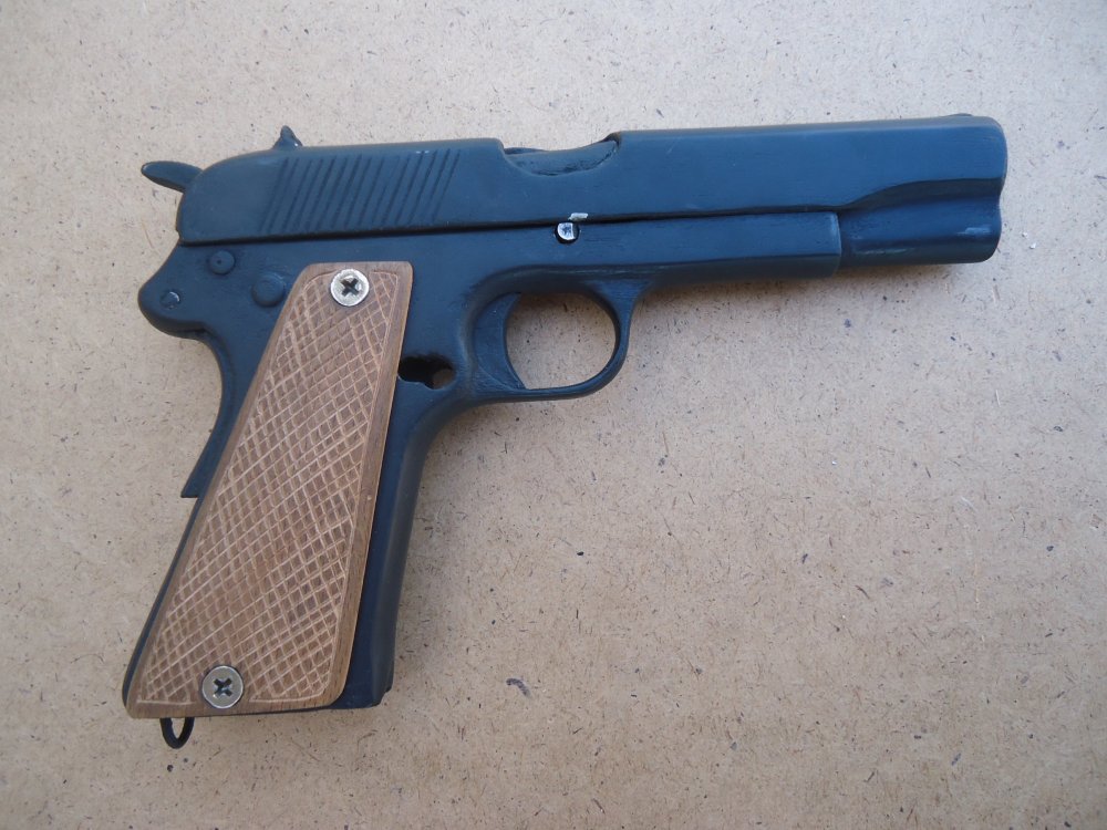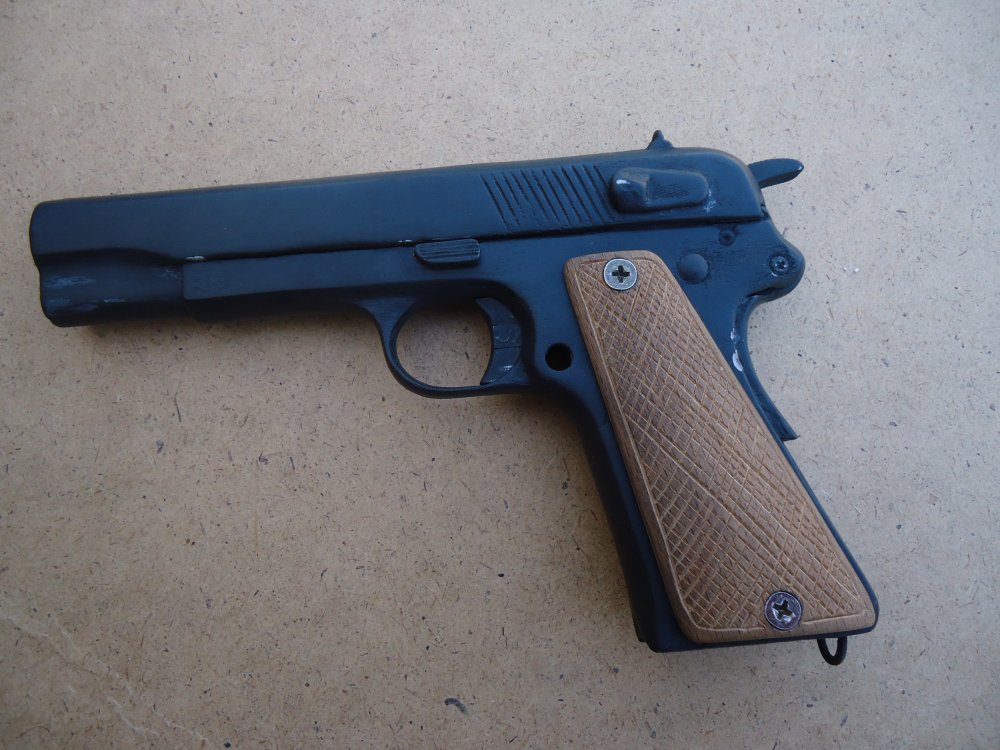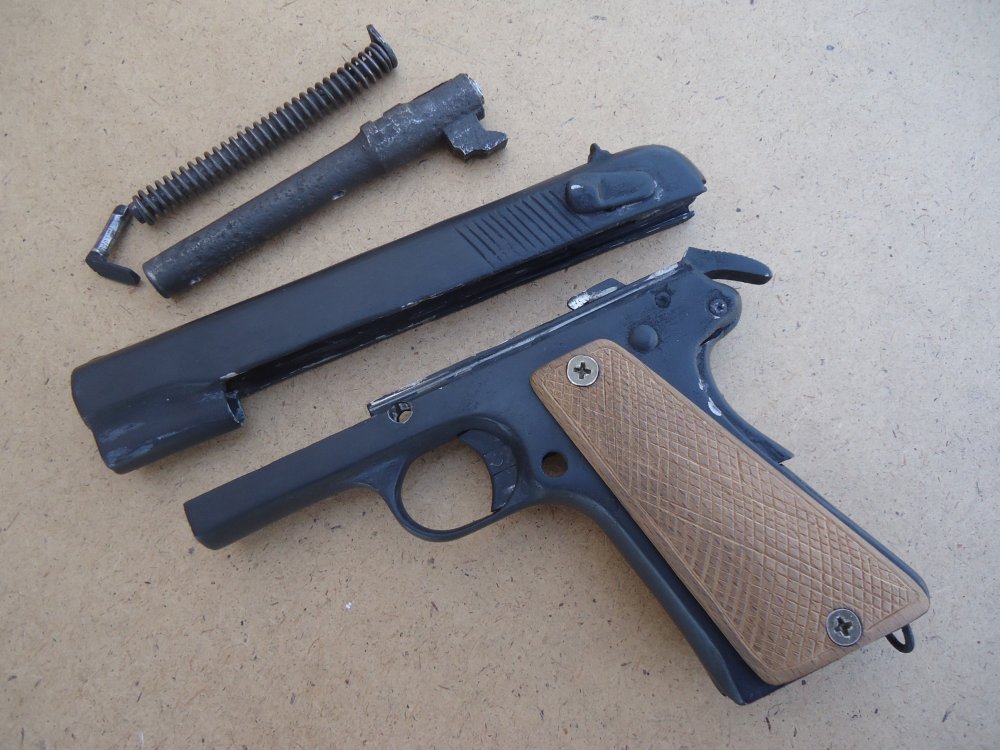 Курок похож на Кольтовский М1911 г. , отсутствует флажковый предохранитель, вообще из-за толщины у копаных отламывается или теряется. Затворная задержка частично отломана и вставлена на 180 град. Пистолет очень редкий и желанный коллекционерам. Классный экземпляр!