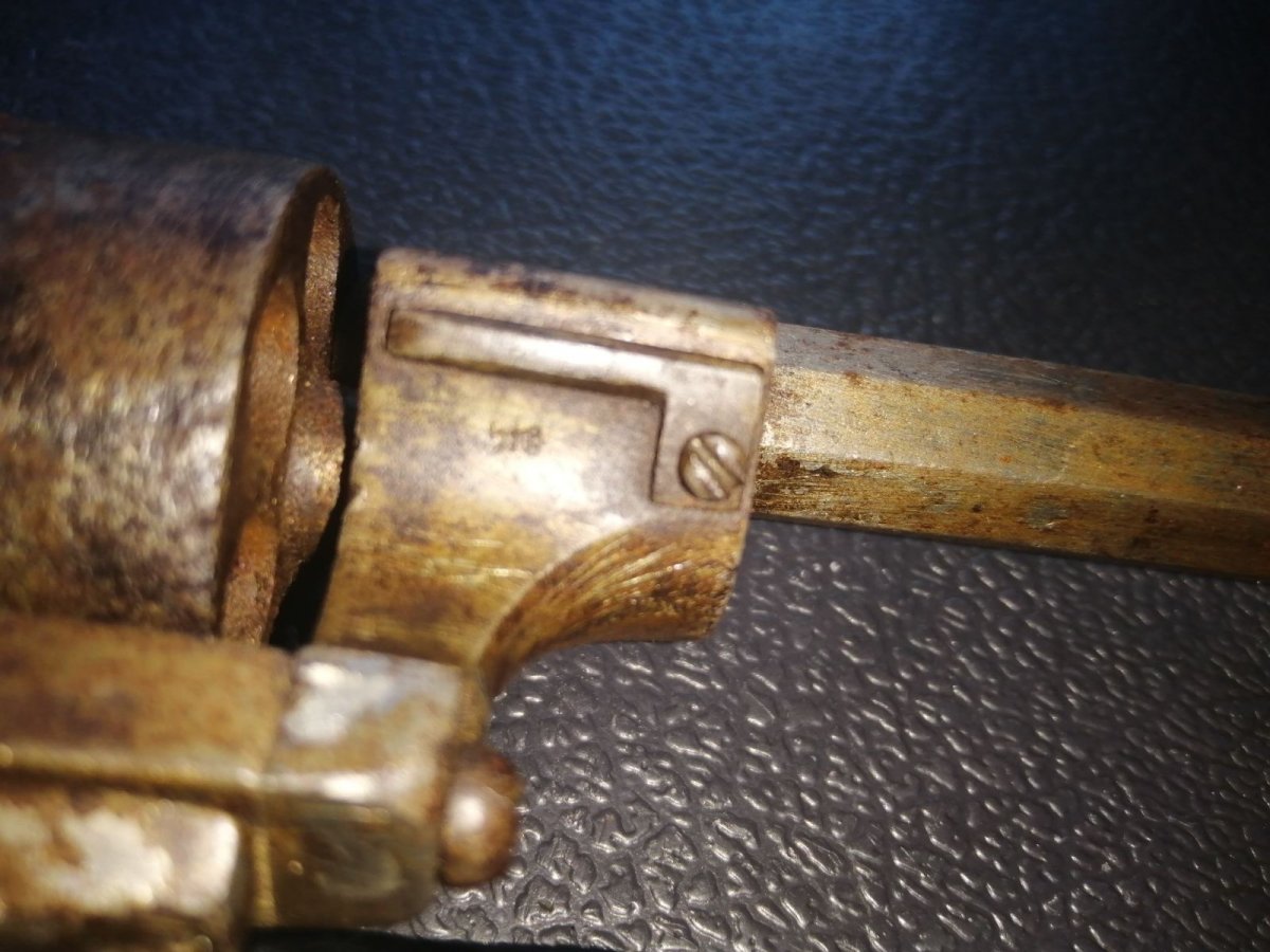 так один з оригінальних бельгійських не дуже якісних револьвертів Лефоша , але маю питання - по клейму на барабані то беззаперечно Льєж Бельгія , рік тож зрозуміло - до 1877 , нижнє клеймо - тут питання , має скобу , також в широкому вжитку були восьмигранні стволи - а тут ( якщо я правильно бачу ) ствол шестигранний що доволі рідше використовувався , нікель обліз або його обдерли а сохран більш-менш ... Тож майже впевнений шо це таки перший з рядових франкотів , але можу помилятись