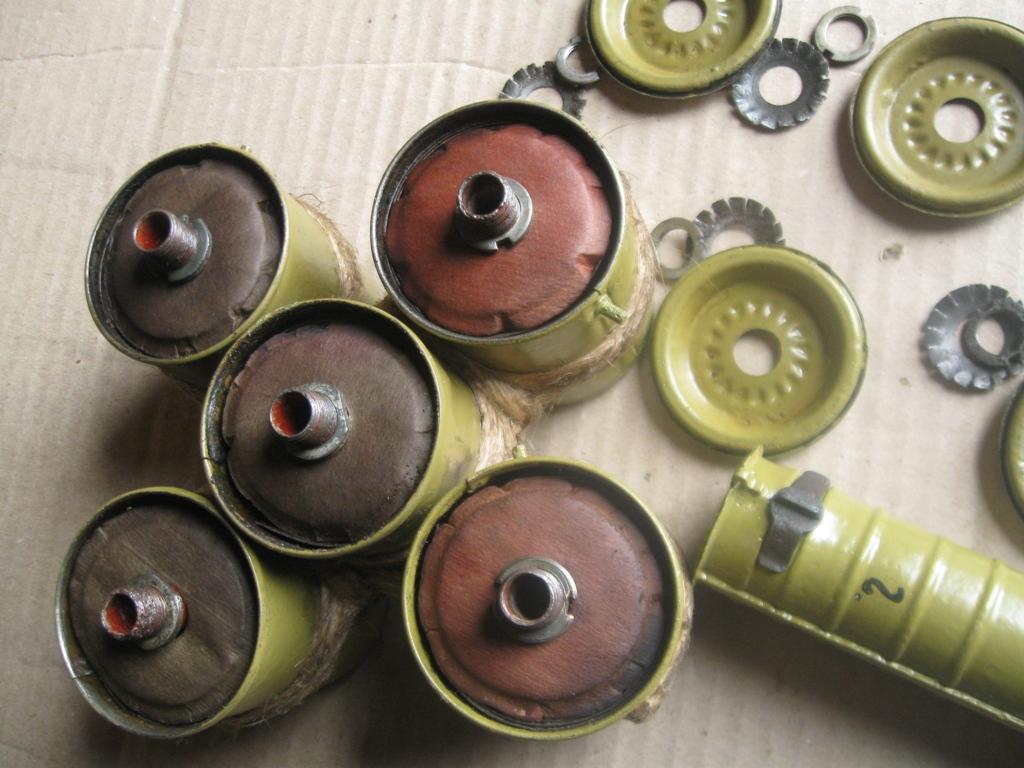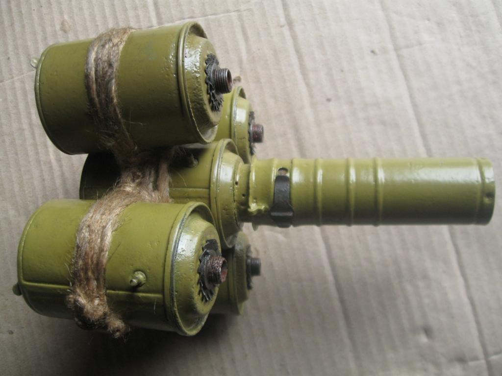 Лот №14. Противотанковый вариант из 5 РГД-33. Банки связаны льняным шпагатом, очень прочно- не болтаются. Всё функционально, полностью разбирается, ручка робочая. В руках смотрится очень внушительно! цена 800 грн. Хороший образец в коллекцию.