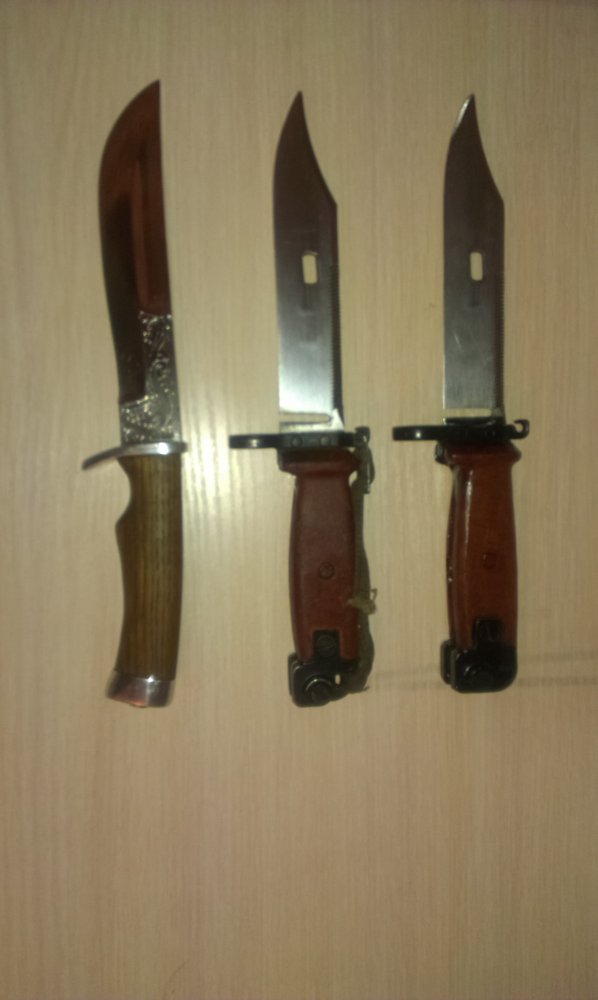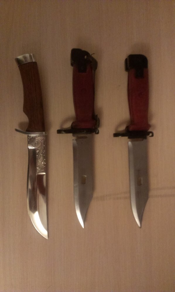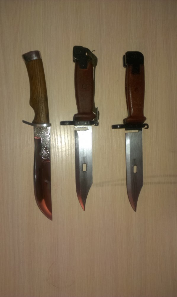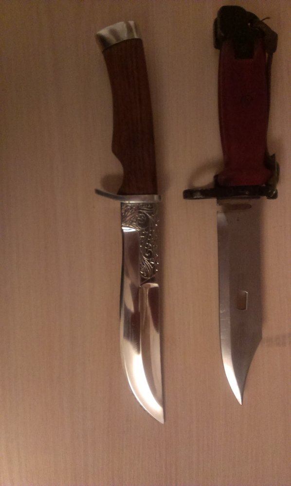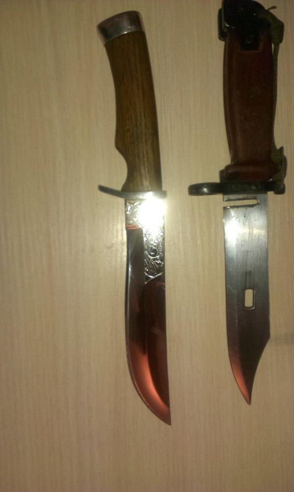 Продам штык-нож и нож туристический или (охотничий) как кому удобней.Цена ш/н 170 грн, Цена туристического ножа 150 грн. Нож имеет толщину обуха 2,5 мм.Твердость стали не соответствует критериям для Х.О. ,так же как и угол заточки острия ножа.Конечно гвозди рубать он не будет но консервную банку вскрыть и порезать хлеб в самый раз.Цена за весь лот 400грн