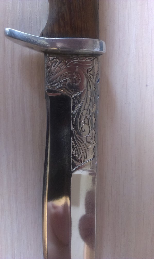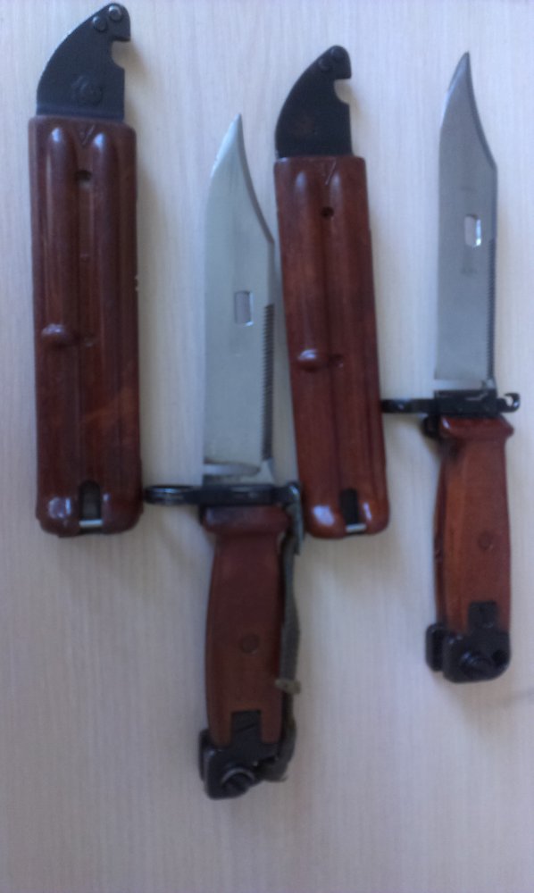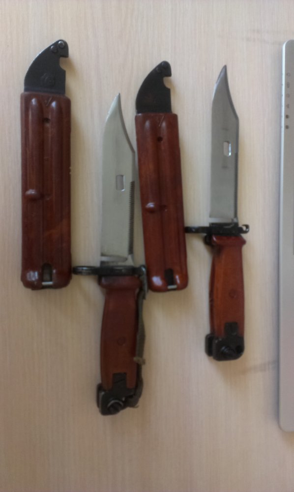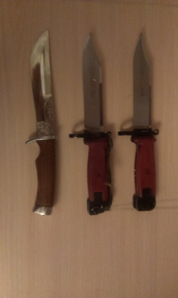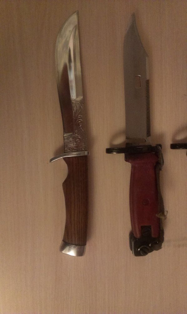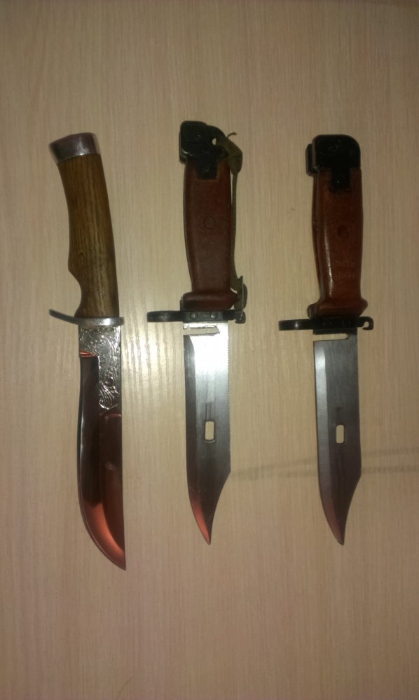 Продам штык-нож и нож туристический или (охотничий) как кому удобней.Цена ш/н 170 грн, Цена туристического ножа 150 грн. Нож имеет толщину обуха 2,5 мм.Твердость стали не соответствует критериям для Х.О. ,так же как и угол заточки острия ножа.Конечно гвозди рубать он не будет но консервную банку вскрыть и порезать хлеб в самый раз.Цена за весь лот 400грн
