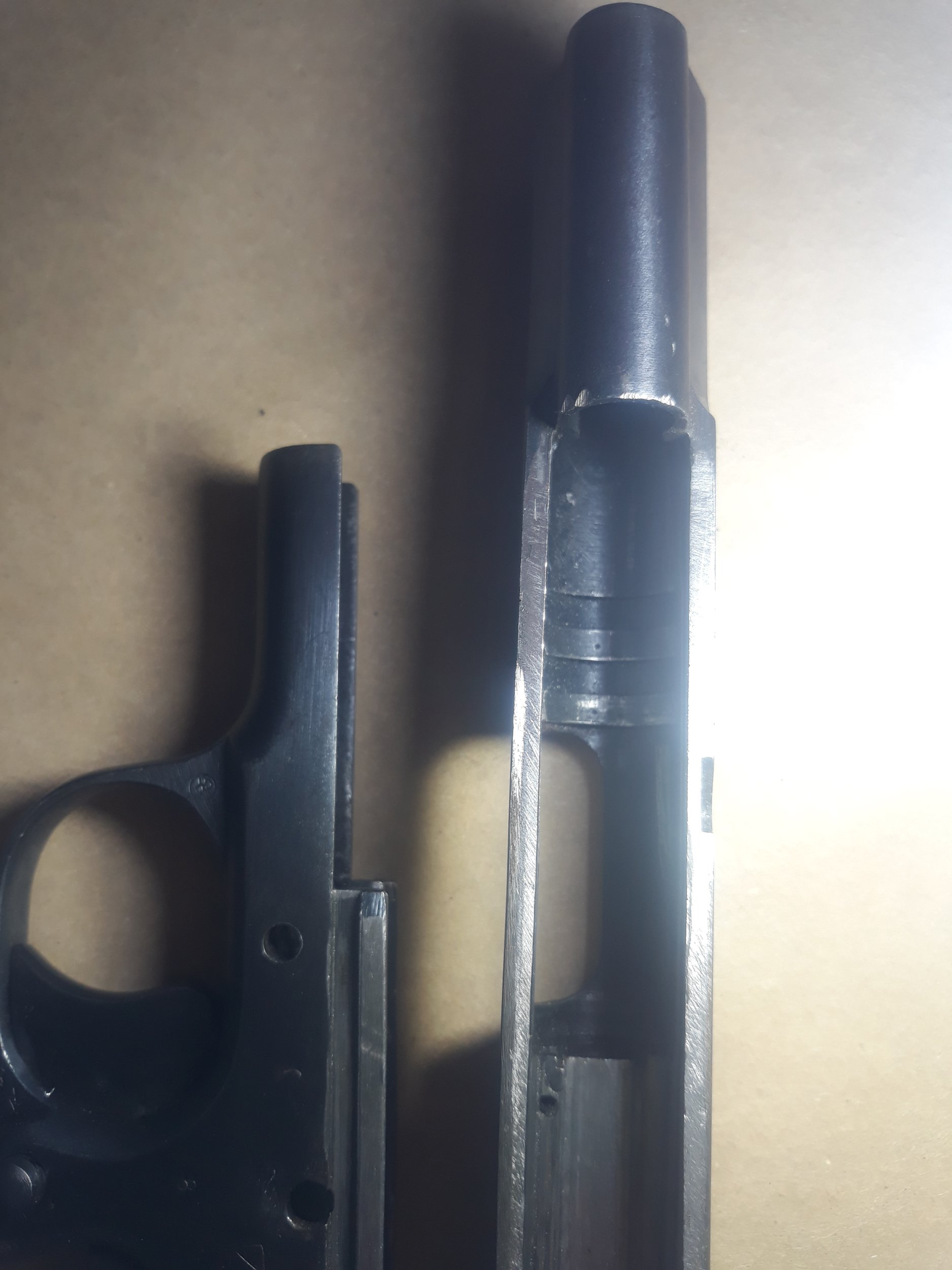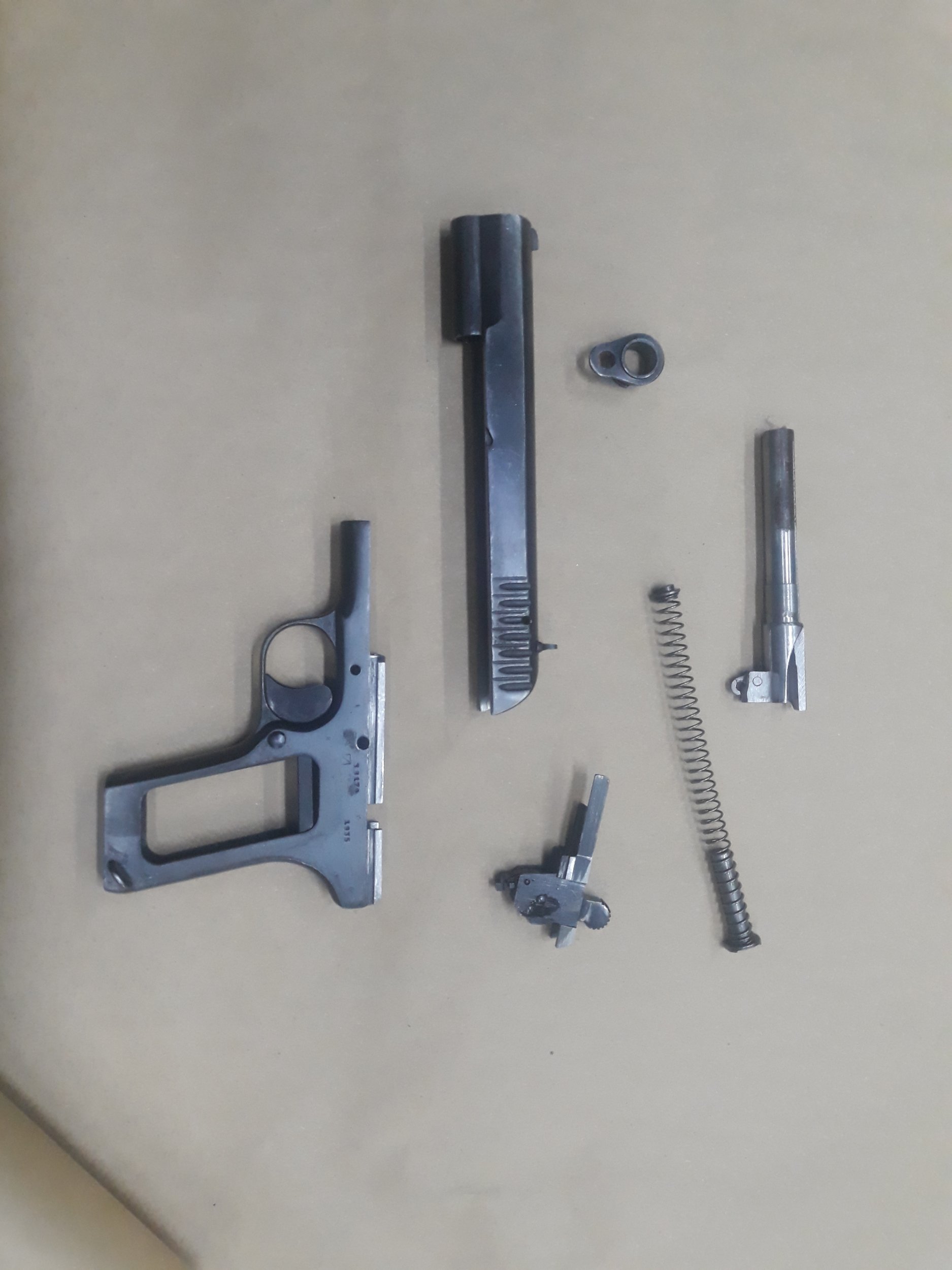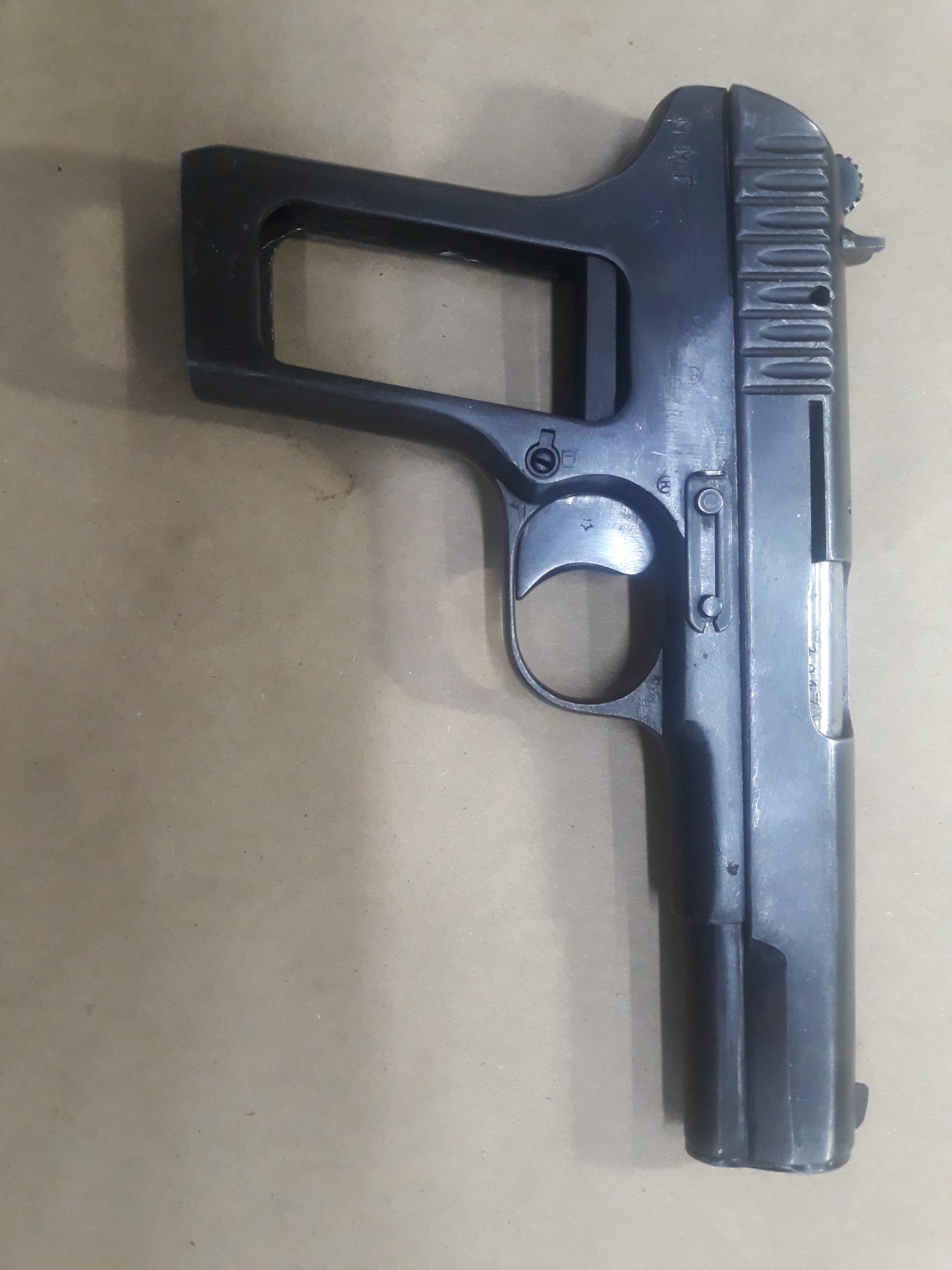 5. ММГ ТТ 1943 год. Рама и затвор на одном номере. Деактив вроде УОС. Срезан подаватель затвора, фрезерована горка подачи, корпус усм целый, кольца фрезарованы, но только в нижней части, по бокам целые и функцию зацепа выполняют, в грамотных руках можно довести до ума. Скол на правой накладке.