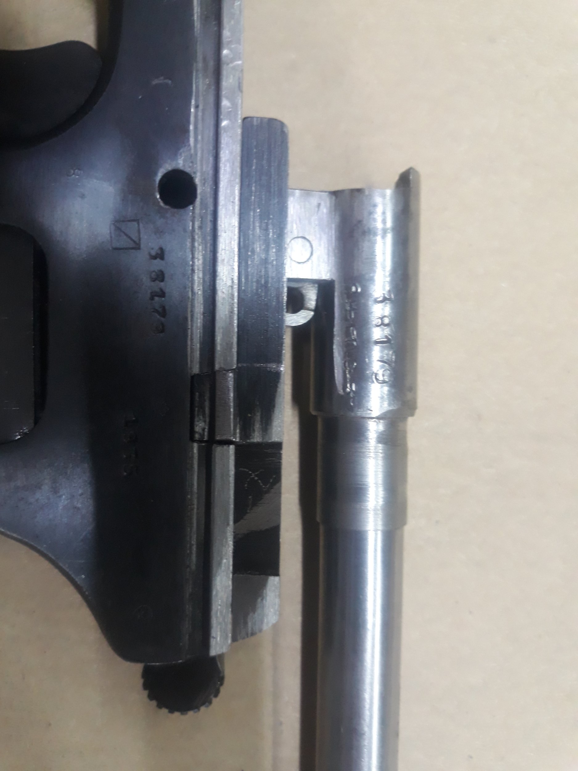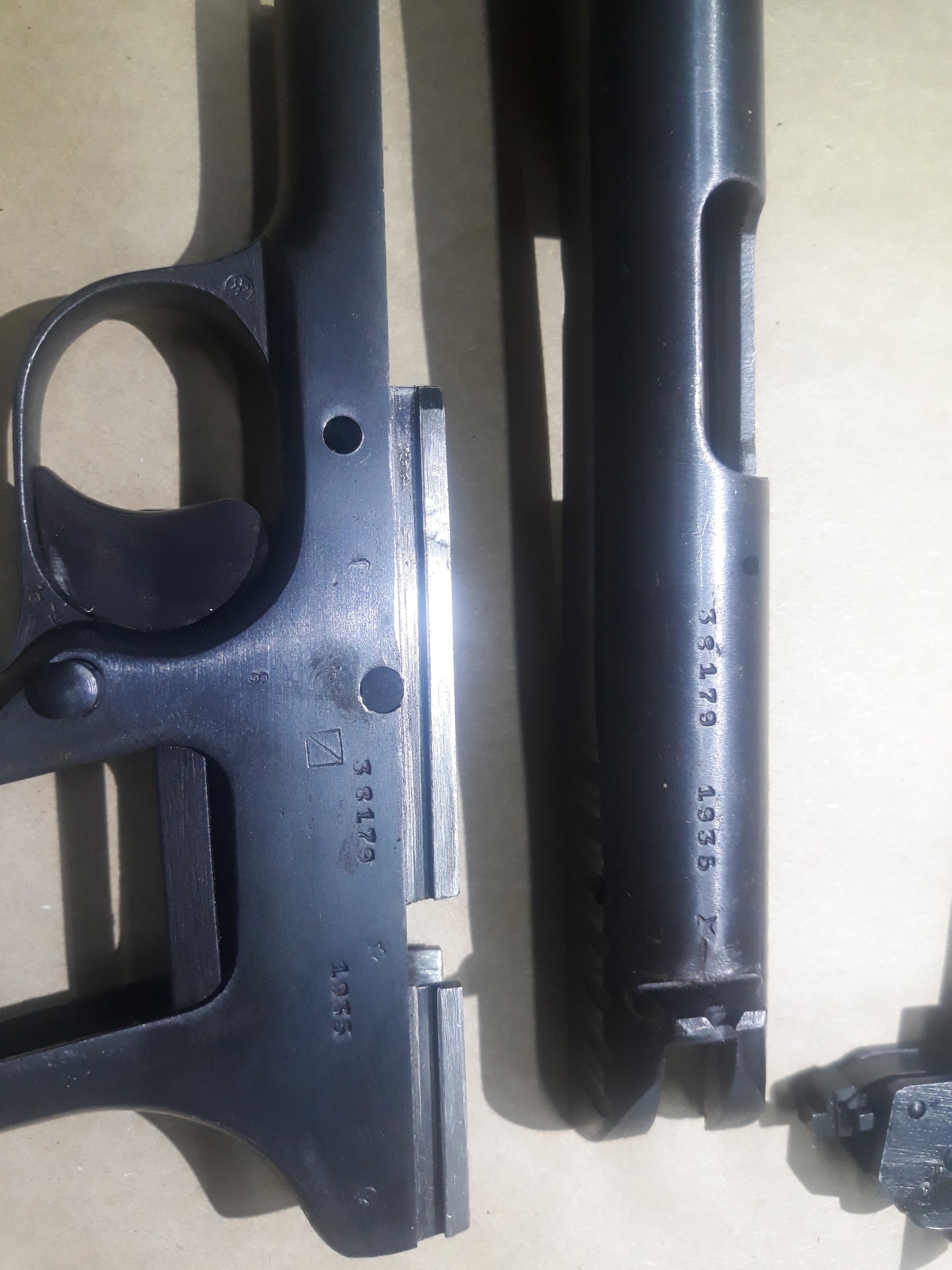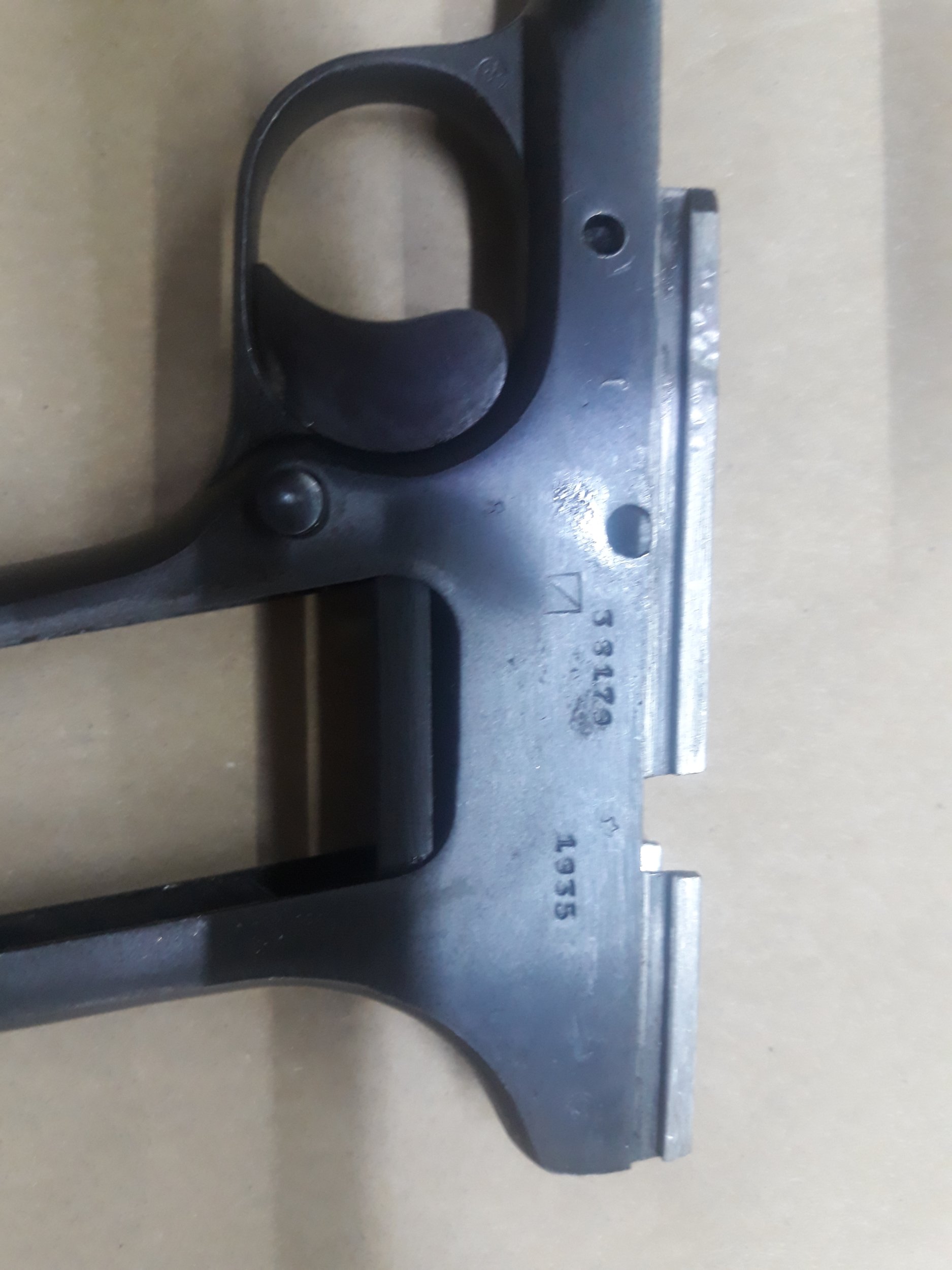 1935 год, на одном номере, ствол, что удивительно, тоже на одном номере. Усм целый. Подающая часть затвора полностью убрана. Кольца на месте. Нижняя рамка без измененений. Макет будет до укомплектован накладками и целым магазином. Ствол разрезан вдоль и распилен патронник.