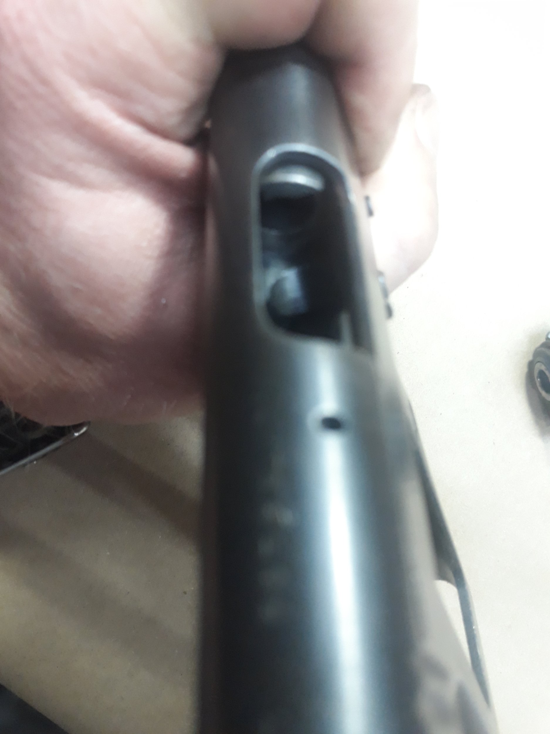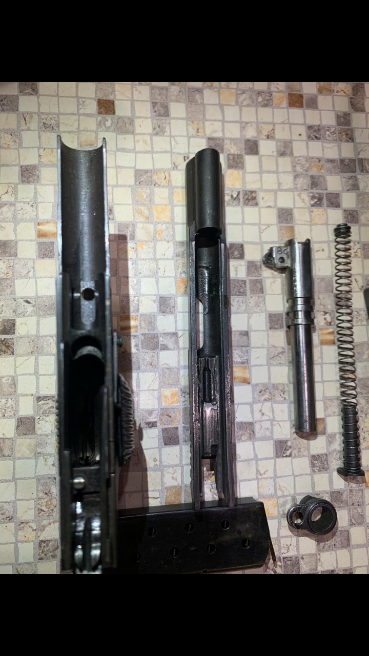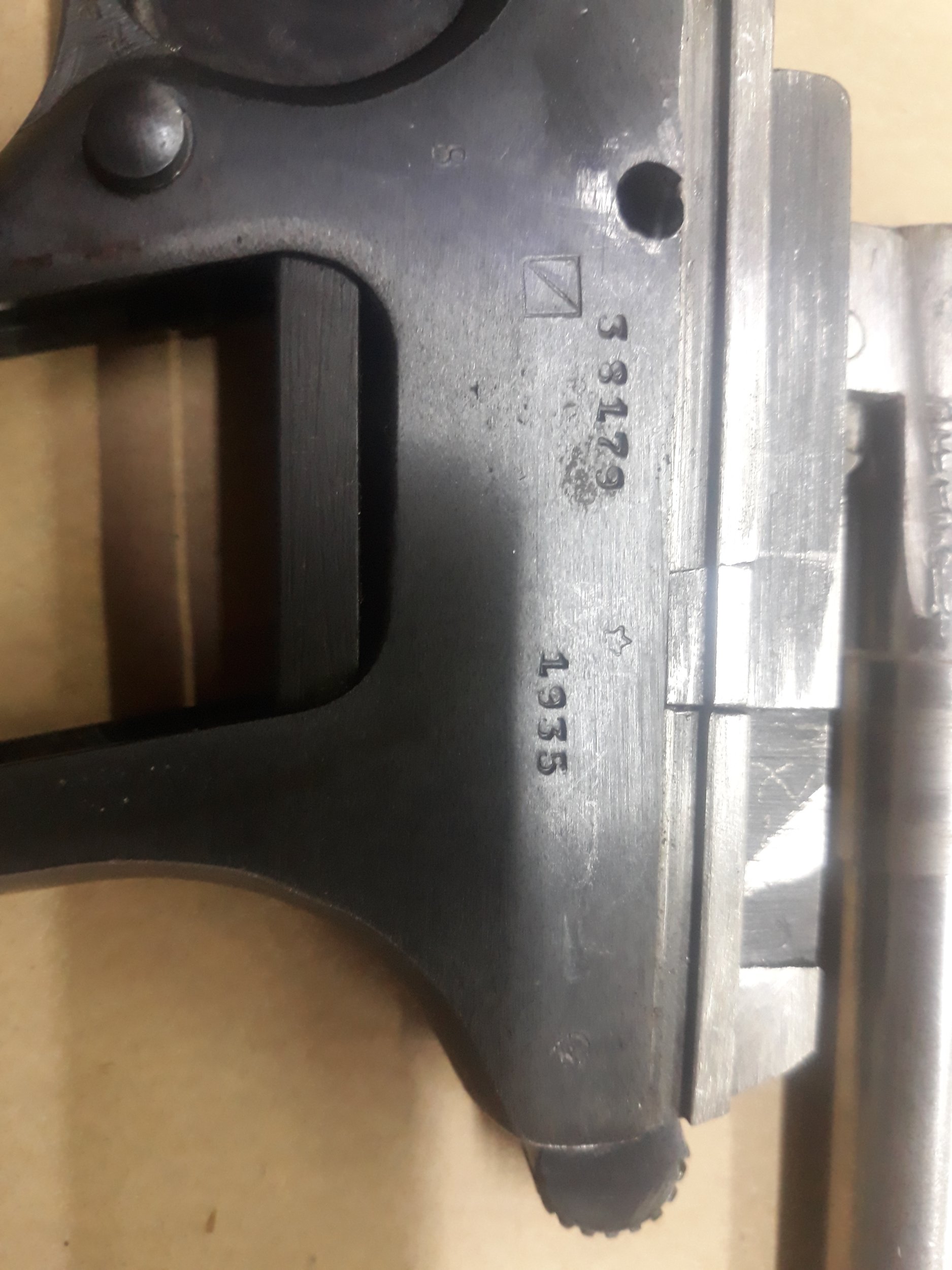 1935 год, на одном номере, ствол, что удивительно, тоже на одном номере. Усм целый. Подающая часть затвора полностью убрана. Кольца на месте. Нижняя рамка без измененений. Макет будет до укомплектован накладками и целым магазином. Ствол разрезан вдоль и распилен патронник.