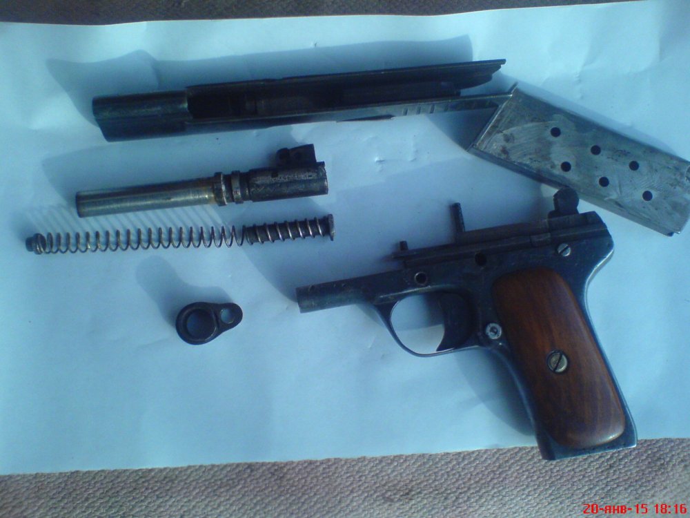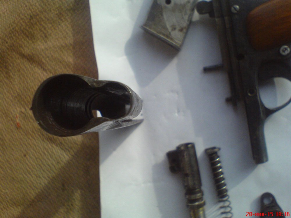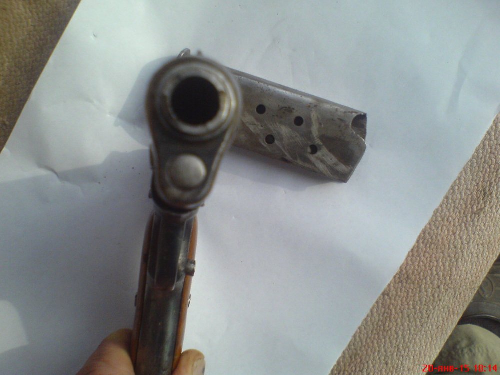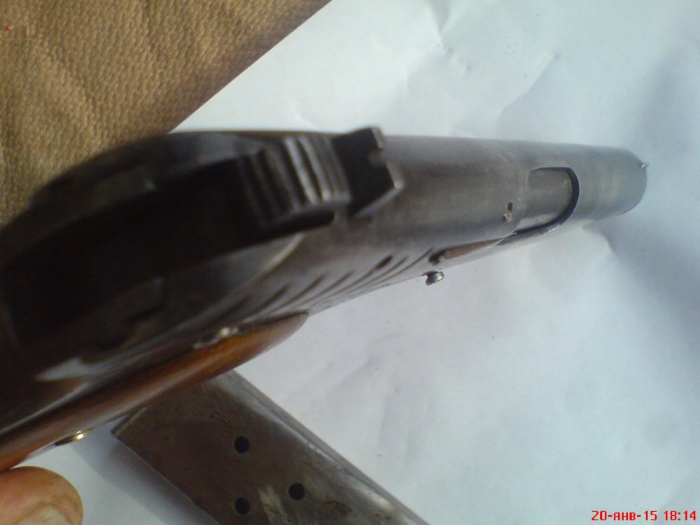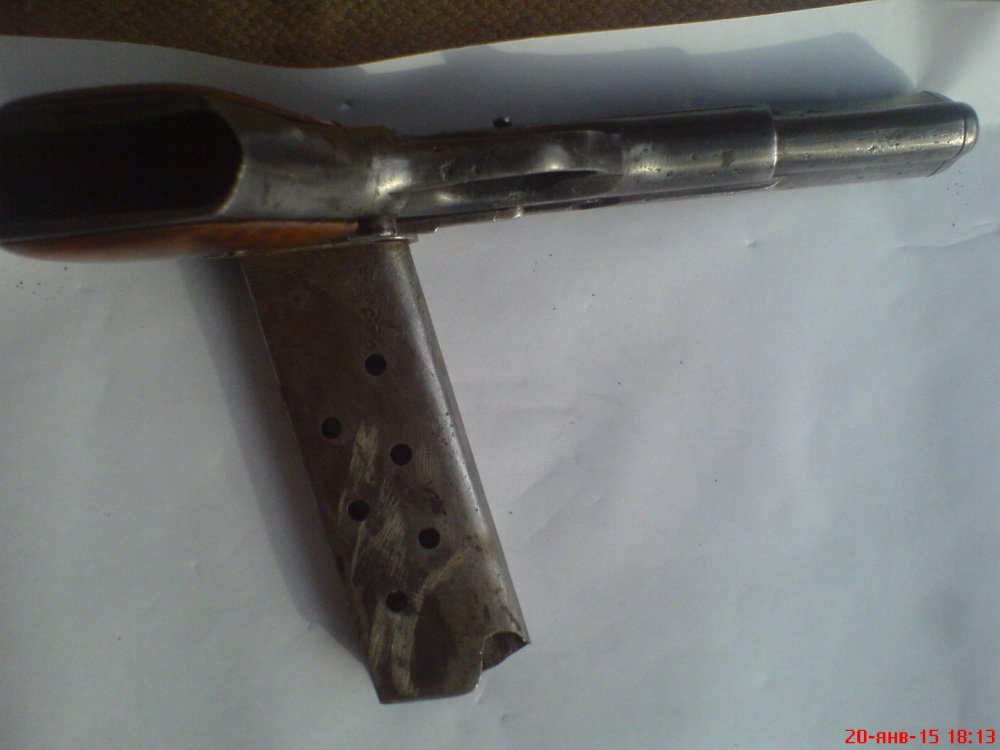 Уважаемые форумчане, помогите оценить данный девайс найденный на чердаке. Покупал только муляжный стволик.Отсутствует родная задержка автоспуска с замком. Всё работает без всяких трудностей и перекосов. Накладки рукоятки держатся крепко на пропаянных пластинках, можно убрать и поставить родные. Магазин без пружины и подавателя.Отсечка, кнопка магазина, УСМ,- всё работает безупречно.Клейм и номеров не видел.Трещин, сколов,раковин,- нет