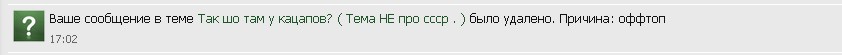 Не те, щоб вкарай "нєнравіца", але: В Курилці у темі "про кацапів" розмістив із своїми коментарями таку картинку: Прошу звернути увагу, що ресурс звідкіля узято: "lenta.ru" - чисто кацапський. Коментар цієї "новини" теж кацапський: "всєх запугать" і, тому, по кацапському дєбільний: "шістнадцять швидкостей світла" - це вже не путинська "гіпєрррр" ракета, це вже тягне на премію "ідіот Всесвіту". Чому і розмістив у вказаній темі. Видалили: З такою трактовкою не згоден! Тим більш мій коментар і торкався саме розумових здібностей мокшів. І це вже не вперший раз, коли тролінг кацапів у вказаній темі, цензурується більш у бік Кацапії, ніж у бік учасників українського національного форуму Reibert. Відповіді на наведене не вимагаю... але вважаю видалення мого повідомлення помилкою і прошу у подальшому уважніше придивлятися до контексту повідомлень у розрізі загального контексту теми. З повагою, Дід Свирид, Oberleutnant