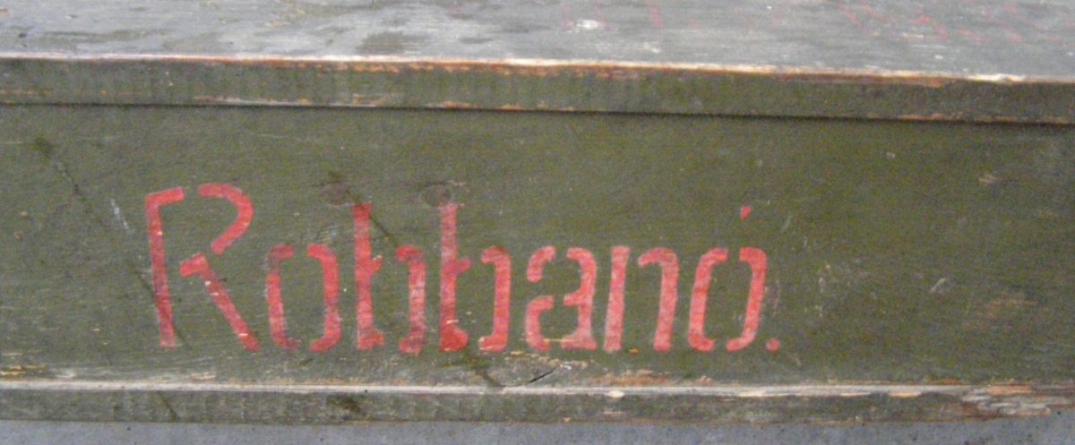 Приветствую.Камрад подсказал перевод с венгерского "Robbano"-Взрывоопасно.Скорее всего-ящик от снарядов или минткрупного калибра.Ройте в этом направлении...Удачи! https://reibert.info/threads/jaschik.285491/#post-3642504