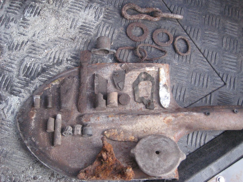 Привет Жень. Вот тесли и топорик.(Почисти посмотри тавро!)А возле тесли, справа вверху кресало.(Но убитое.) Перстенёк 17-18 век. Сфоткай сам щиток.