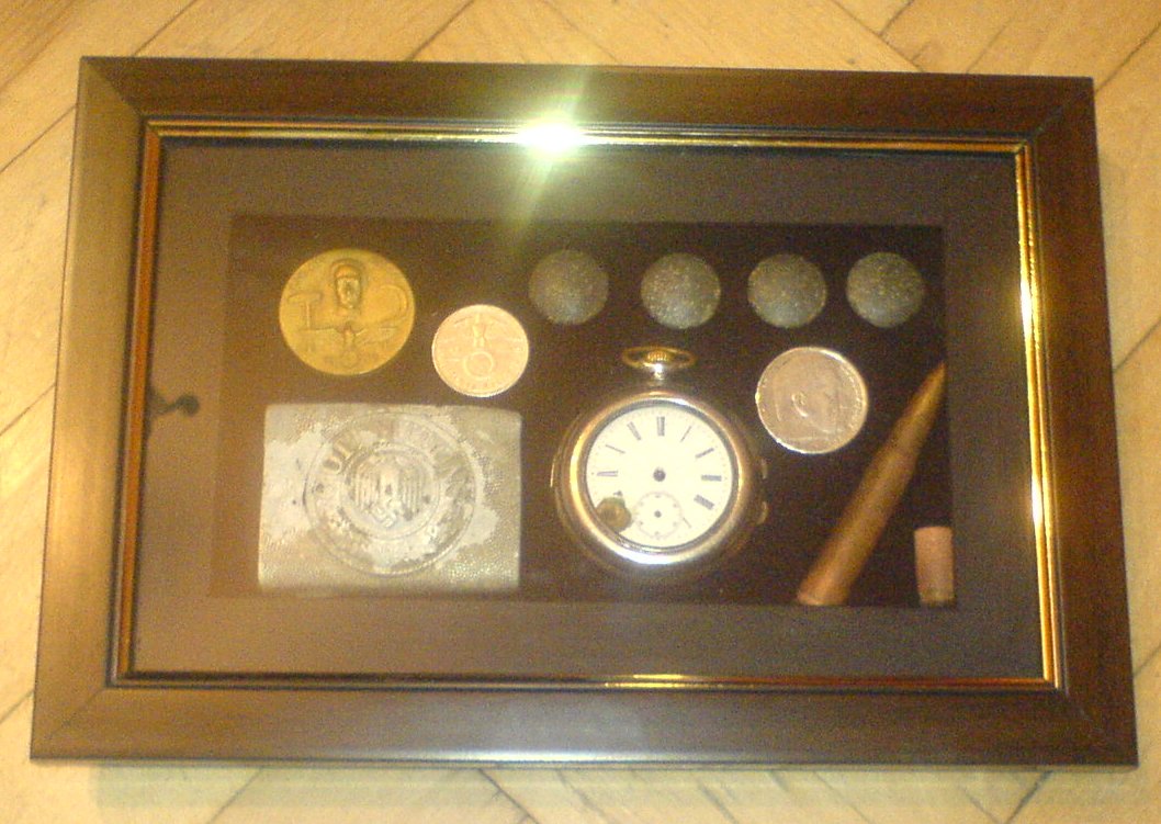 Ответ: Мой "коллажик" О, какой! Под стеклом по 3 рейху: пряга, часы трофейные серебряные, значок 1 мая, рейхсмарки серебряные (2 и 5), патрик Маузер, гильза МП, пуговки кительные... Зацените!