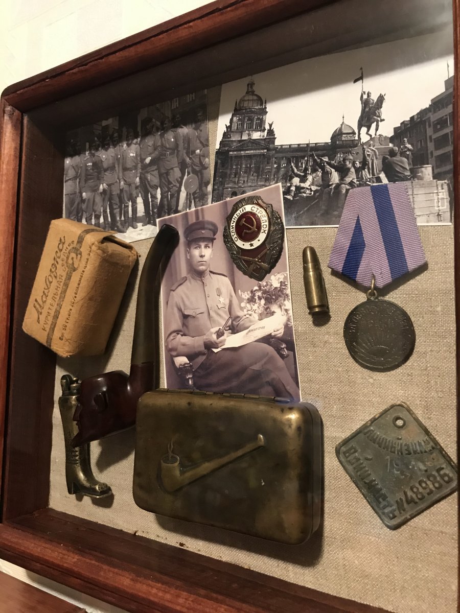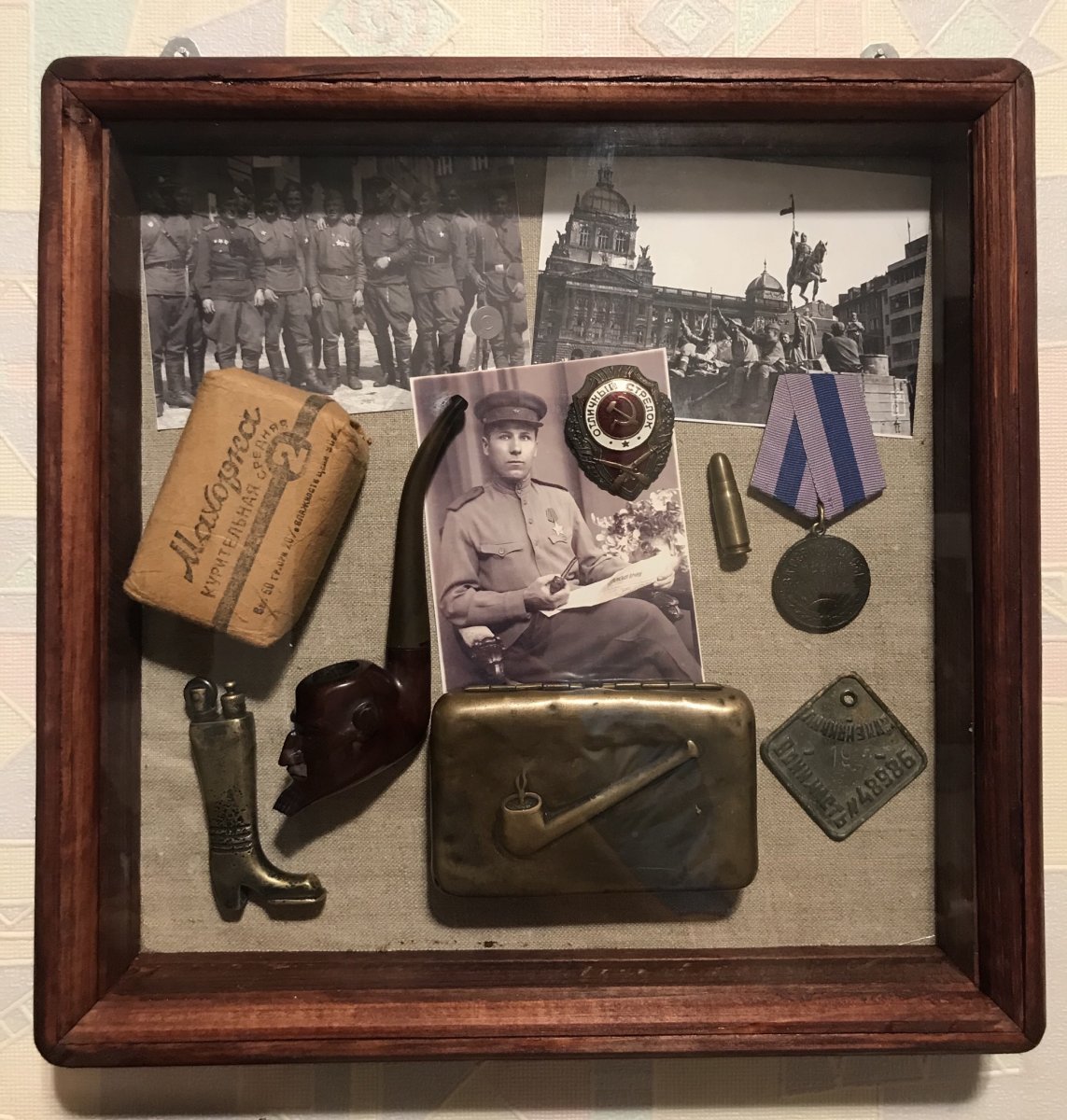 Может еще документов? Сделать чисто бумажный коллаж: фото, письма, конверты, пропуски и тд?