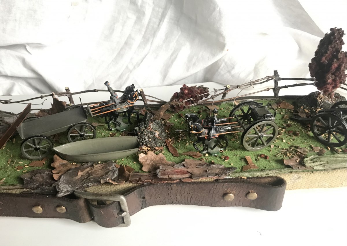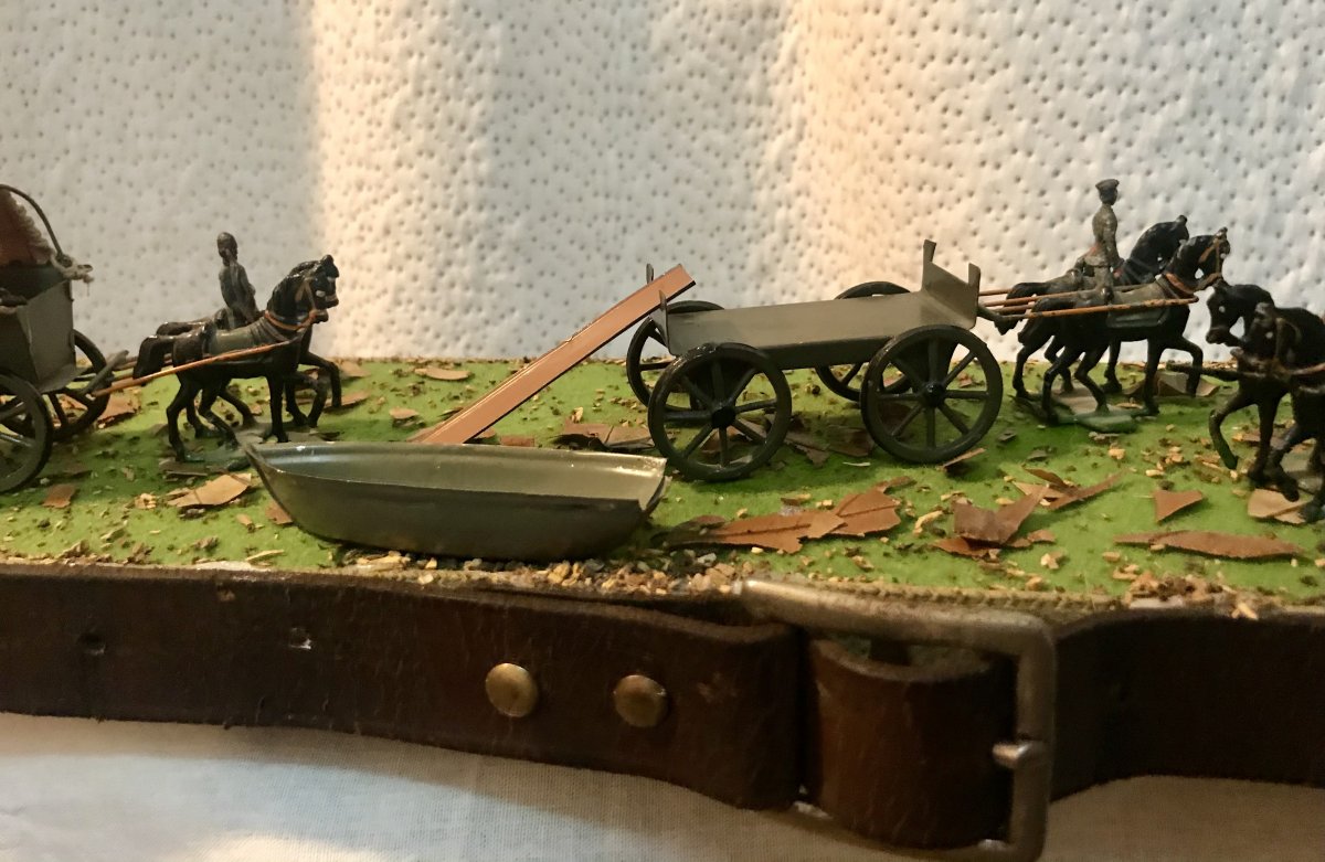 Диорама на тему : Конный обоз немецких солдат на период ПМВ . Набор оловянных солдатиков от фирмы Heide , до 1945г. выпуска . Полка : основа дерево , фетр , сухая листва , махорка ,брезент . Оригинальная часть стременного ремня с пряжкой .