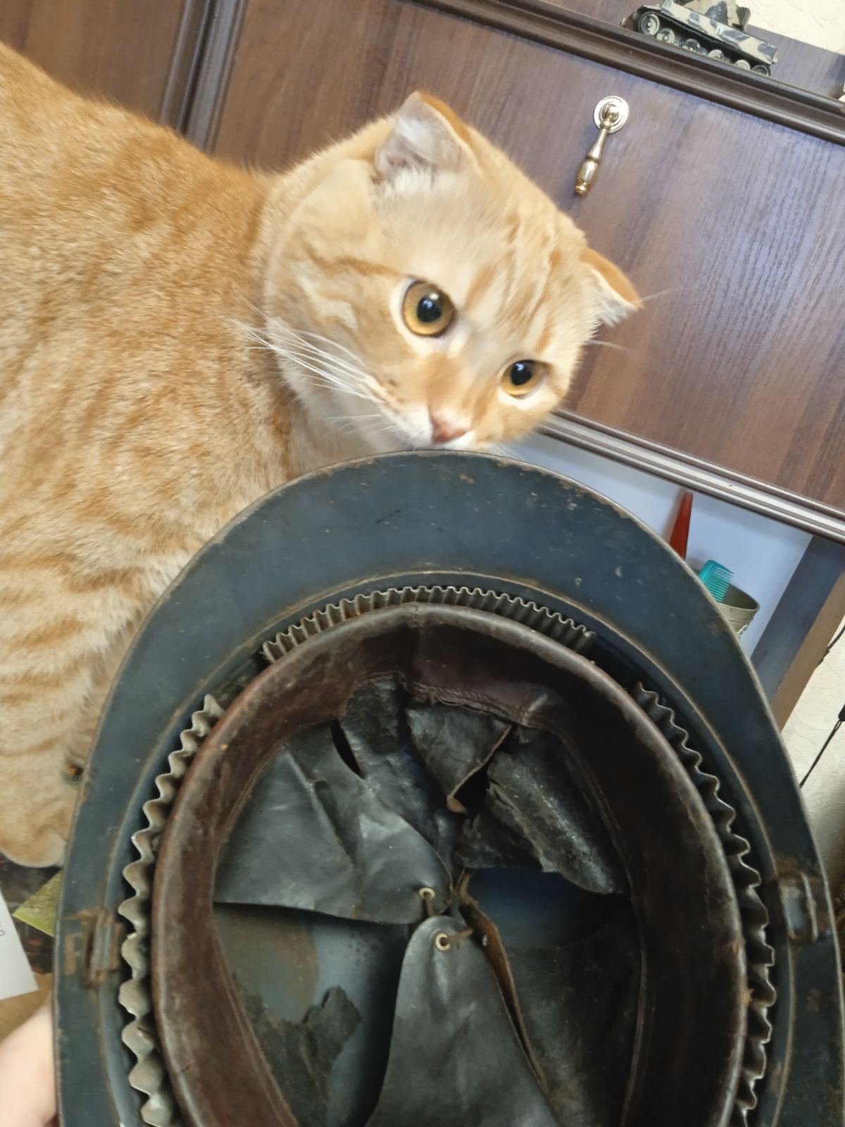 Приехала ко мне "голубая даль". Очень хороший сохран для более чем столетнего предмета. Осталось доукомплектовать кокардой, оригинальный подбородочный ремень имеется.