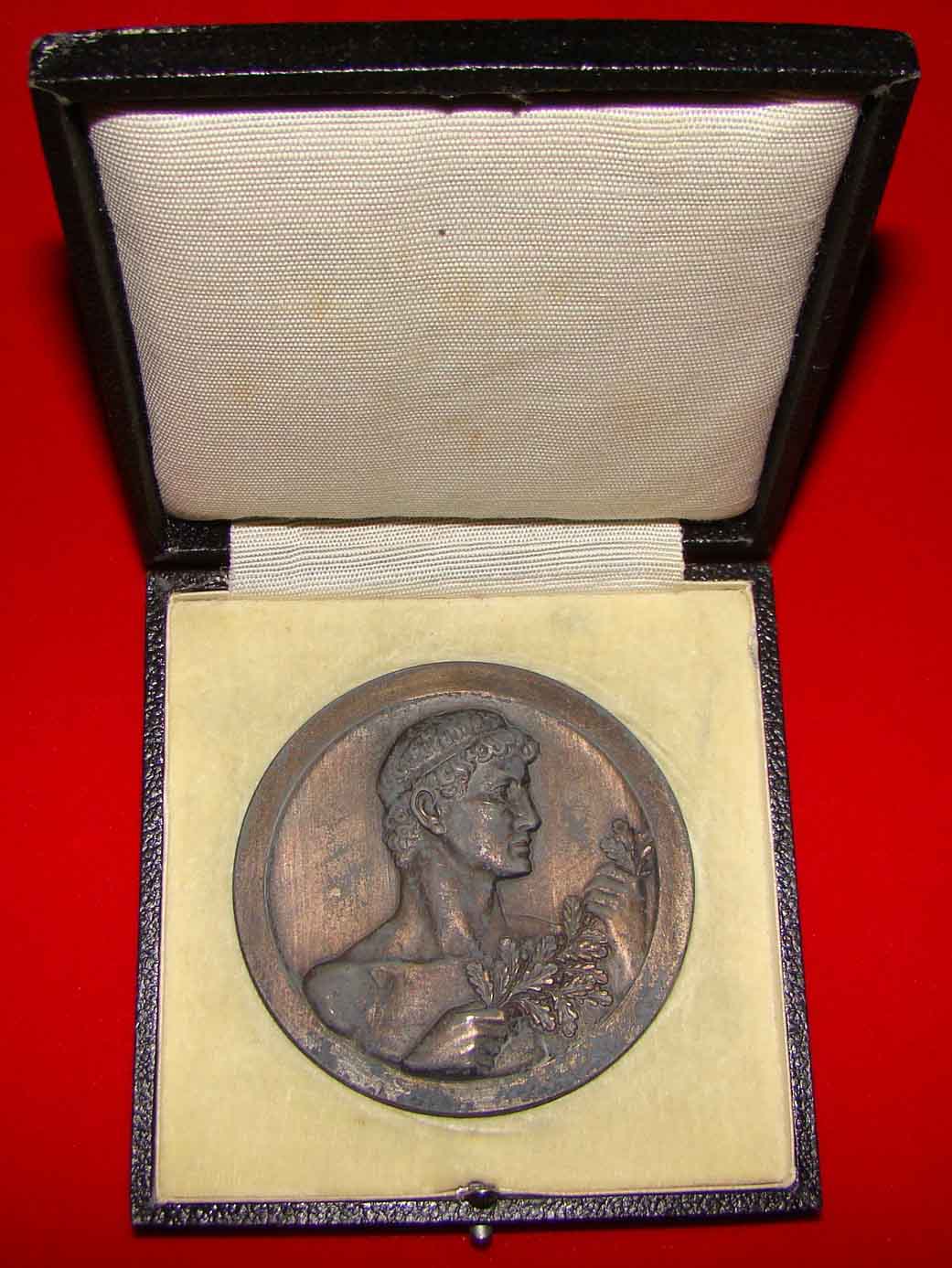 Интересная плакетка из бронзы Победителю 13-го Забега по пересечённой лесной местности в Гау Бранденбург. 1934 год. Забег проводился "Немецким обществом каноистов" - Deutscher Kanu-Verband (DKV). В 1934 в рамках всеобщей тенденции общество было подчинено DRL, поэтому в 1945 было прикрыто, ибо как бы являлось национал-социалистической организацией. Но в 1949 возродилось и живо до сих пор, насчитывая порядка 116 тыс членов и 1300 различных союзов, обществ и пр., являясь таким образом самым большим в мире Обществом каноистов. Надо отметить что общество не ограничивает свою деятельность только каноэ, но вообще занимается массовым "народным" спортом, в первую очередь связанным с природой. Забеги по лесной местности также устраиваются "Обществом каноистов" до сих пор и для взрослых и для детей. Вообще каноэ очень популярно в Германии и в частности здесь, в Бранденбурге, где много озёр и речек, плюс Шпреевальд со своими каналами в лесу и пр. А ещё более популярны путешествия по лесам, горам и долам