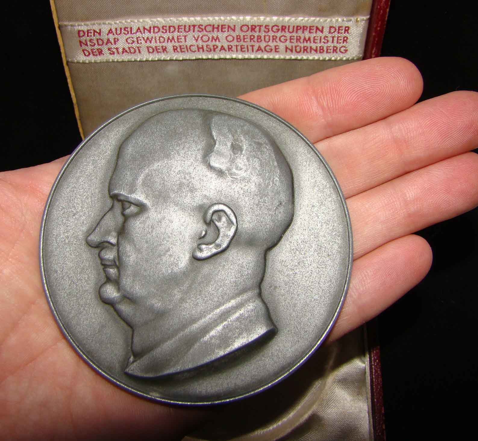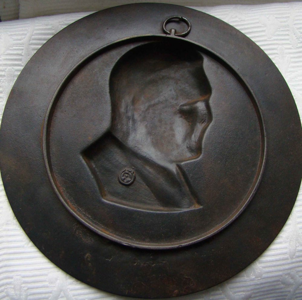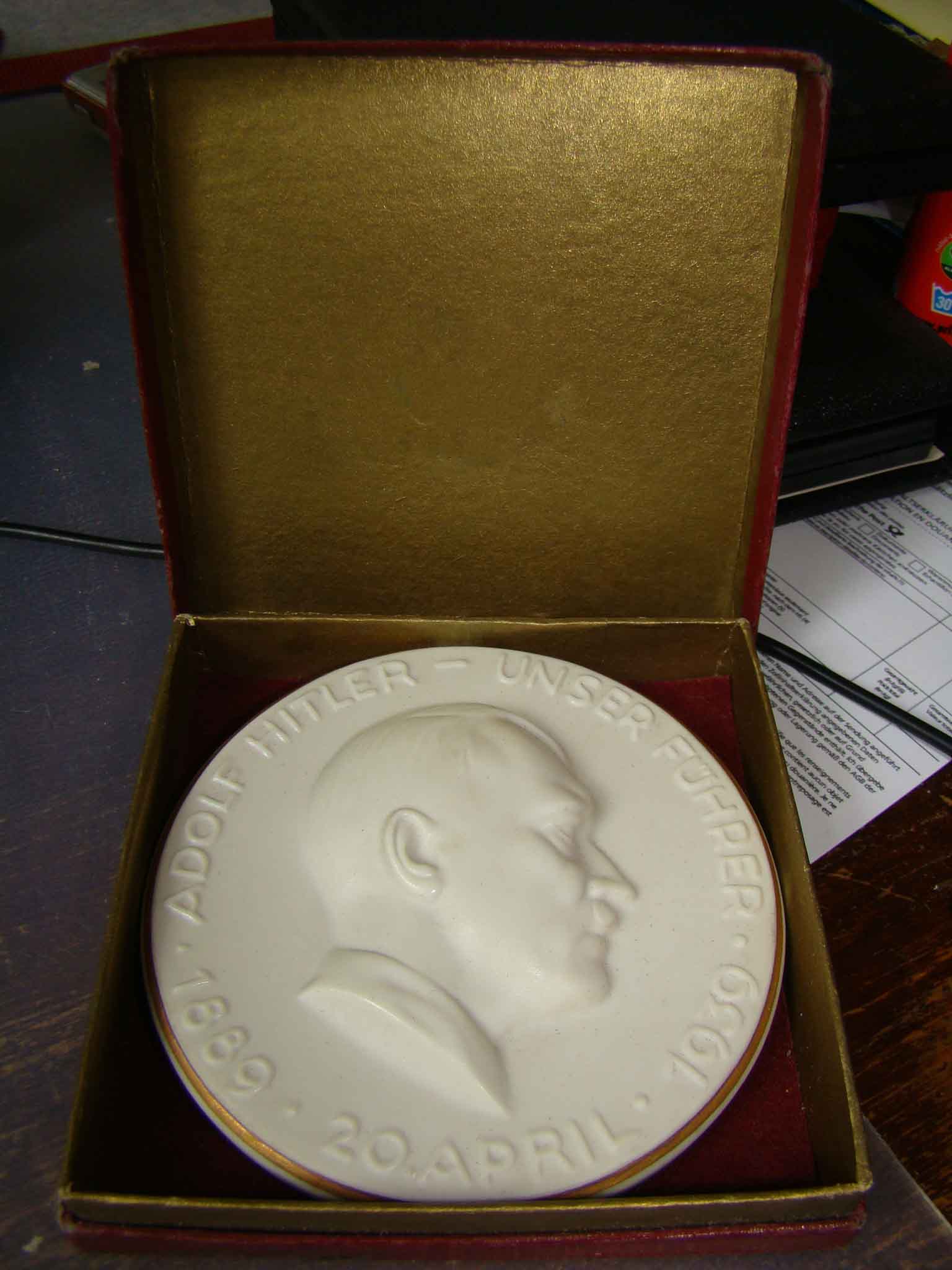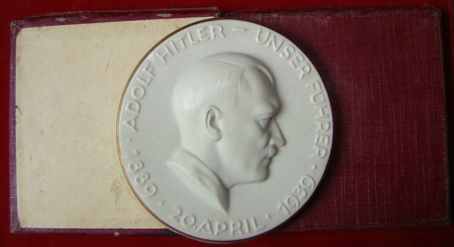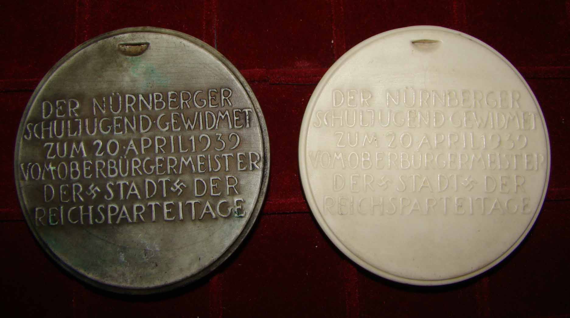 две фарфоровые медали (плакетки настенные), вручавшиеся школьникам (видимо особо достойным или же просто в школу) Нюрнберга от лица Обер-бургомистра Нюрнберга к юбилею Фюрера 20 апреля 1939. Интересно, что сам Обер-Бургомистр Вилли Либель покончил с собой также 20 апреля 1945 года (есть мнение что был убит). http://de.wikipedia.org/wiki/Willy_Liebel обе медали одинаковые, одна из бисквитного фарфора, вторая видимо тоже, но тонирована. диаметр 88 мм инициалы скульптора есть, но имя не знаю. качество работы очень высокое, высокий рельеф. А белый бисквит прям под слоновую кость