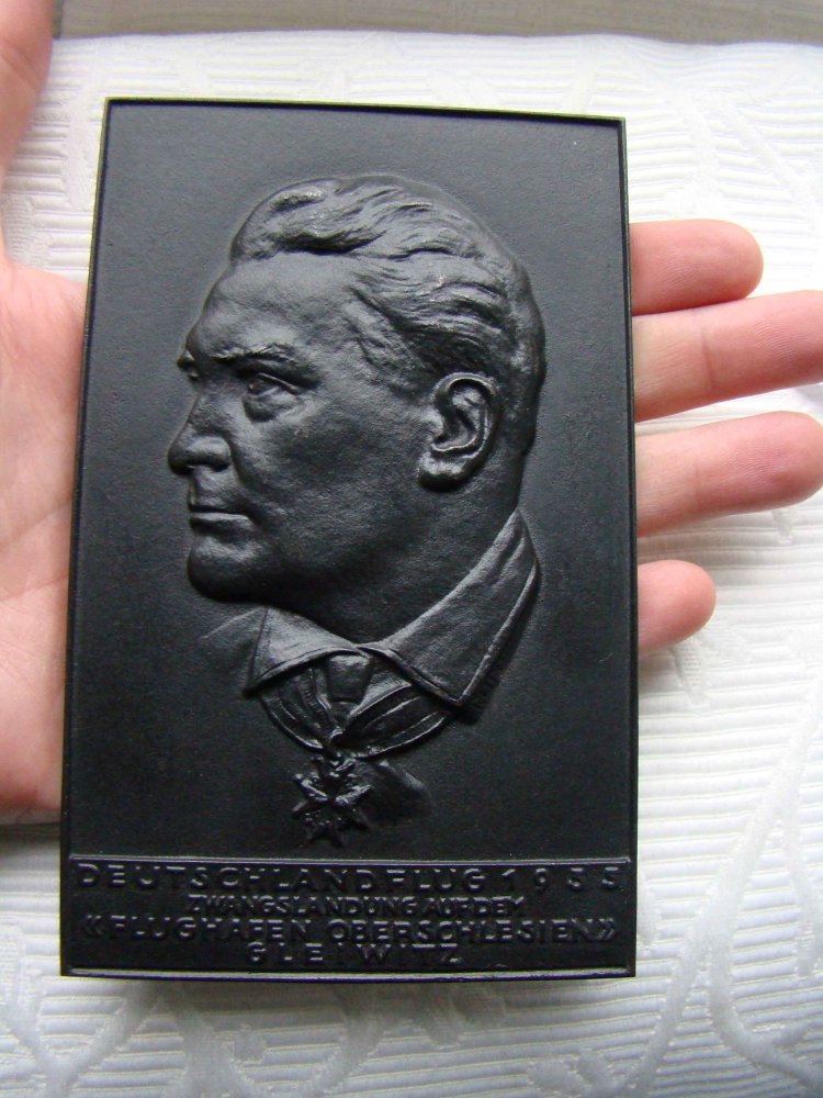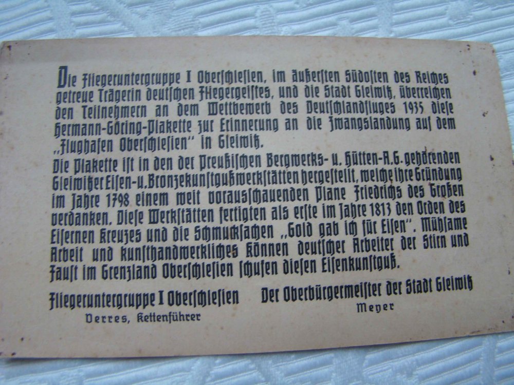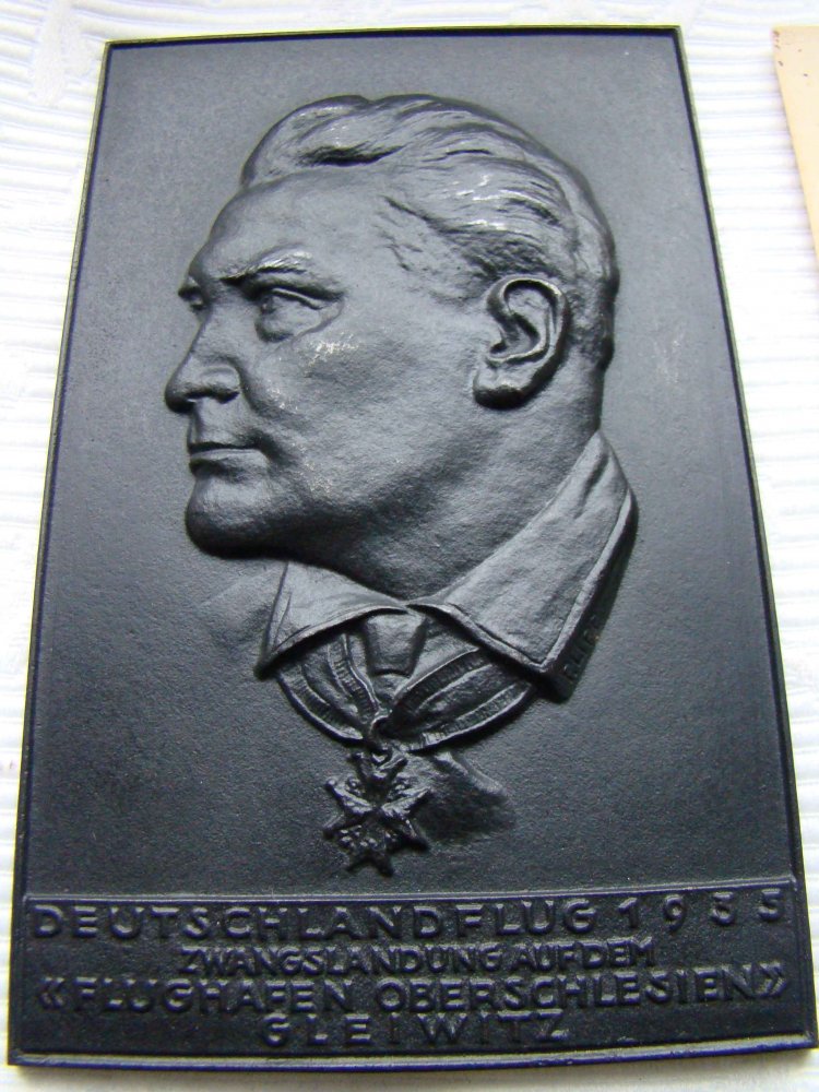 образец гляйвицкого художественного литья из чугуния плакетка в память посадки в аэропорте "Верхняя Силезия" в Гляйвице, в рамках Deutschland Flug 1935. К плакетке сопутствующий документик, о том что эта "Герман-Геринг-Плакетка" вручается участникам полета в память о посадке в Гляйвице от "лётной подгруппы I Верх.Силезия и от г.Гляйвиц. Далее хвалебная ода для Preussag, и о том что они первые начали выпуск Железного креста в 1813, украшения и пр из серии "Золото обменял я на железо" и пр. клеймо Preussag AG (Прусское горнодобывающее и металлургическое акционерное общество) и клеймо их предприятия в Глейвице, в Верхней Силезии - HAG - администрация металлургического завода Гляйвиц. оказалось что сейчас Preussag это известнейший туристический концерн TUI... они же скупили весь Hapag-Lloyd и кучу других фирм и концернов. Крутые ребята... по поводу этой посадки нашёл какой то польский текст, что на аэродром тогда, 28 мая 1935, приземлилось 170 машин. Ну и все пилоты мол получили эти плакетки.