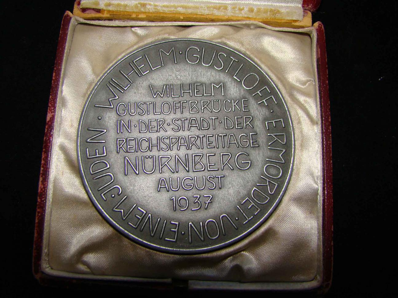 редкая медаль к постройке моста им. Вильгельма Густлова в Нюрнберге в августе 1937 г. д.8 см "Вильгельм Густлов - убит евреем" "Мост им.Вильгельма Густлова в Нюрнберге, городе партийных съездов, август 1937" На крышке внутри ленточка с посвящением - "заграничным немецким отделениям NSDAP от Обербургомистра города партсъездов Нюрнберга" на мосту была вот такая бронзовая табличка, которую создал некий профессор Brack по заказу города (по стилю портрет на медали похож, возможно его можно назвать и в качестве медальера) "Вильгельм Густлов - убит евреем" табличка исчезла в конце апреля 1945 Мост - слева виден белый каменный столб или обелиск, табличка была на нём. Сверху как положено был орёл со свастикой и дубовым венком Вильгельм Густлофф родился 30 января 1895 года в городе Шверин на севере Германии. После окончания школы устроился работать в местный банк. В Первой мировой войне Густлофф участия не принимал по причине слабого здоровья. В 1917 году он перевёлся в швейцарский филиал банка, где продолжил работу страховым агентом. В 1929 году Густлофф вступил в НСДАП и энергично занялся вербовкой в партию новых членов. На этом поприще ему быстро удалось добиться успеха, уже через три года он сумел основать в Давосе швейцарское отделение НСДАП. 30 января 1933 года (в день прихода нацистов к власти) Адольф Гитлер назначил Густлоффа ландесгруппенляйтером Швейцарии. Густлофф вёл активную антисемитскую пропаганду, в частности, способствовал распространению в Швейцарии «Протоколов сионских мудрецов». 4 февраля 1936 года Густлофф был застрелен в Давосе еврейским студентом Давидом Франкфуртером (студент-медик из Югославии, сын раввина. 5 выстрелов из револьвера). Это убийство активно использовалось нацистской пропагандой, акцент делался на национальности убийцы. В Германии был объявлен траур, а в Шверине Густлоффу устроили государственные похороны, на которых лично присутствовали Адольф Гитлер и Йозеф Геббельс. Густлоффа возвели в ранг мученика, его имя получили улицы и площади по всей стране. В Шверине был создан мемориал его памяти (снесён в 1945 году). p.s. Франкфуртер пришёл к Густлову домой, его впустили. Он дождался самого Густлова, спросил - вы Вильгельм Густлов. И после ответа "да" начал стрелять, первый раз не попал, но потом 5 раз попал. Далее убежал и долго ходил вокруг , в итоге сдался жандармам которые не знали что с ним делать. Просили мол докажи что ты убил... тогда он предъявил револьвер потом в участке жена Густлова указала на него как на убийцу и спросила - как ты мог это сделать, у тебя такие добрые глаза... Он ответил, "я еврей, и это объясняет всё" получил 18 лет, хотя в том кантоне была смертная казнь гильотиной, но не для политических убийц. Освободили сразу после окончания войны по просьбе бернского ребе и евреев Швейцарии. Условием было навсегда покинуть страну. В сентябре 1945 уехал в Палестину. умер в 1982