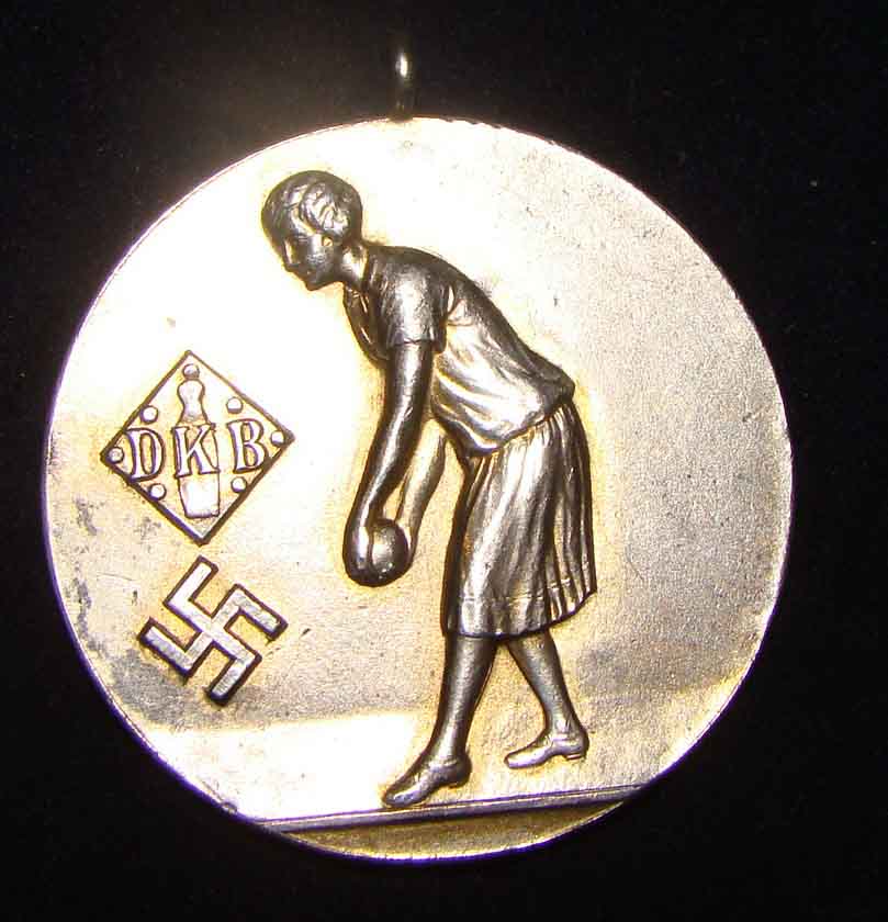 Медали немецких союзов Гольфа и Кеглей Гольф - вручено некоему директору курорта (?) в благодарность за проведение региональных командных соревнований 10 июля 1938 и международных Германия - Швеция 12-13 августа 1938. на аверсе эмаль. Кегли - насколько я понял медаль для победителей соревнований Немецкой Федерации игры в кегли среди женщин в 1934 г. Классические кегли - "на асфальте" - Фрау на асфальте серебро 990