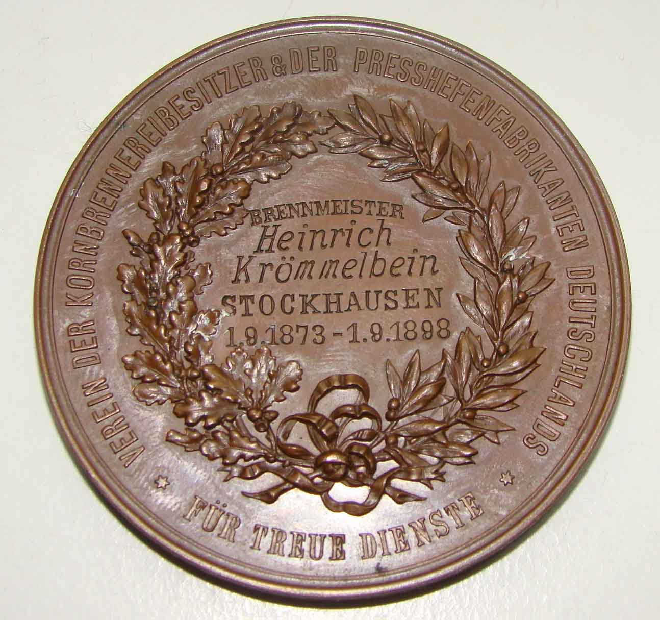 у меня такая бронзовая медаль появилась недавно, но очень мне понравилась , а уж название союза тем более на аверсе стандартный сюжет на год трёх кайзеров (1888), на реверсе уже само посвящение - "За верную службу", от Союза владельцев хлебных спиртовых заводов и фабрикантов прессованных дрожжей Германии - Бреннмайстеру (что то типа главного винокура) Генриху Крёммельбайну, Штокхаузен 1.9.1873 - 1.9.1898 в общем за 25 лет прилежного изготовления водки