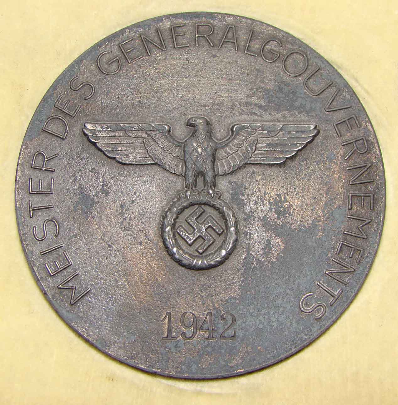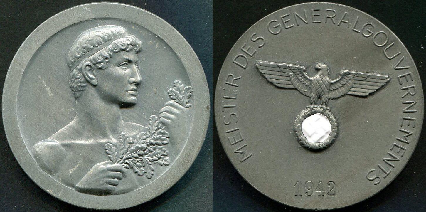 футбольная медаль "Чемпион Генерал-Губернаторства 1942" д. 6 см в 1942 году победителем чемпионата Генерал-губернаторства (т.е. оккупированной Польши) стал клуб LSV Boelcke Krakau (Спортивное общество/клуб Люфтваффе ""Бёльке", Краков), обыгравший в полуфинале клуб СС/Полиции Люблина 2:0 и в финале Спортклуб Люфтваффе Варшава 1:0 Всего Гау-Лига "Генерал-губернаторство" была поделена на 4 округа (Варшава, Краков, Радом, Люблин), где проводились отборочные матчи между местными командами (спорт-клубы вермахта. Люфтваффе, СС, Полиции, больших предприятий и пр. - всего там было зарегистрировано около 80 немецких футбольных клубов), затем 4 победителя разыгрывали титул Чемпиона, который отправлялся уже чемпионат Германии, откуда обычно вылетал уже в первом круге - там уже были посерьёзнее клубы. Хотя в 1943 г. клуб Полиции Порядка Варшавы продержался до второго круга на моей медали по цинку остатки бронзирования, в продаже висит в сети ещё вот такая