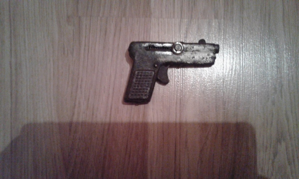 Доброго вечора! Не запальничка і не на пістонах, сріляє пластмасовим корком радянський,дитячий 60-70рр. (застійний).З повагою.Ось такий.
