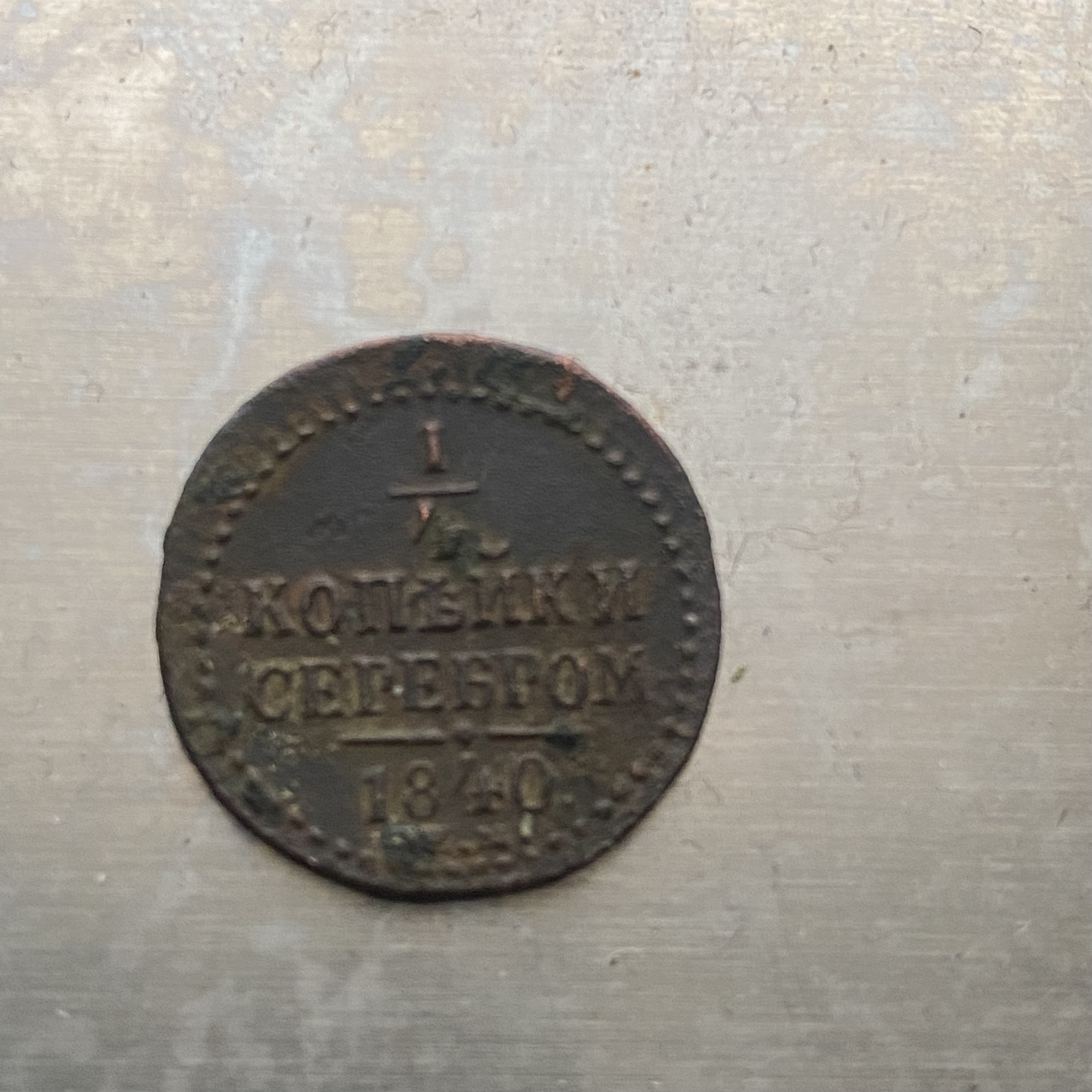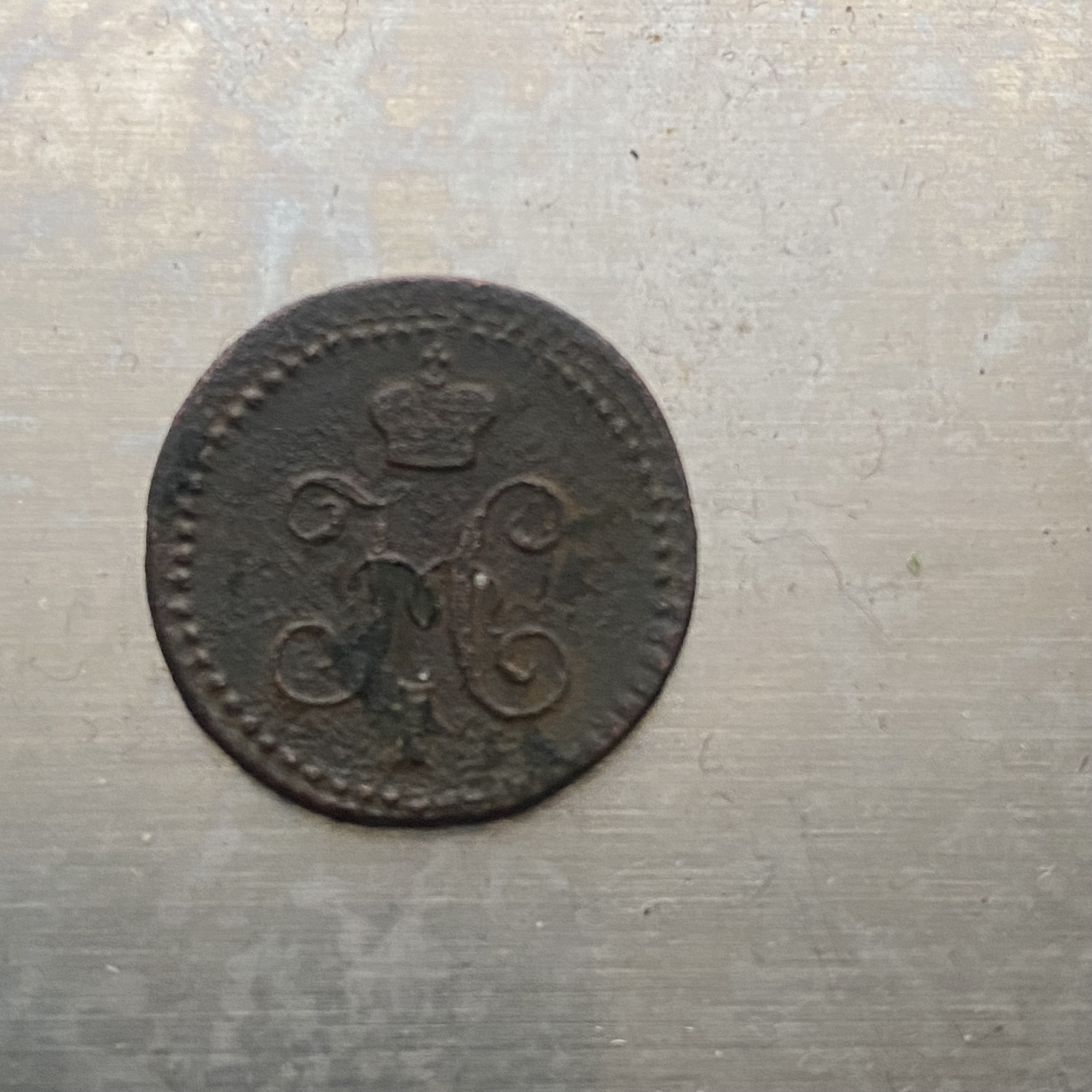 Для початку можна просто голкою розкришити окисел і дерев'яною зубочисткою очистити букву. Для "СП" там немає місця, значить це або "С" або "Е". Тоді стане ясно з ціною. Я вважаю, що там виявиться "Е", бо монета занадто кругла і шрифт рівний.