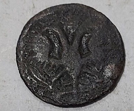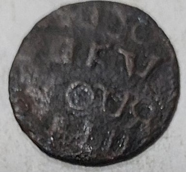 Я бы утверждал, что это фальшак под полушку Петра I типа "ВРП", образца 1718-1722 годов. Чтобы понять точнее - надо было перевернуть монету (она лежит вверх ногами) и отзеркалить, так как резчик был малограмотным и резал на фальшивом штемпеле прямое изображение. Получается, что прототипом послужила полушка, предположительно, 1720 года (или, менее вероятно, 1722 года), без знака двора, то есть, вероятно, Кадашевского денежного двора (ведь на Набережном ставили буквы "НД"). Кстати, фальшаки полушек ценятся в разы дороже, чем подлинные монеты. С уважением