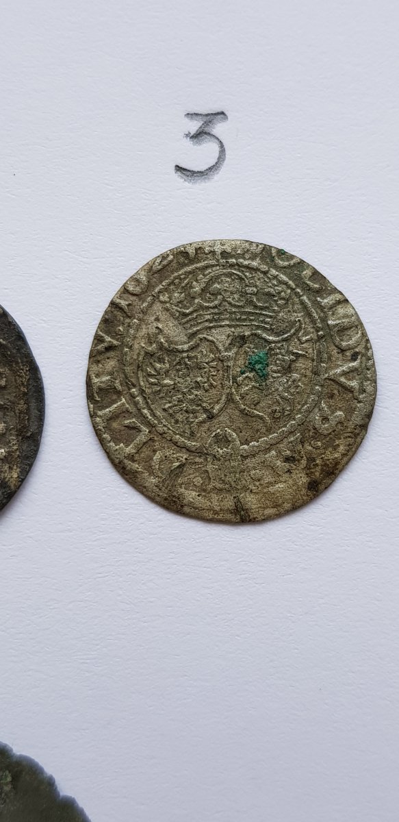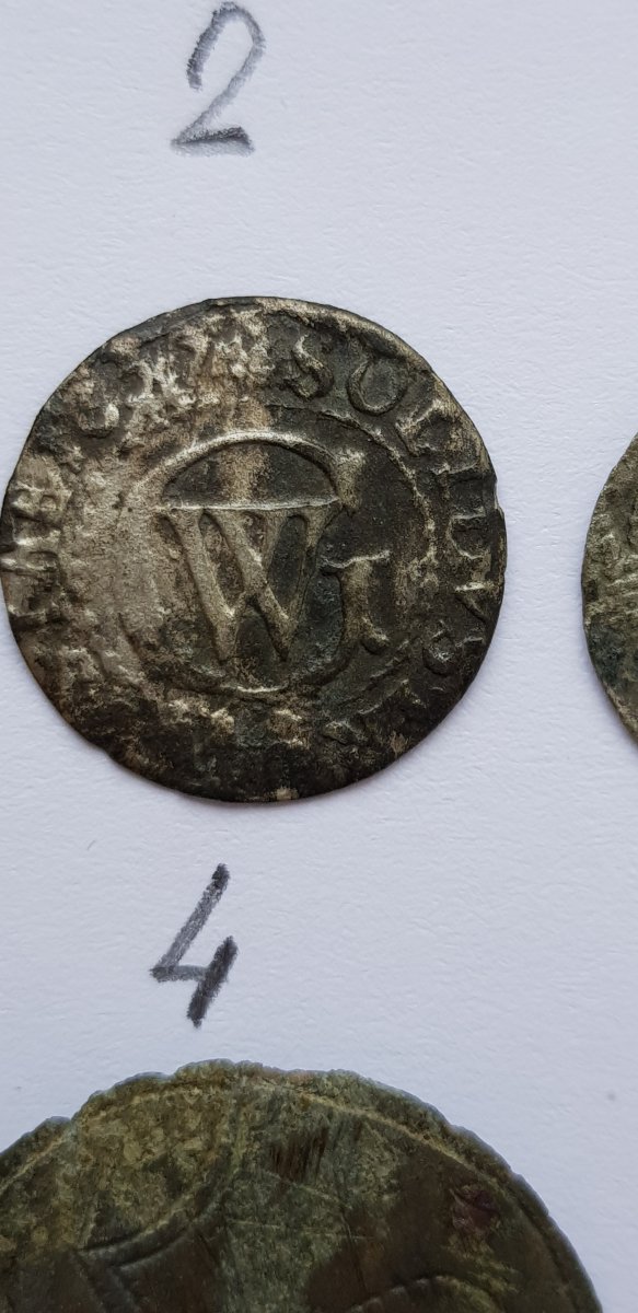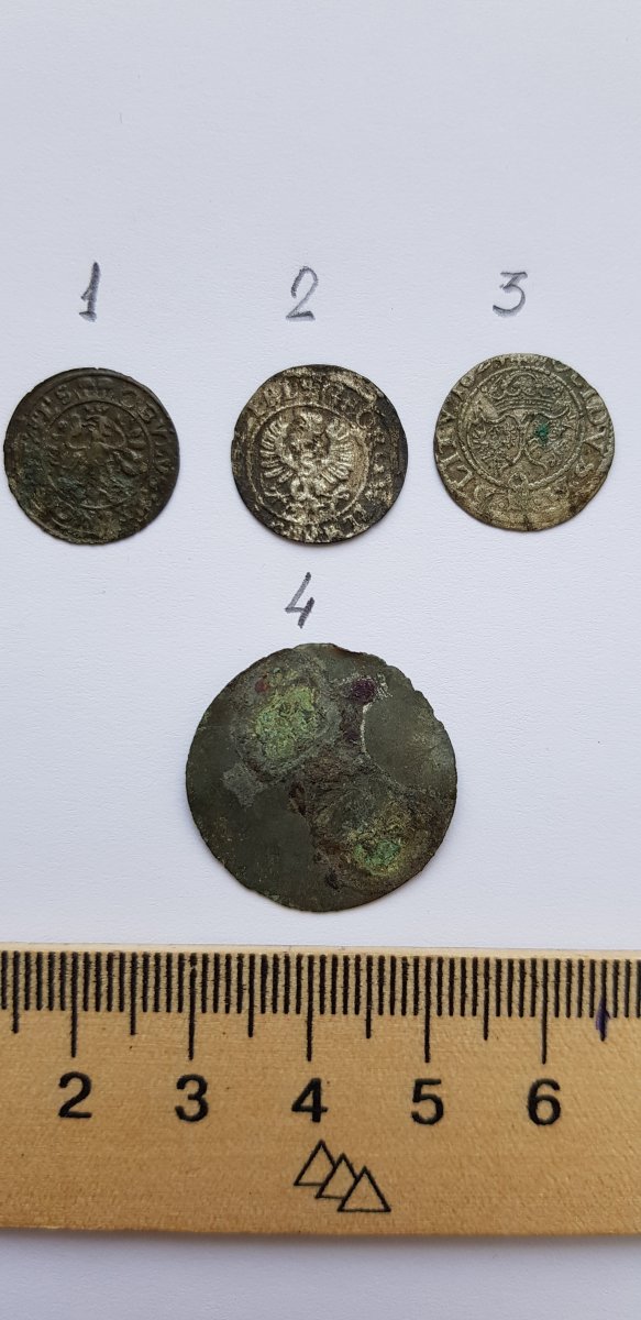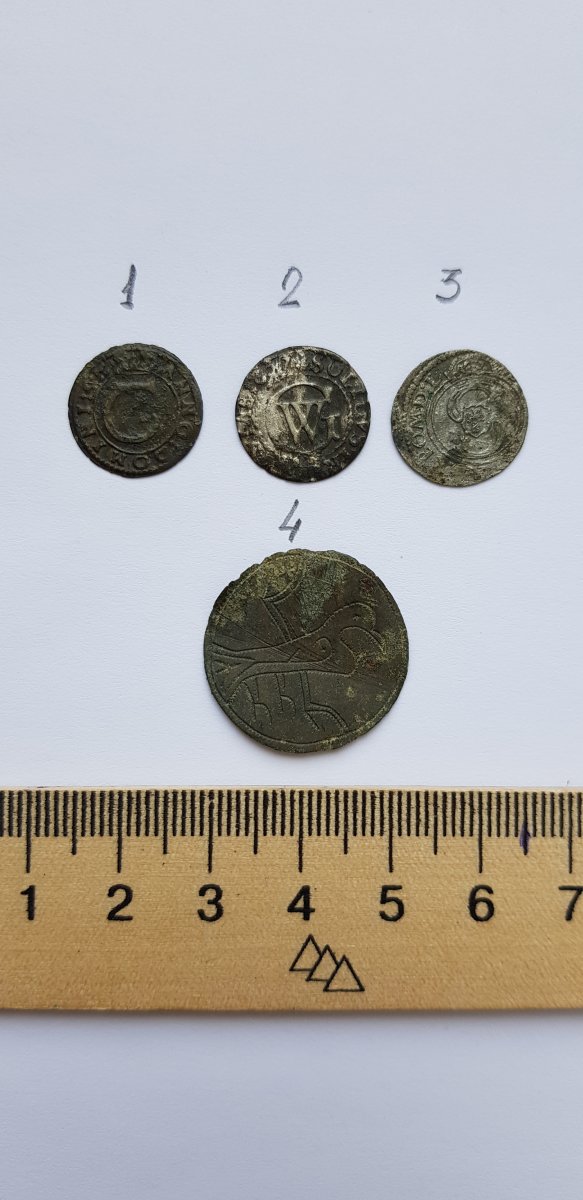 Доброго дня! 1. Тешинський обол 1652 року Ельжбети Лукреції. 2. Пруський солід 163х (7?) року Георга Вільгельма. 3. Литовський солід 1624 року Сигізмунда ІІІ. 4. Дукач.