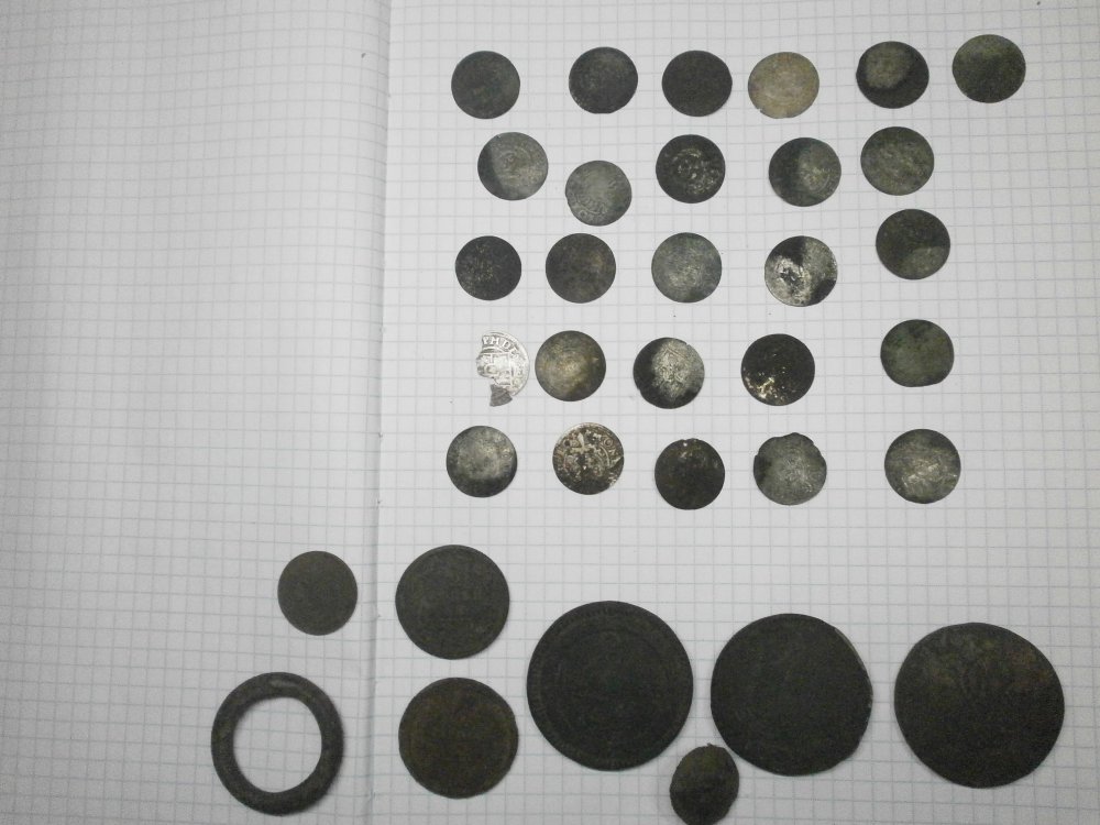 Привет уважаемые ком-рады. Вот час назад вернулся из копа, собственно результат ниже, извините за качество фото,сделанное трясущимися руками. Спецов прошу определить монеты, которые сфотографированы крупнее. С уважением,за рание спасибо.