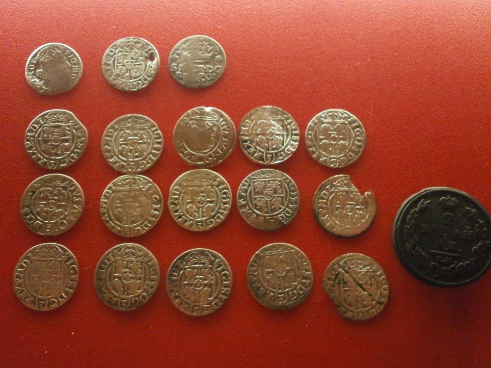 На третьем фото: рижский - третья монета в верхнем ряду; шведский - первая монета во втором ряду. Номерки возле монет здорово облегчают ориентирование.