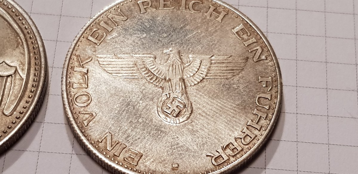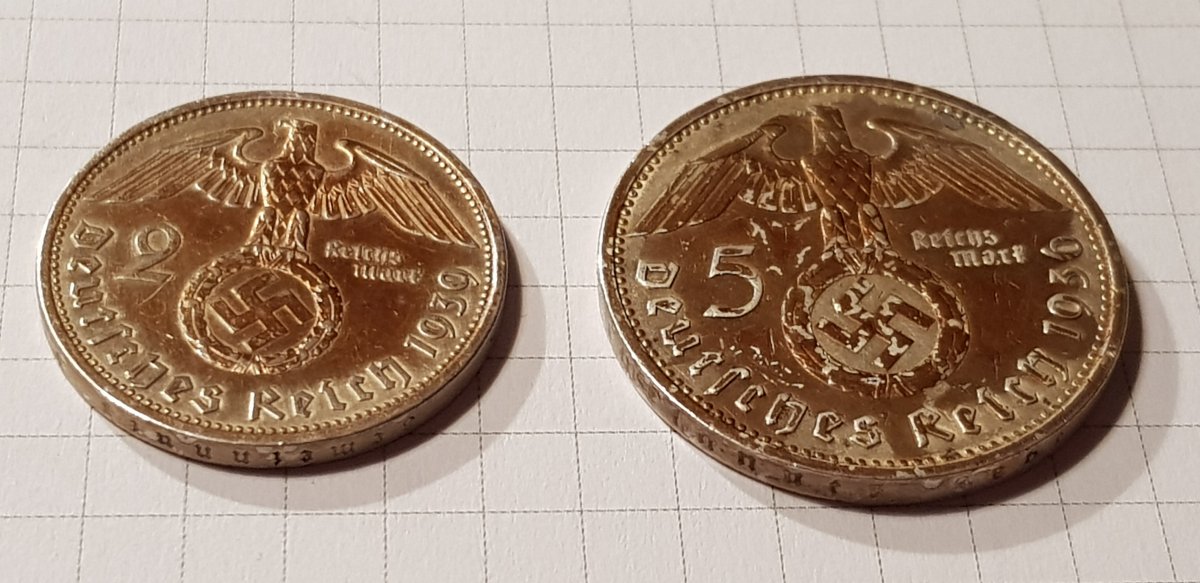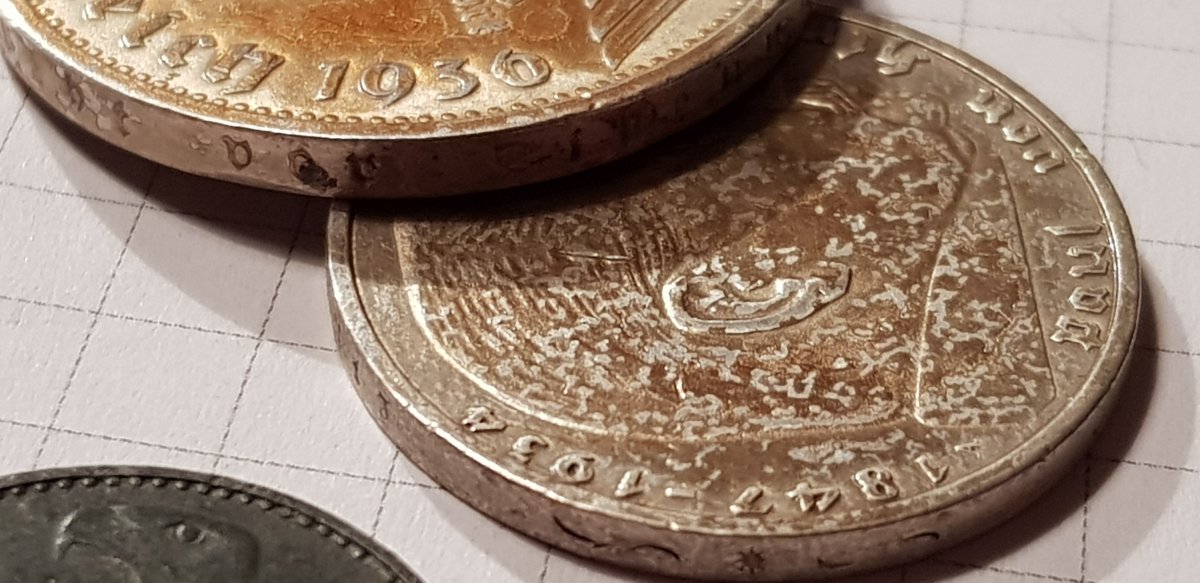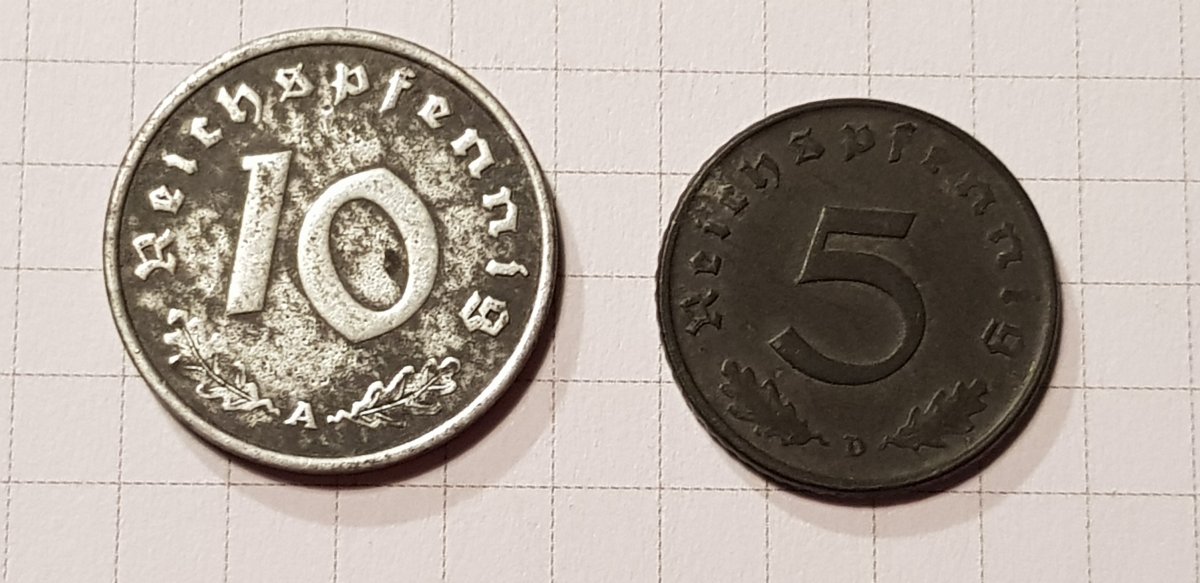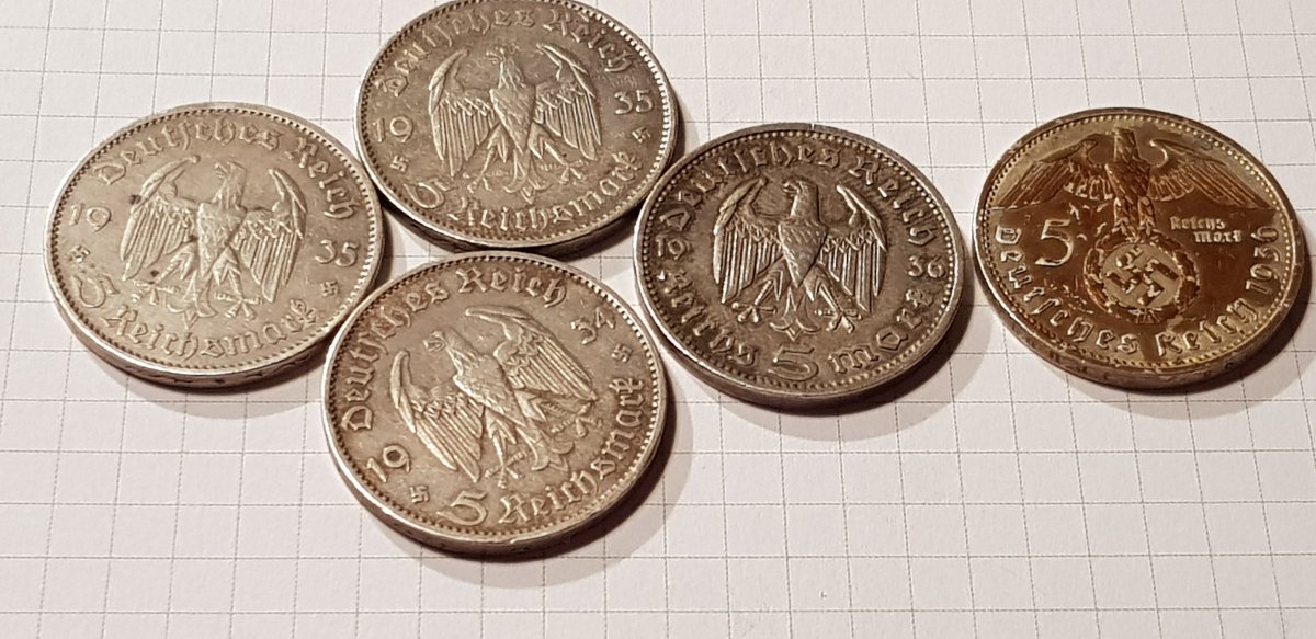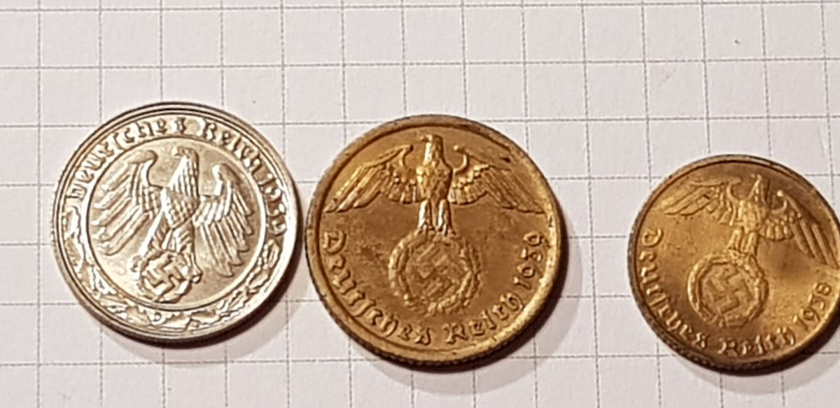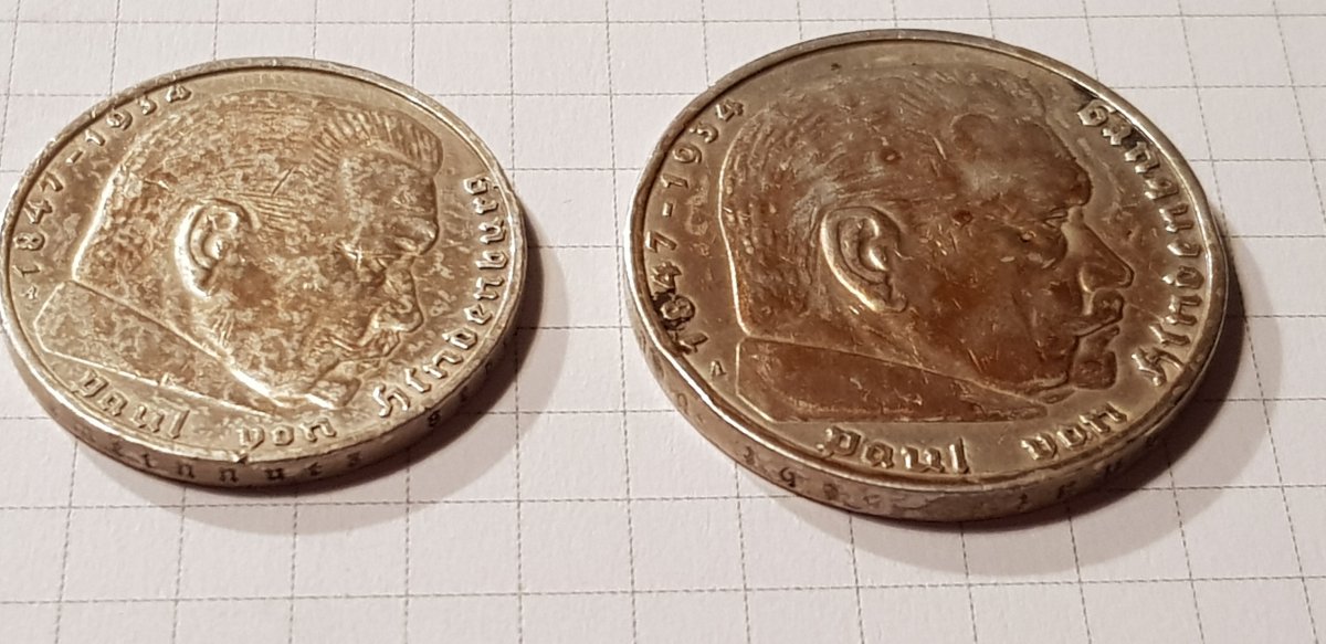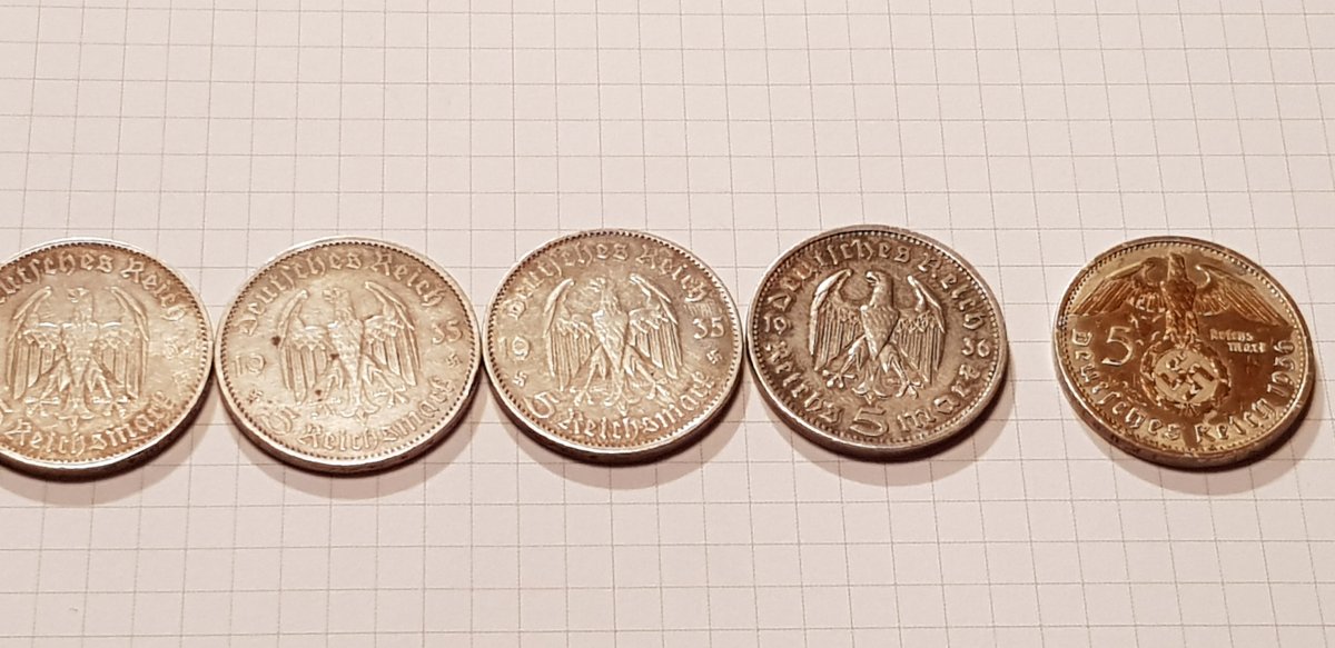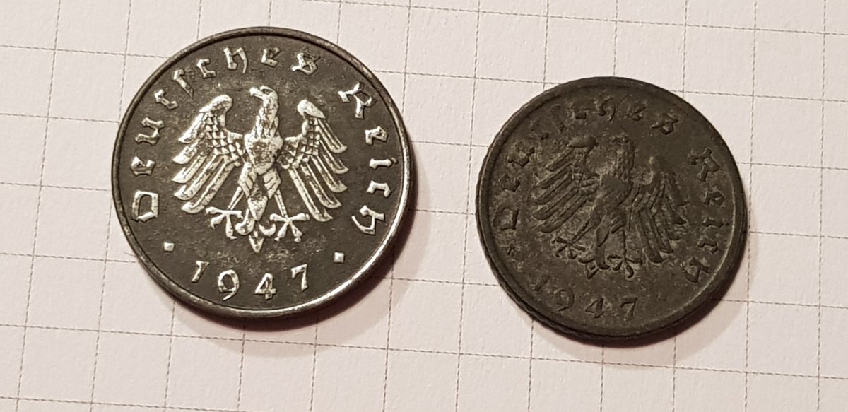Якщо мова йде про 2 і 5 марок Гінденбурга, то монети правильні. Монетний двір (А) Берлін ніхто підробляти не буде. Скоріше така патина, монета могла зберігатися в агресивному середовищі. Дві монети 1947р цинк, також самі дешеві в своєму сегменті.(без свастики) Монети з отвором 5 і 10пф. повинна бути вага відповідно 2,5гр. і 3,4гр.