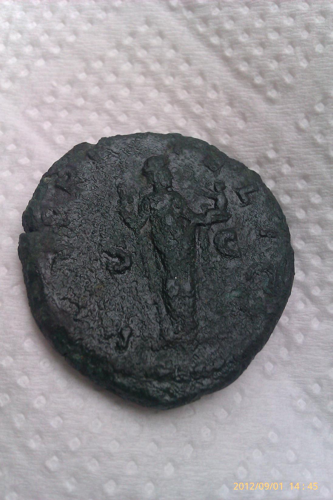 Задохлик, мир праху его, сдаётся мне, при жизни был Антонином Пием с Фортуной на реверсе. Трибунат не 13, а 14, то есть 150 - 151 гг. Н. Э. Руль и рог изобилия угадываются до сих пор. В нашатыре передержали? Неужто его это он так съел? Я ж писал чуть выше - не больше минуты, потом промыть и фланелькой протереть.