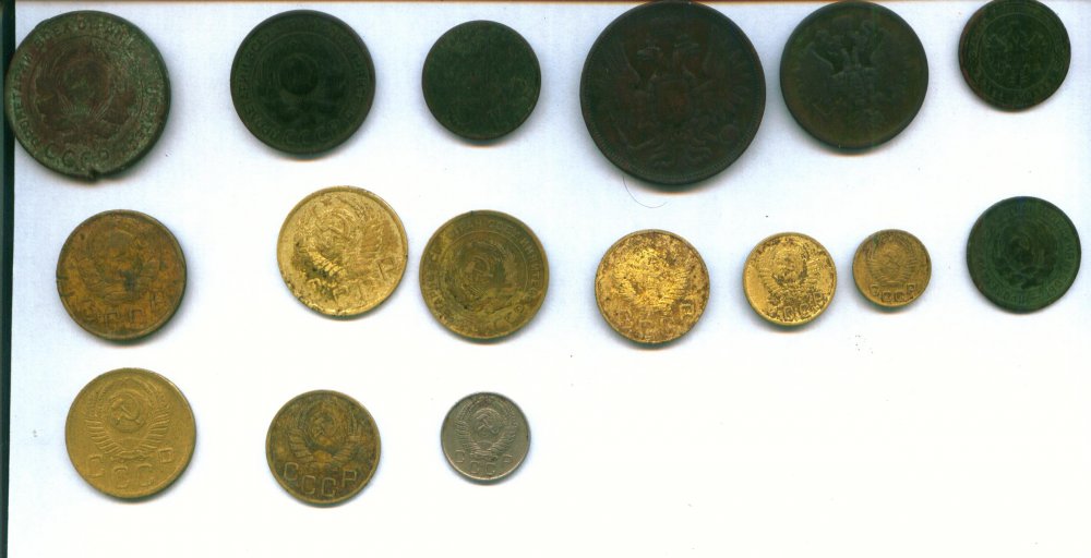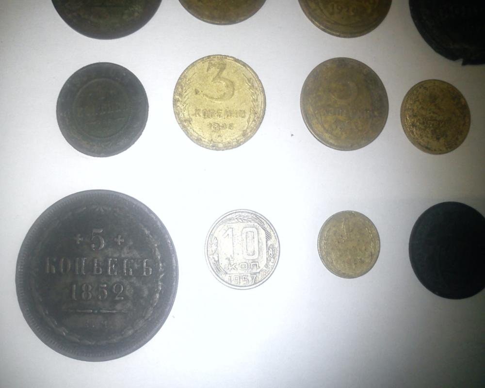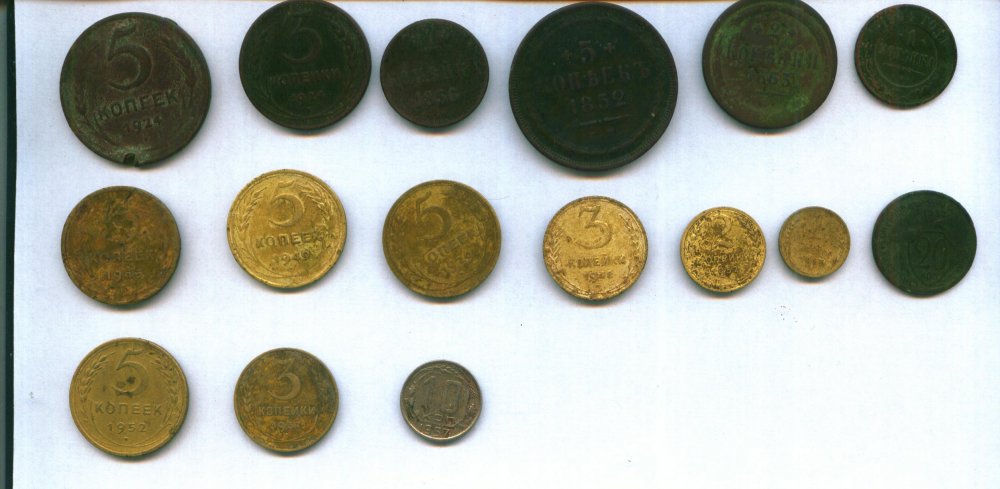 года не сильно видно 1 копейка 1904, 2 копейки 1863, 5 коп.1852, копейка 1856, 5коп.1924, 3коп,1924, 20 коп 1932, 1коп. 1955, 2 коп 1952, 3 коп 1948, 5коп 1929, 5 коп. 1949, 5коп 1946, 5коп 1952, 3коп. 1937, 10коп 1957
