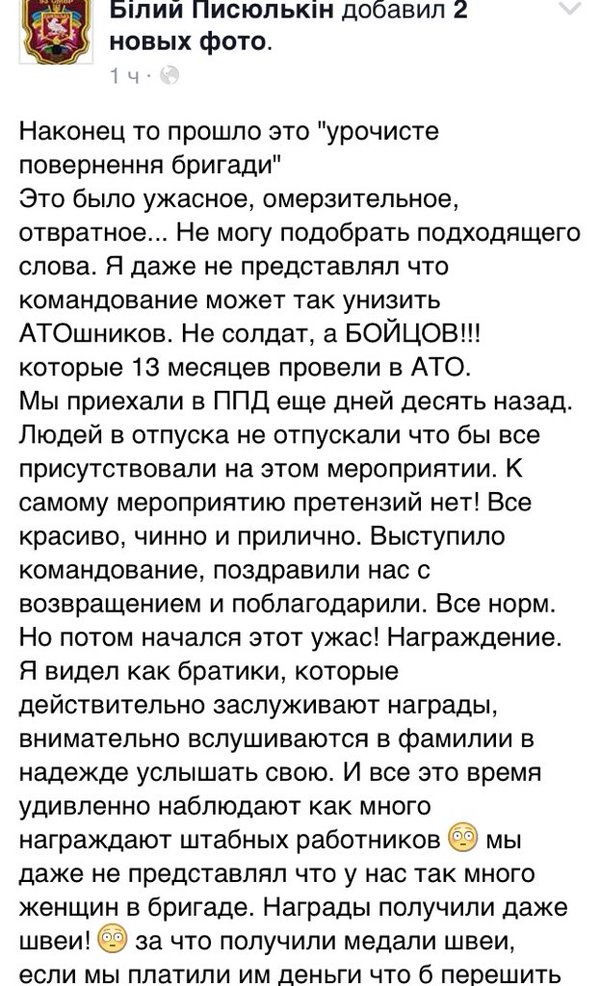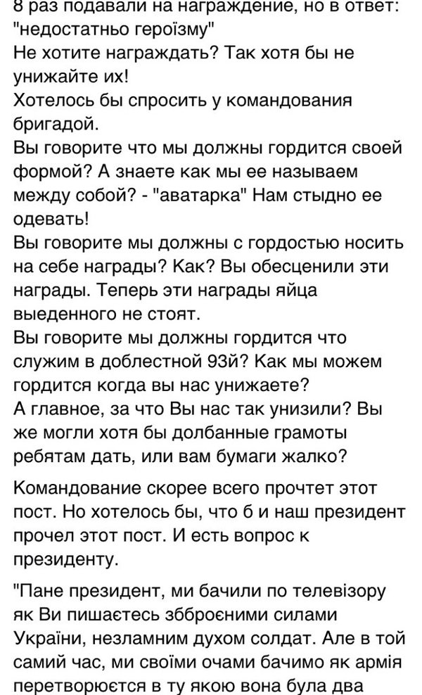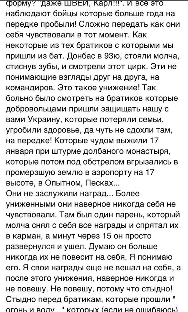 Не хотів вчора писати за демобілізованих , які малиб носити нагороди з гордістю , так мусять штурмувати міську раду вибиваючи собі пільги та землю . Ось вже написали про нагороди які отримують сьогодні і відношення військових до тих нагород . https://reibert.info/threads/rossijsko-ukrainskaja-vojna.486768/page-1893
