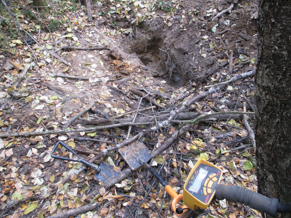 Для Василия Тёмного-выкопал,давно выкопал.Оказалось диск от ЗИС-5,а под ним гильзы (все вертикально было).Гильзы вроде 76 мм,изготовленны ещё во времена первой мировой.В яме ещё откопал часть радиатора,остатки деревянного ящика,кирку,какие-то ремешки,осколок кости,ну и настрел.Вскрывать там надо всё-по сигналу ещё всякие приблуды лежат.Человек,с которым копал,уехал жить в Тулу,ехать не с кем.Гильзу,что откопал вначале,кто-то упёр.Да и рядом покопал.Может уже всё раздербаненно там.