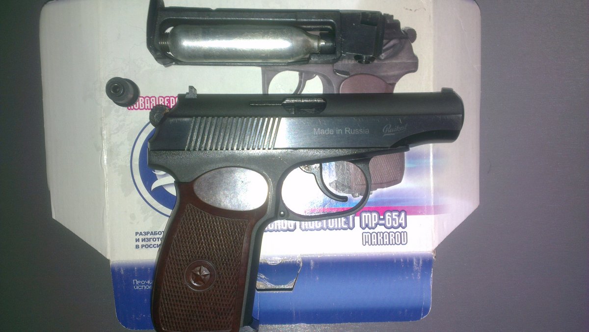 Продам МР-654Н. Пистолет 2013 года. Борода , широкий антиблик , бакелитовая рукоять , и проч. В комплекте два магазина стоковый и с пяткой магазина от ПМ. + переходник под 8грм. баллон , заводская коробка. Цена 2600 грн.