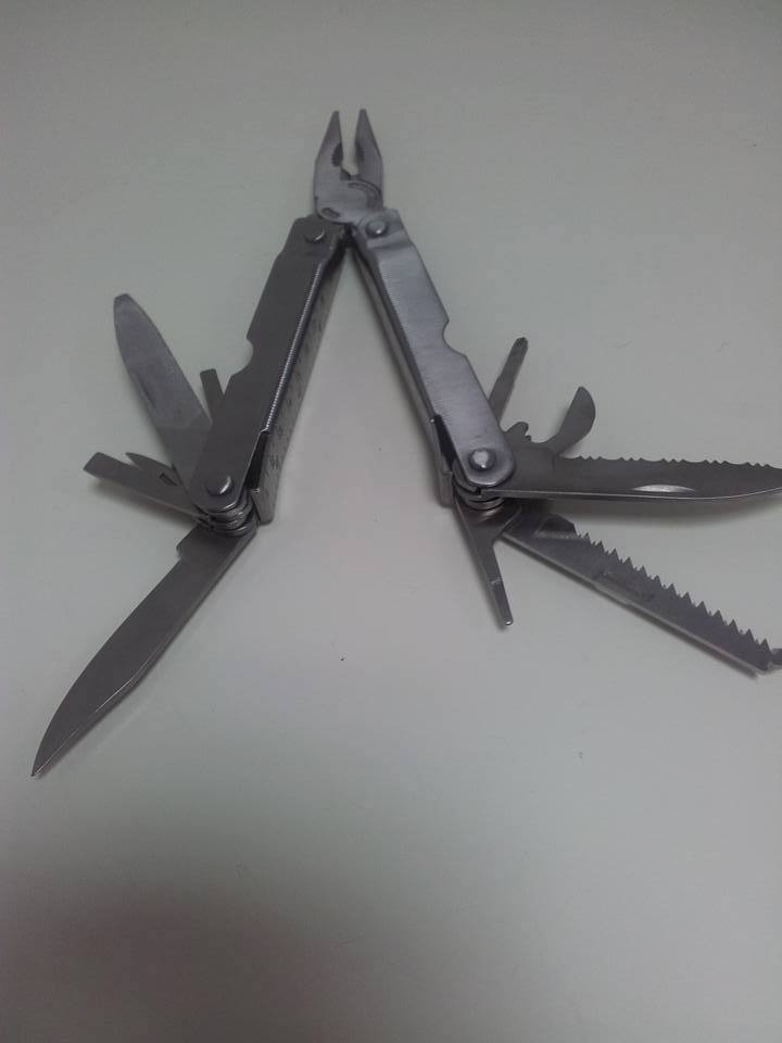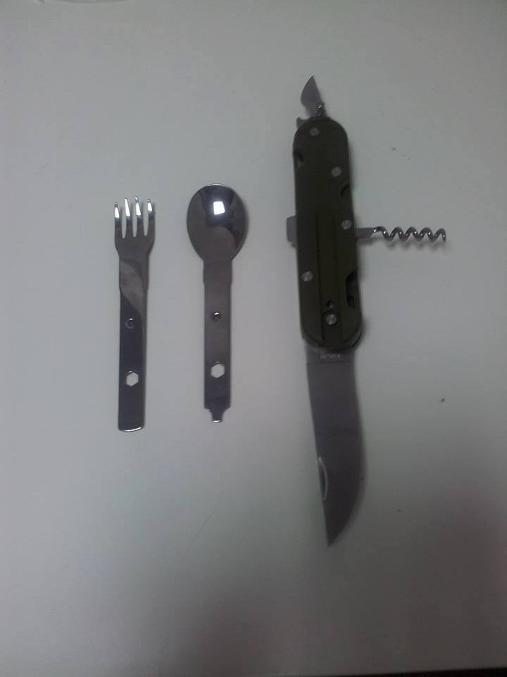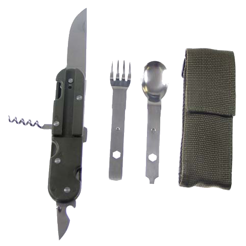 Мультитул 18 в 1 в тканевом чехле, "Fox Outdoor" Компактный инструмент на 18 функций. Набор включает в себя лезвие длиной 6,5 см с надежным фиксатором, стропорез длиной 6,5 см, пилу, кусачки и напильник, три отвертки (2 плоские и 1 крестовая), открывачку и консервный нож. На рукоятке имеется линейка с градацией по сантиметрам и дюймам. В комплекте идет нейлоновый чехол. Цена - 14$ Мультитул складной со столовыми приборами 3 в 1 с тканевым чехлом, "MFH" Универсальный столовый складной набор. Выполнен из нержавеющей стали. Комплект состоит из ножа, вилки, ложки, штопора и шипа, которые прячутся в тканевый чехол. Цена - 8$