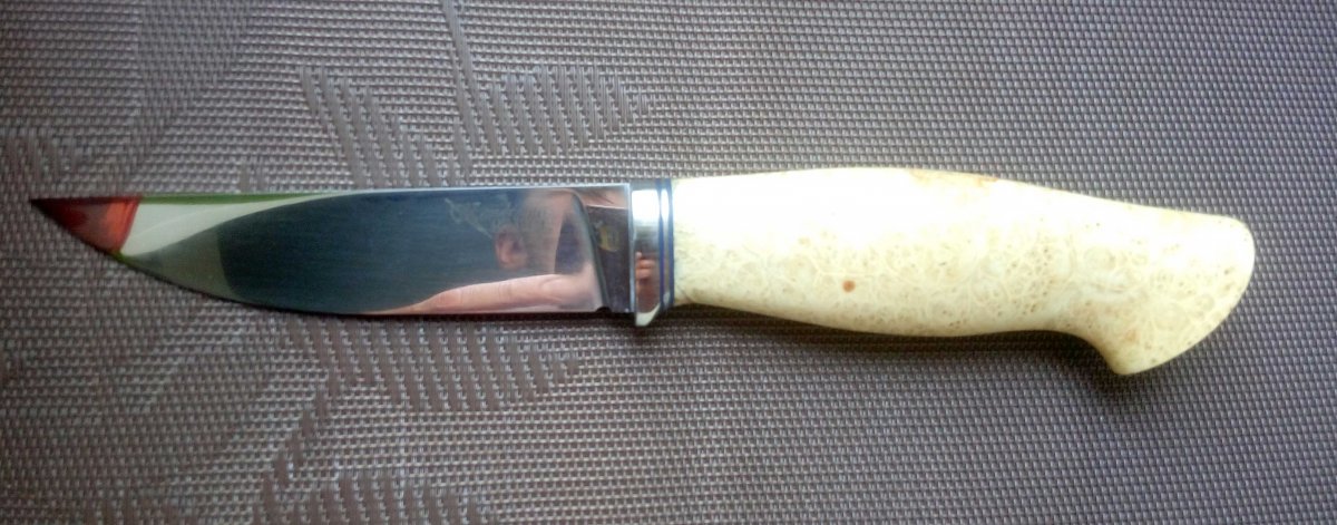 Сталь N690 , тв. 61 ед. 120 x 27 x 3,5 , длинна рукояти 125 мм, вставки из нержавейки, синей фибры, рукоять кап клена . Спуски прямые от обуха, всадной монтаж длинна хвостовика 75 мм. Сведение в 0,35. Пропитка рукояти,натуральным защитным маслом для пищевых поверхностей johnstones-teak-oil. Цена 1400 гривен. 2.jpg 3.jpg 5.jpg 6.jpg