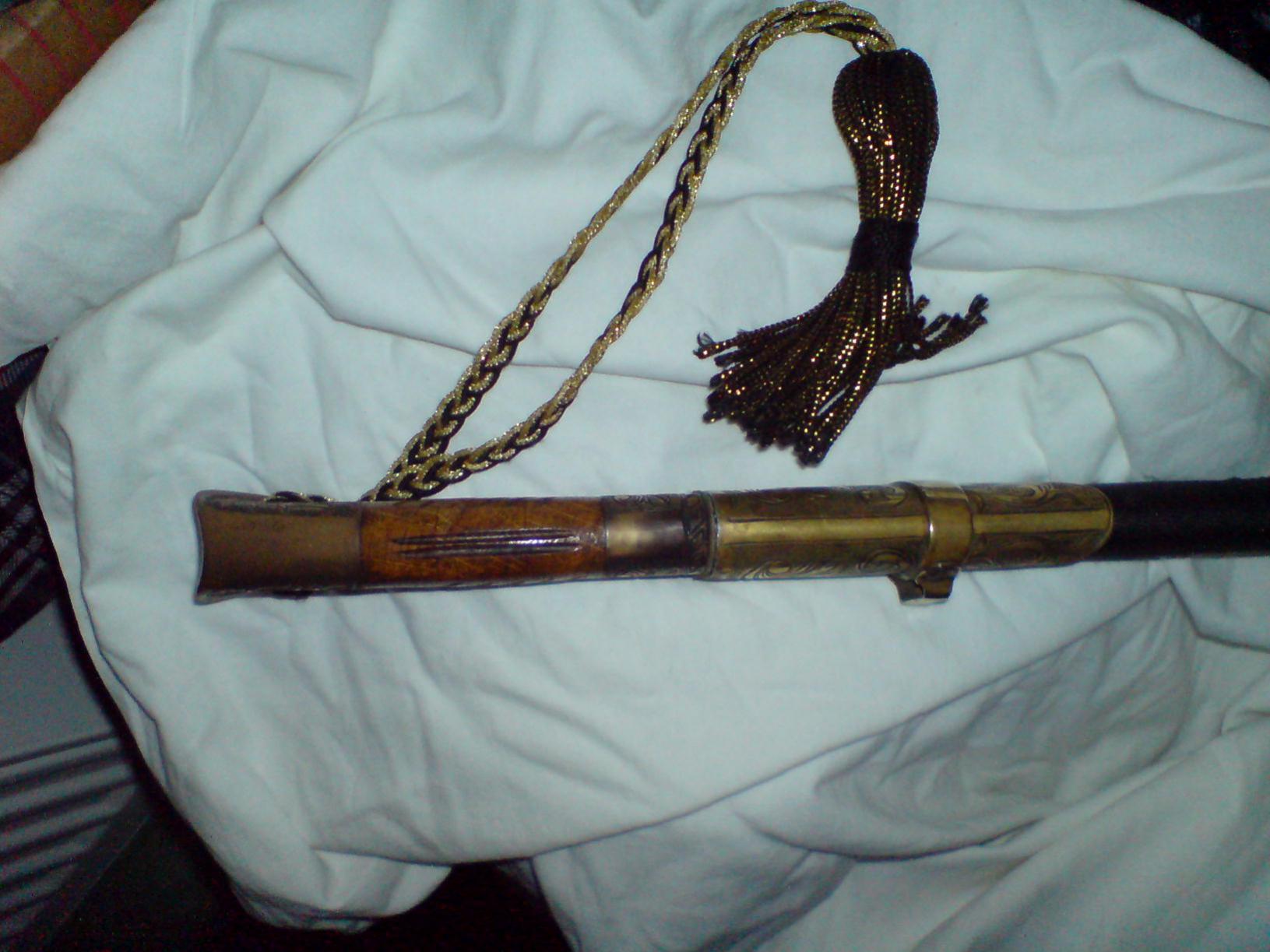 не здаєтся. явньій новодел. хоть и не могу причислить себя к большим знатокам, но некоторьіе детали как самой шашки так и ножен не соответствуют. дерево на рукояти-форма,количество насечек не то,устье ножен-скоба подвеса вьіполнена как отдельная деталь которую приклепали к устью,само устье на сколько я знаю никогда не гравировалось с тьільной стороньі,врочем как и все остальньіе детали ножен.клинок-форма дола а так же геометрия клинка не соответствует,к тому же видньі риски от обработки наждаком.тельмяк єто вобще покемонство.ещезабьіл добавить за чудньій шуруп вкрученьій в стакан.