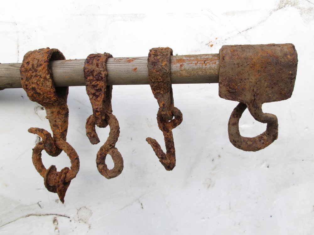 Находил подобные "сцепки" на позициях артиллерии на конной тяге по 1941 году. Мне представлятся, что Ваша находка крепилась крюком вниз за кольцо на круглую жердь, выступающую из-под, например, вот такой телеги: и использовалась в качестве сцепного устройства для кольца ответной части другой повозки. Поперечина на крюке типа "усов" не давала этому кольцу спадать с крюка во время движения. Честь имею!