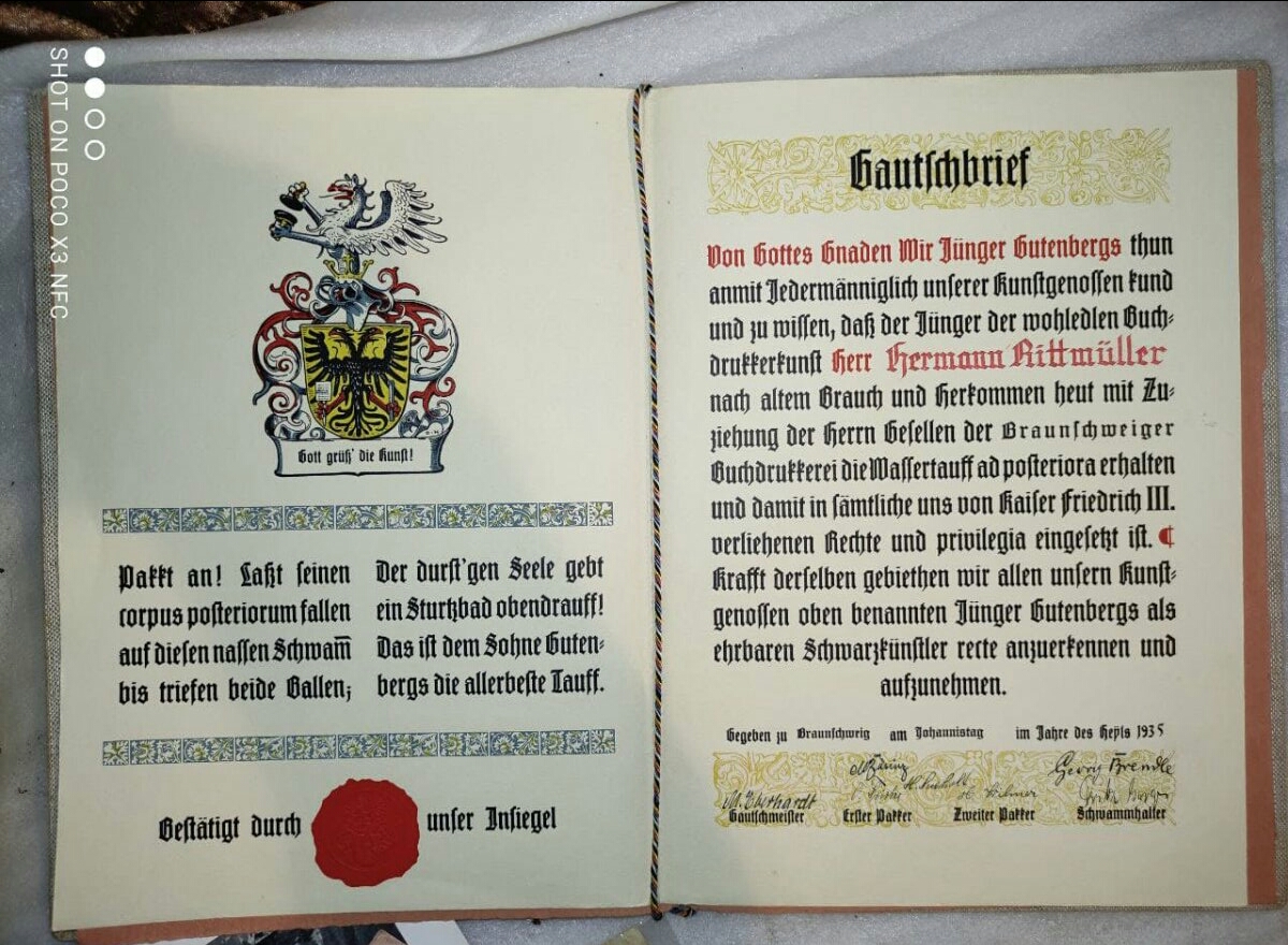 Добрый день! Читайте:https://www.google.com/search?sxsrf...IBhAC&cshid=1625638288892646&biw=1680&bih=907 Свидетельство о принятии в подмастерья (учеников мастеров-печатников). Gautschfest (гаучфест). Это старинный обычай посвящения в свою профессию, сохранившийся у книгопечатников в Германии (gautschen юж.-нем. = schaukeln, wiegen – качать, взвешивать). Подмастерье считается полноправным работником после того, как его «выкупают» одетым в чане или бадье с водой. После этой процедуры он получает свидетельство о присвоении звания мастера (der Gautschbrief) и должен всех угостить за свой счет пивом или другими напитками. С ув.!