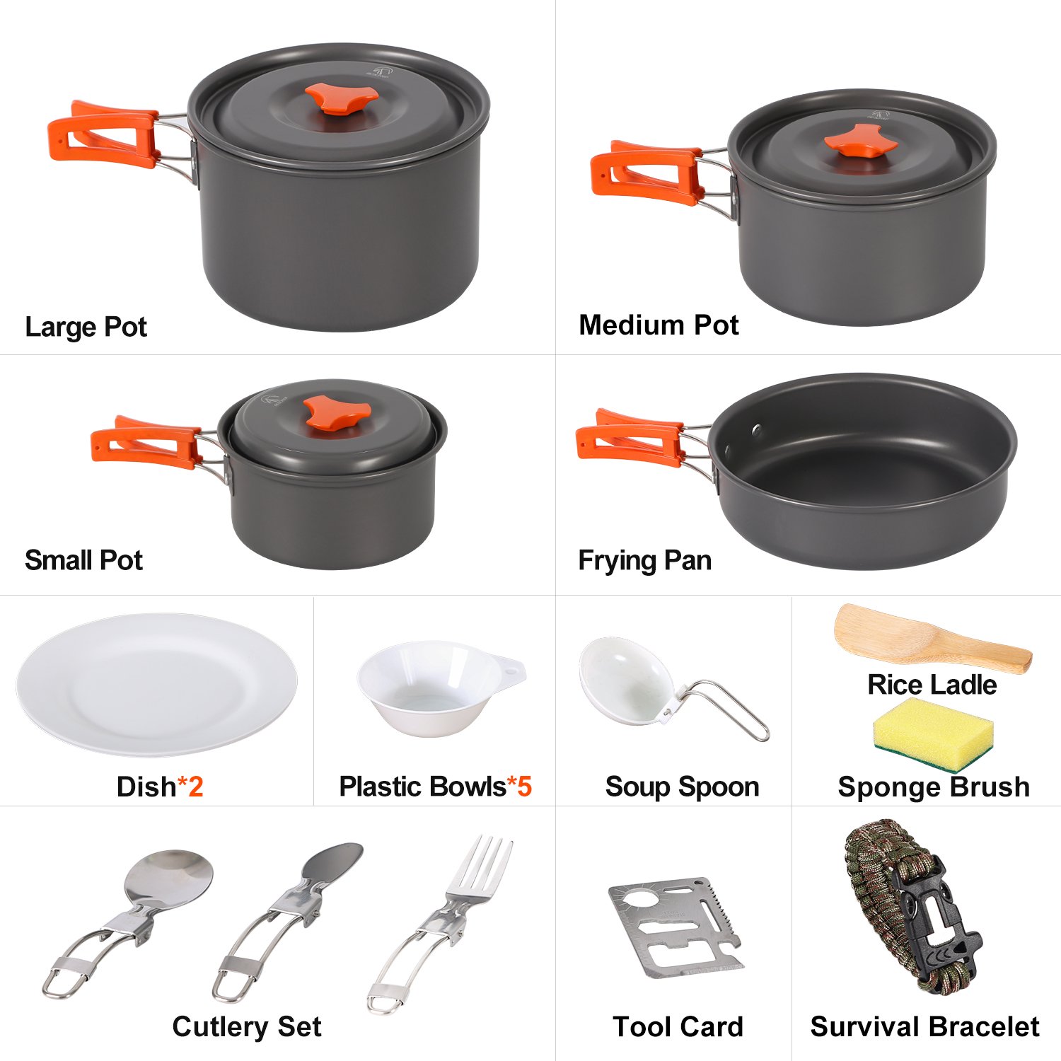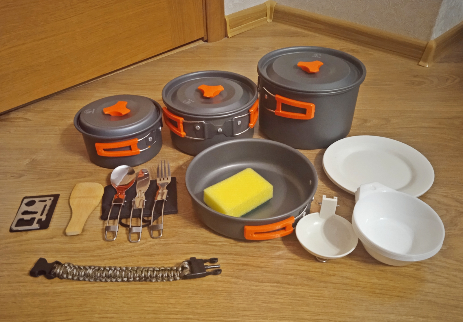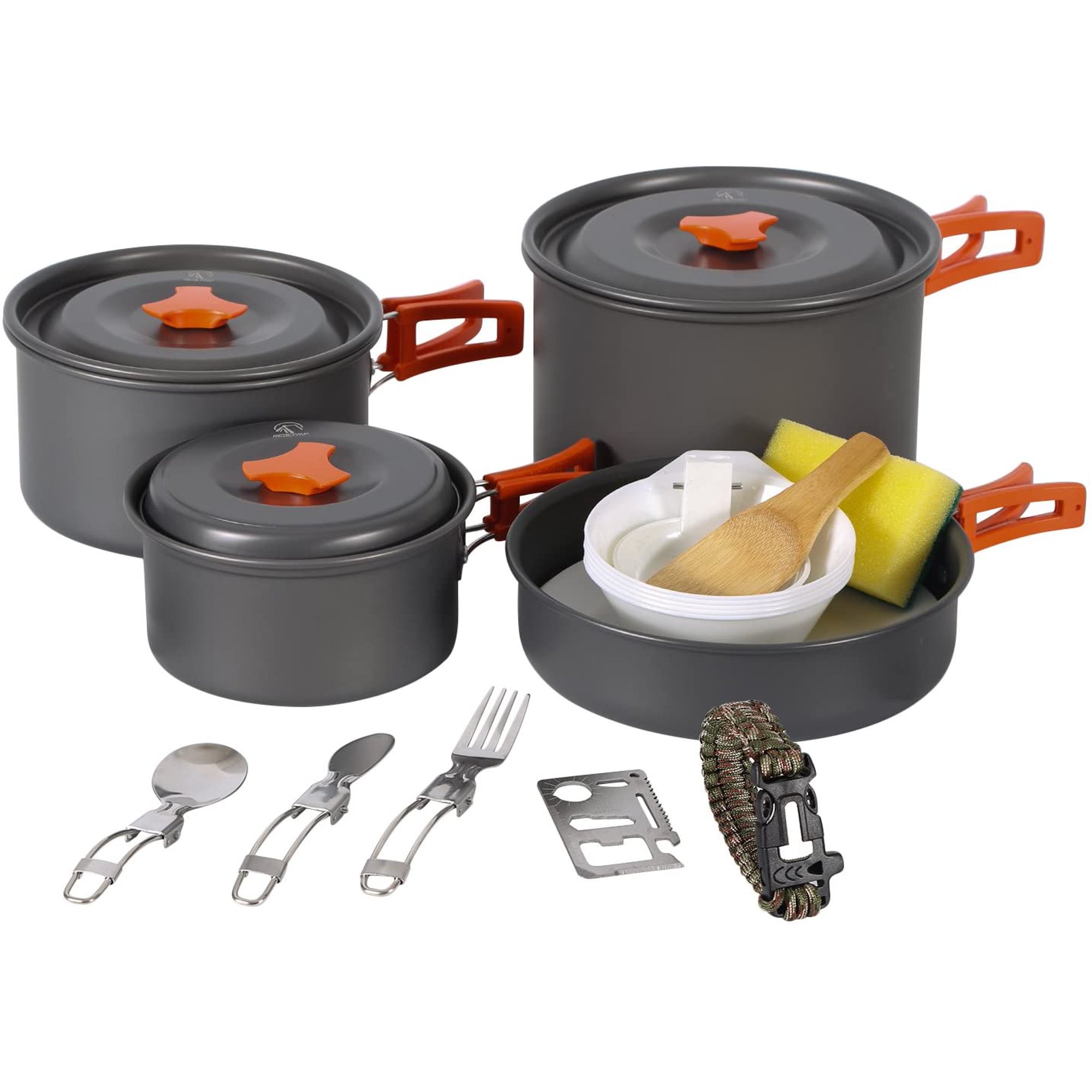 Набір туристичного посуду з 24 предметів RedCamp. Куплений в США. Новий Виготовлений з високоякісного анодованого алюмінію з антипригарним покриттям Вага 1.3 кг Містить 3 каструлі з кришками (1 л, 1.6 л, 2.6 л), 1 сковороду ( 18.5 см), 1 складний ковш, 1 ложку, 1 вилку, 1 ніж, 5 мисок, 2 тарілок, 1 лопатка, 1 браслет для виживання, 1 мультитул, 1 губку для чищення, 1 сумку Можна користуватись на відкритому вогні 2200 грн