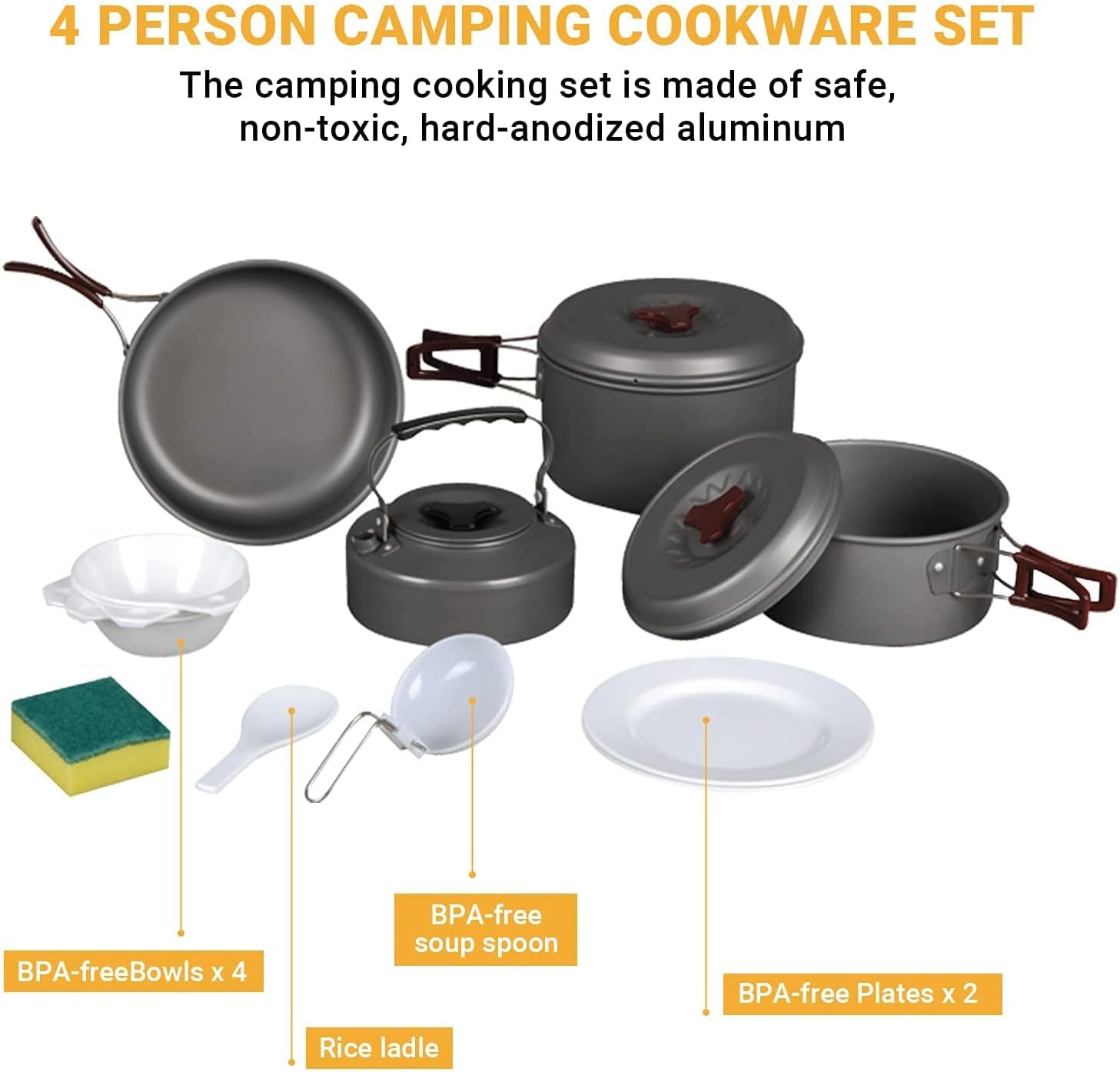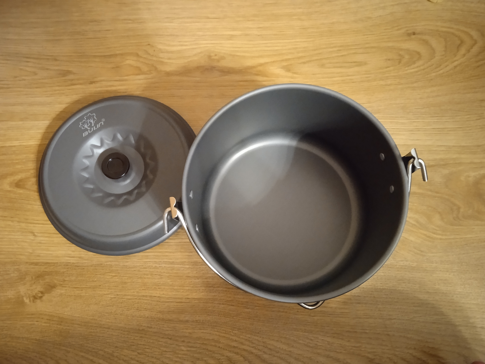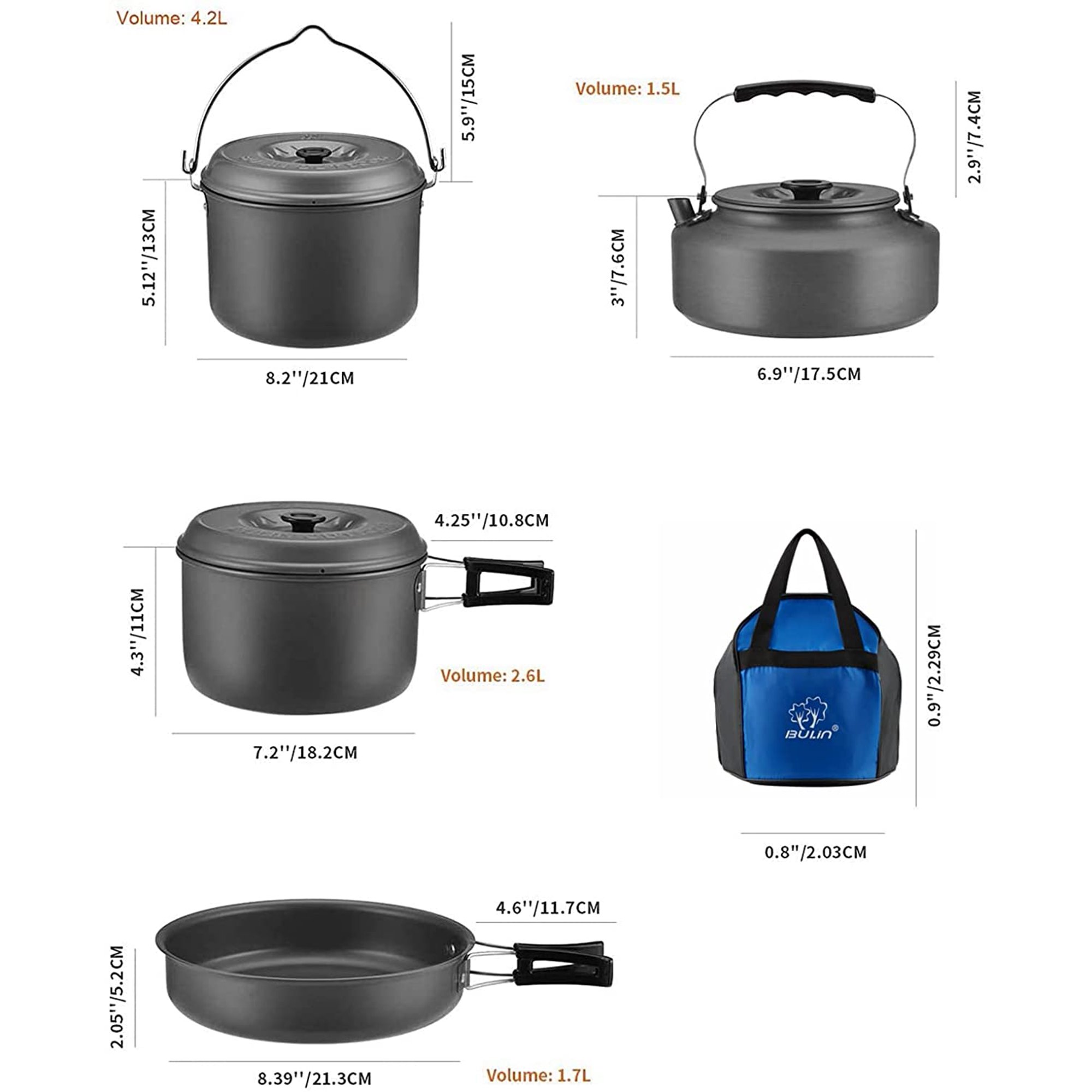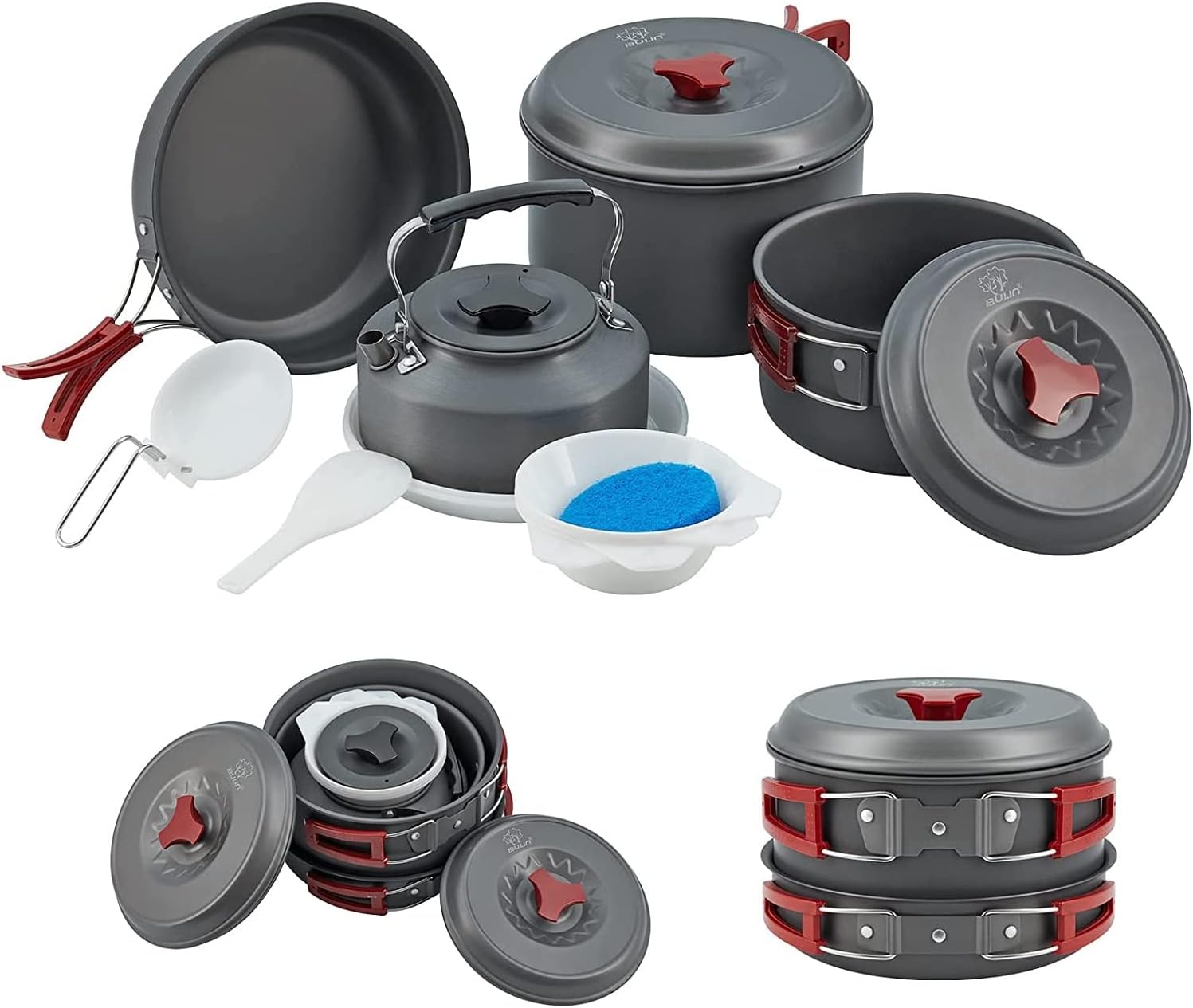 Набір туристичного посуду з 17 предметів Bulin. Куплений в США. Новий Виготовлений з високоякісного анодованого алюмінію з антипригарним покриттям Містить 2 каструлі з кришками (1.6 л, 2.6 л), 1 сковороду (29.5 см, 1.3 л), 1 чайник (1 л), 1 складний ковш, 1 ложку, 4 миски, 2 тарілки і 1 губку для чищення, 1 сумку Можна користуватись на відкритому вогні продано