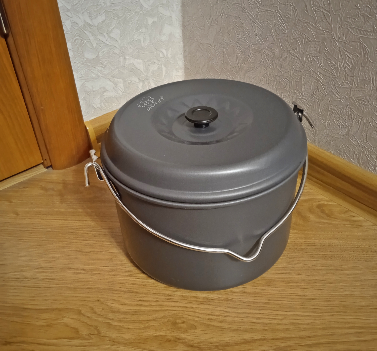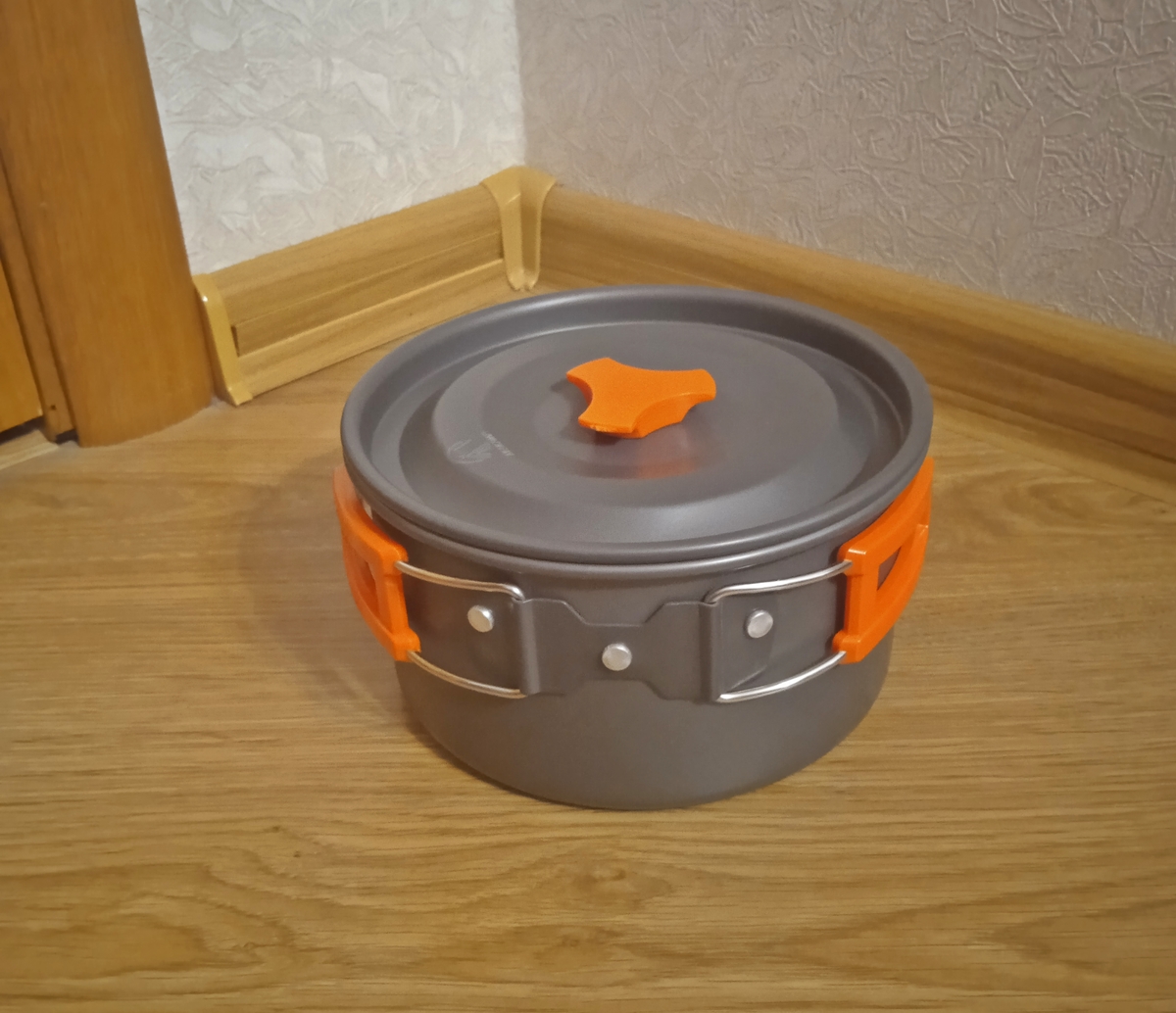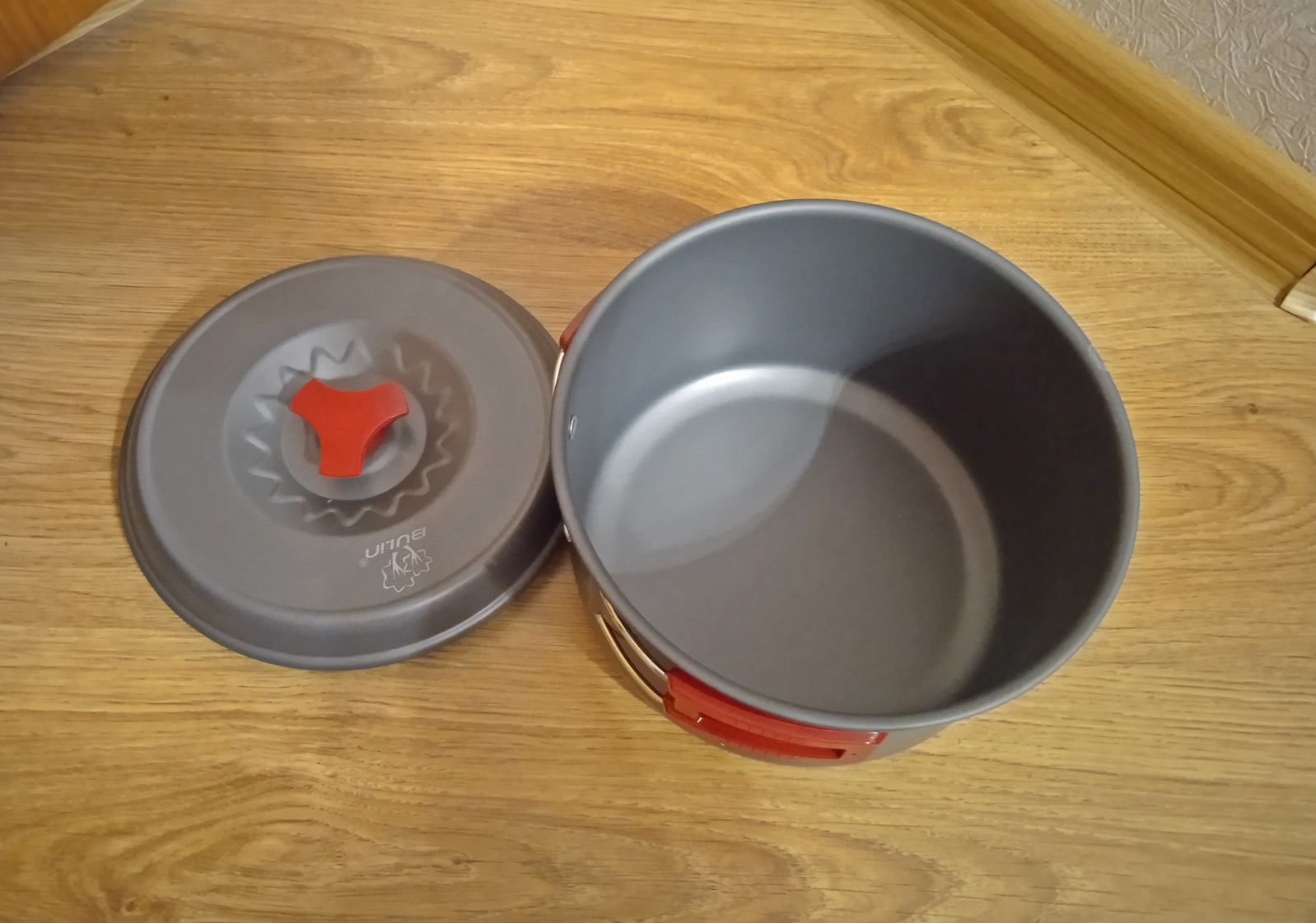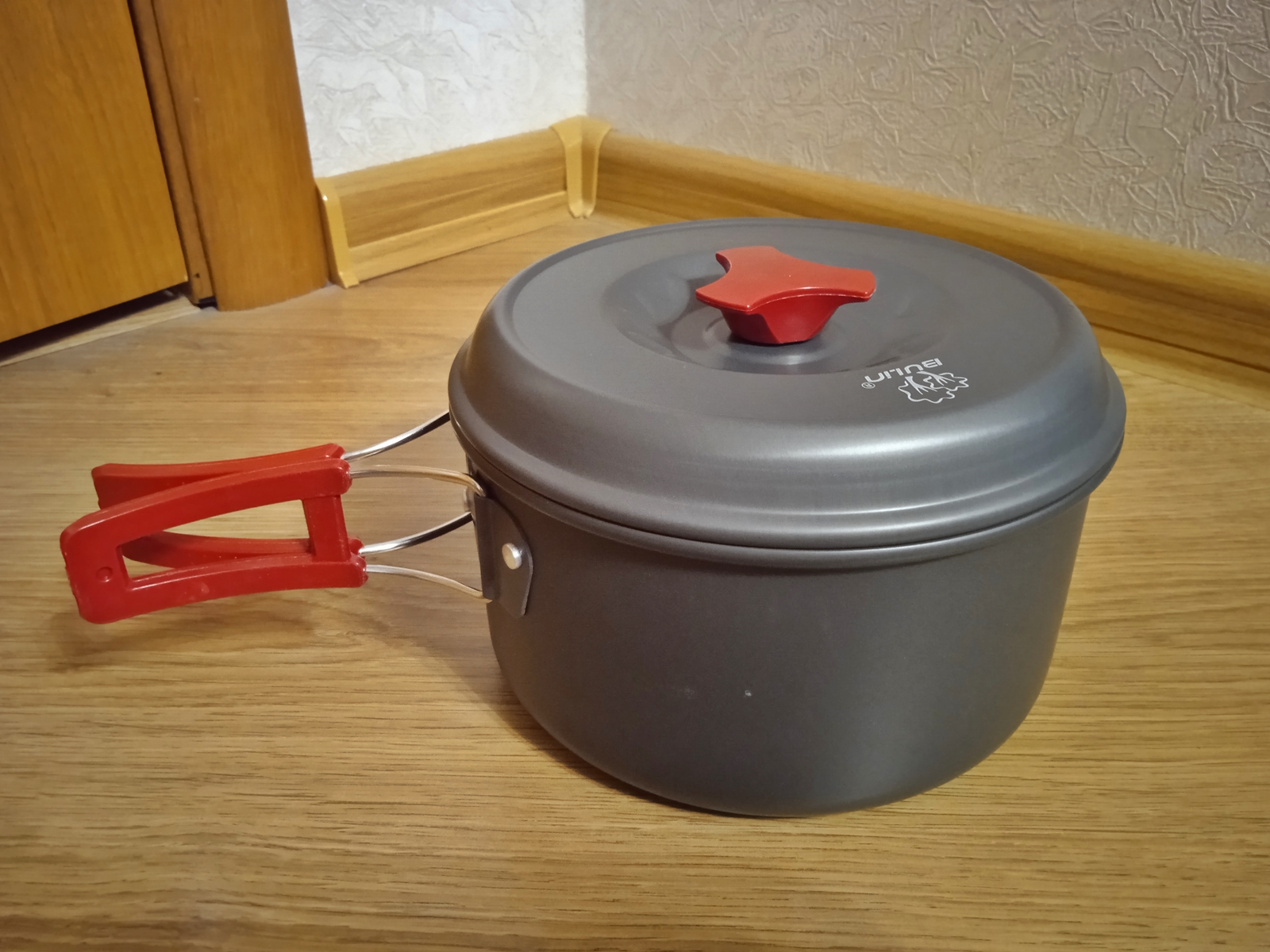 Набір туристичного посуду з 17 предметів Bulin. Куплений в США. Новий Виготовлений з високоякісного анодованого алюмінію з антипригарним покриттям Містить 2 каструлі з кришками (1.6 л, 2.6 л), 1 сковороду (29.5 см, 1.3 л), 1 чайник (1 л), 1 складний ковш, 1 ложку, 4 миски, 2 тарілки і 1 губку для чищення, 1 сумку Можна користуватись на відкритому вогні продано