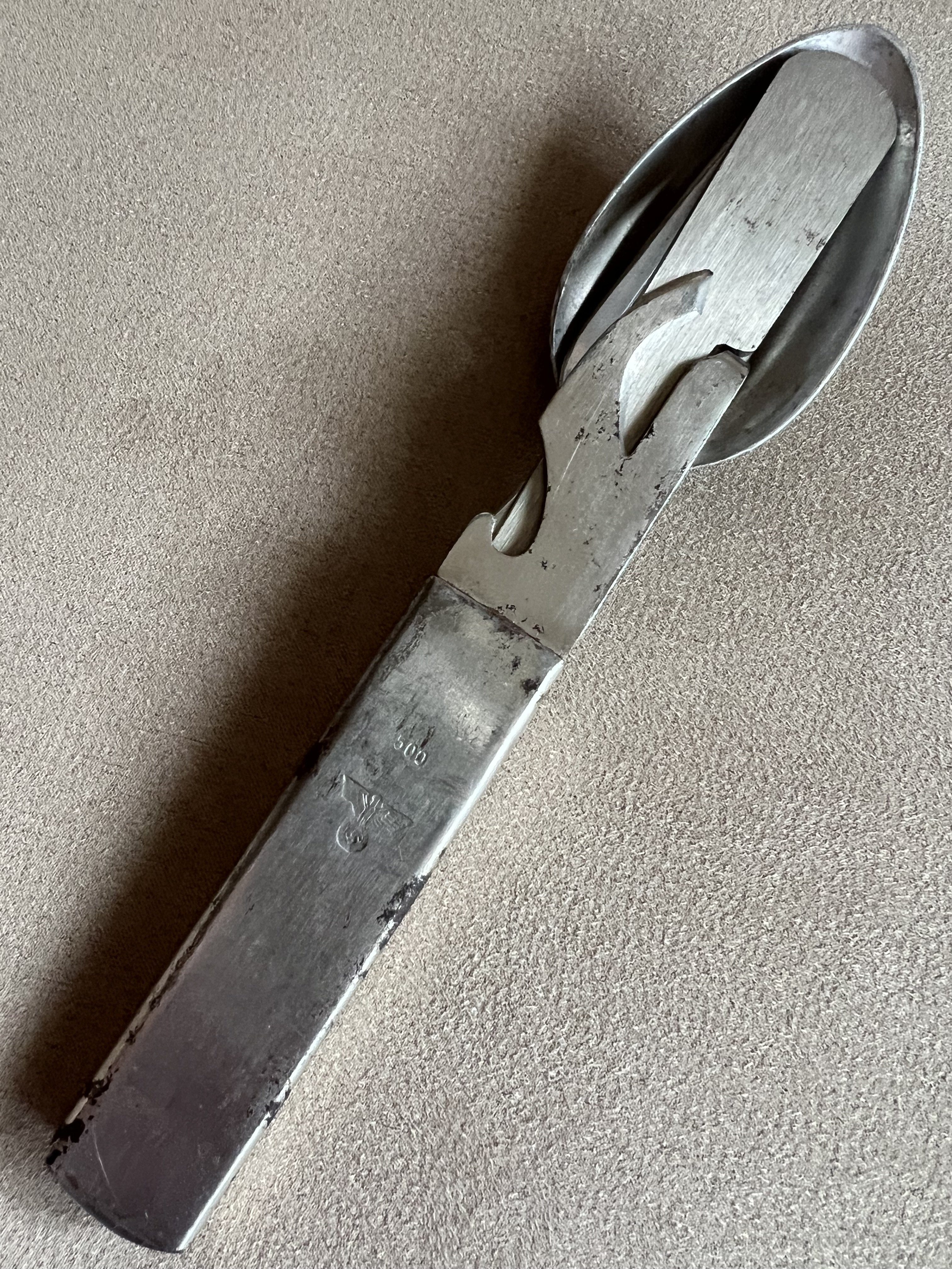 Приветствую, вот ложка с набора без куры поднята на Никопольском Плацдарме по 43 году. На форумах в продаже встречал такую вилку и отккрывачку. Когда набор на курях и не сборняк и не убитый то будет 150-200 уе стоить. Такой как Роман выставил на обсуждение думаю 1000 - 1500 грн.