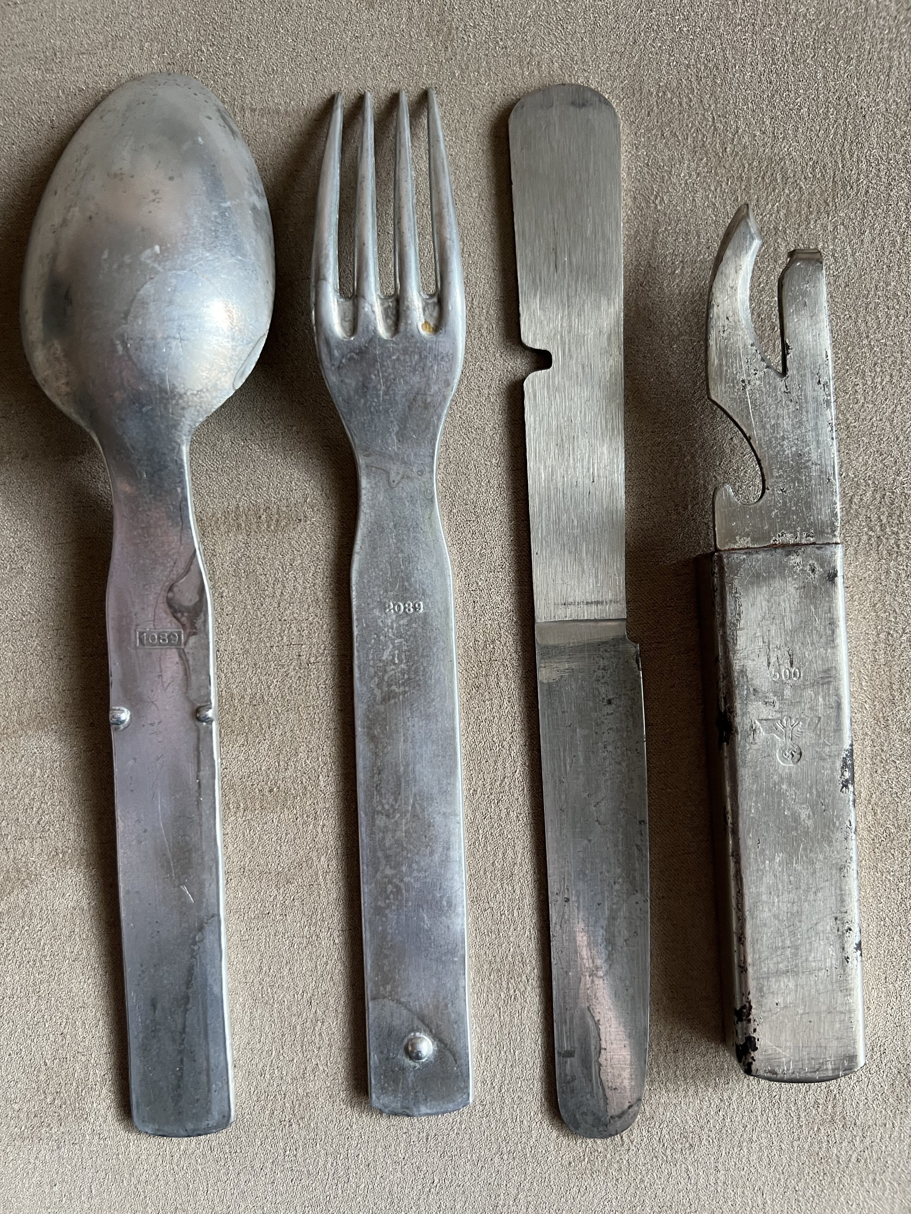 Таки да. Известно, что после 43го клейма производителя заменяли циферными обозначения. Однако наряду с цифрами присутствовали и куры...тут же нету. Я лично таких(поздних, но без кур) не встречал. Предположу, что предметы совсем уже под конец войны. Однако дела не меняет. Покупателям, как показывает практика, нужны куры)) Думаю до 100 у.е. стоит набор при условии того, что был изготовлен до 45го....и то для тех кто в теме.