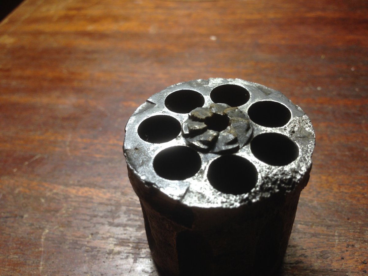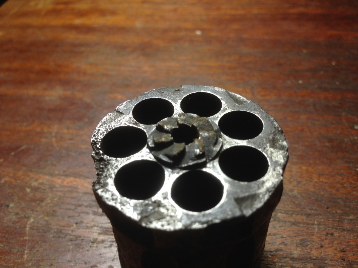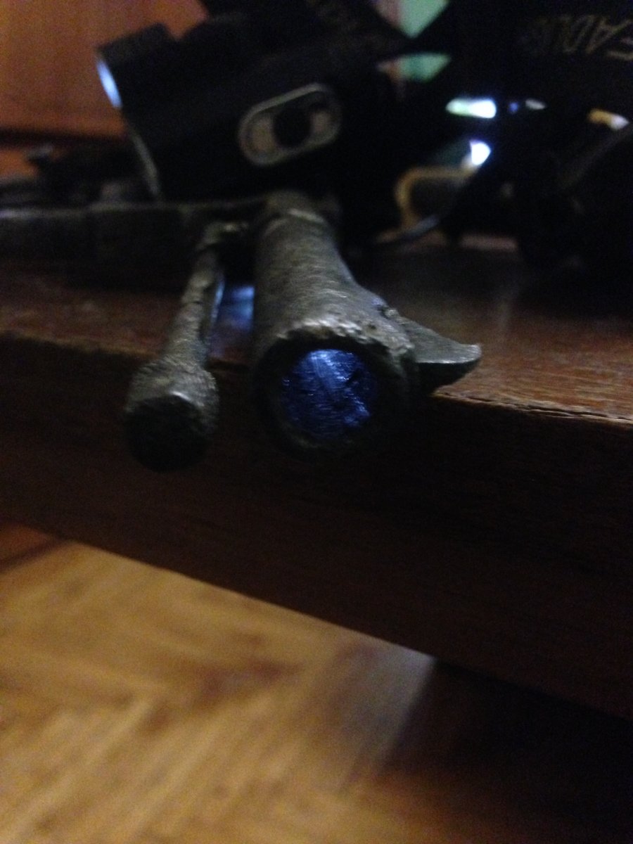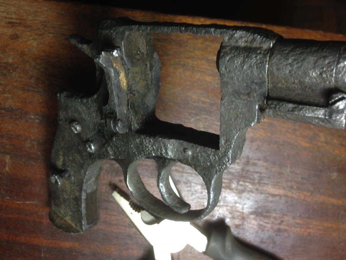 Попався ось такий наган викопаний з болота. Не бачив жодних кислот, напильників та шліфувальних шкірок. Тільки багато вд-шки, терпіння та кропіткої праці м"ягкою щіткою. Був знайдений без осі барабану з витягненим шомполом. По факту виглядає багато краще ніж на фото, залишки номеру та клейм та рідного вороніння. В барабані були стріляні гільзи. Комори та храповик в ідеальному стані, барабан має залишки рідного вороніння, проте в одному місці бажано капнути напівавтоматом. Ствол з торця на глибину 3-5мм. був забитий глиною, не чистився, проте нарізи чітко виражені (після правильної чистки буде дзеркало. УСМ нерухомий. З метою нестворення вогнепалу кришка не знімалась та мною не буде зніматись, УСМ чиститись та розрухуватись також не буде (як і чиститись ствол). Судячи з зовнішнього стану храповика, спускового гачка, курка та дверки барабану всередині також має бути все ОК.